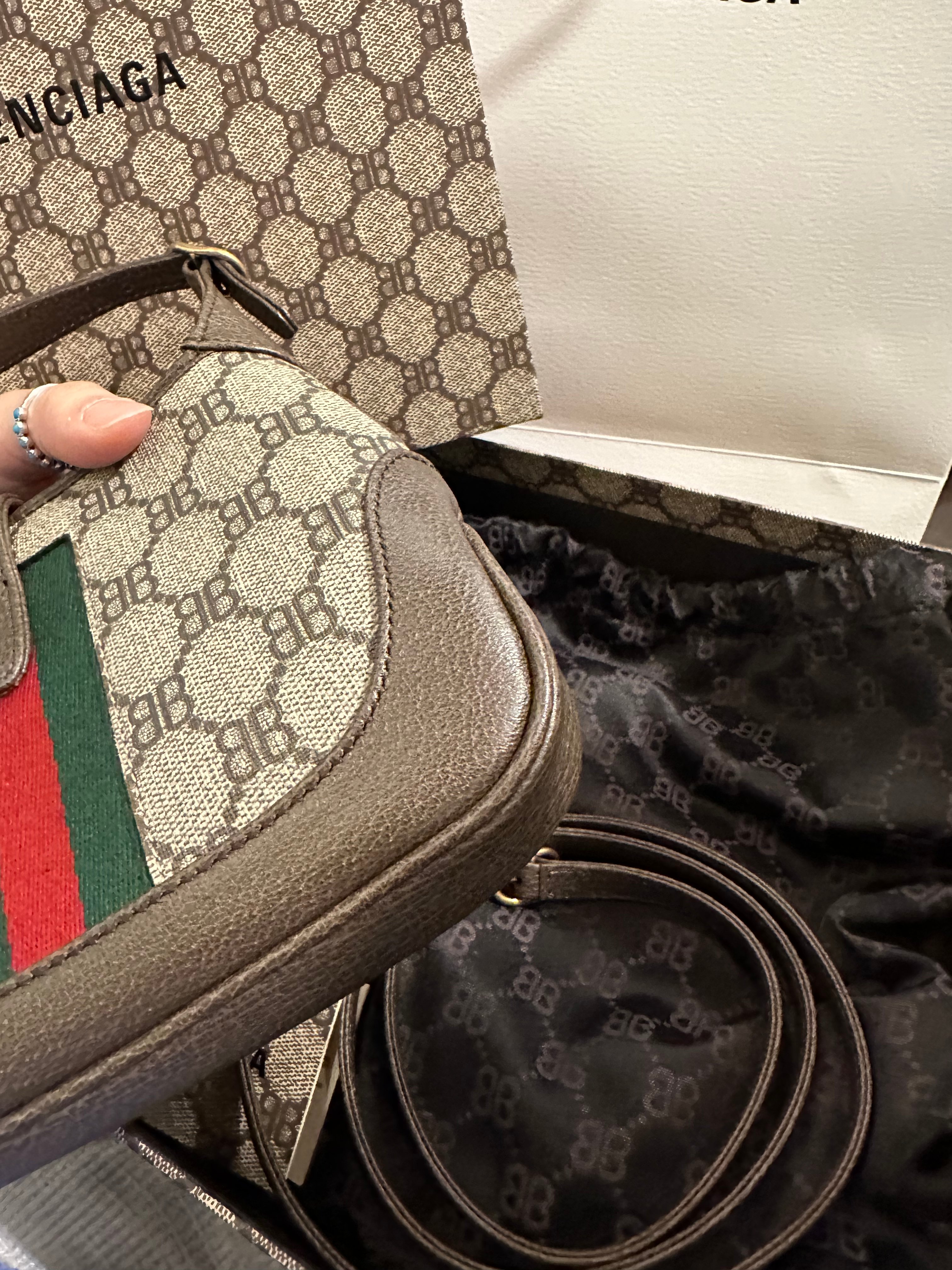 全新 100%new 全新 balcnciaga x gucci mini jackie brown bag Not vintage 係2021年秋冬聯名推出的 ☑️麈袋☑️盒☑️原裝長帶 閑置接近全新 勁可愛可以當handbag用都得或者加返條原裝長帶上去就立即可crossbody 男女都啱用可以尺寸岩岩好放到iphonePro仲可以放到其他嘢:3 原價2xxxx 全新100%new 未使用品Balenciaga x gucci mini brown jackie bag 配件:麈袋/盒/原裝長帶 狀態:全新 Dimensions:19x13x3cm New Balenciaga x gucci mini jackie brown Accessories: box/dust bag /original adjustable strap Dimensions:19x13x3cm Condition: brand new