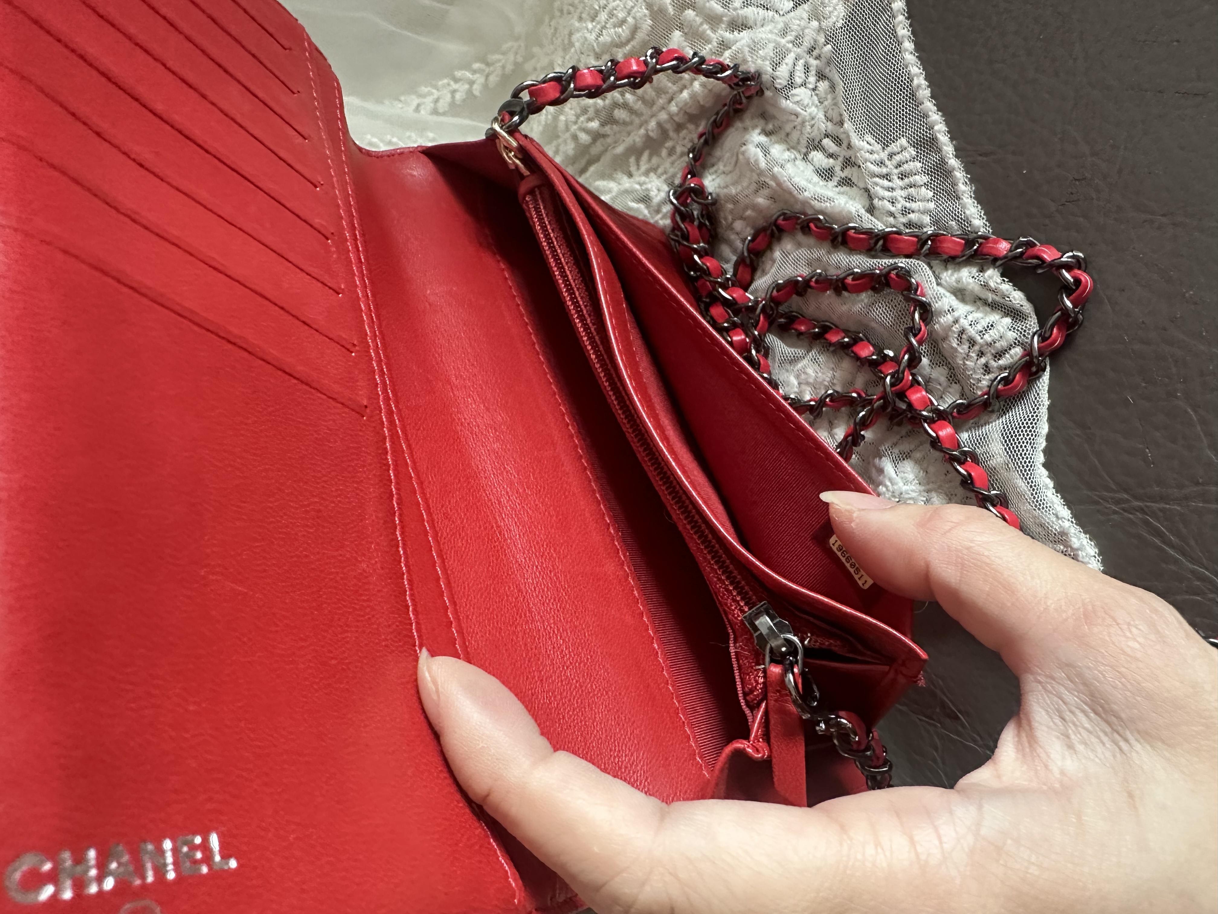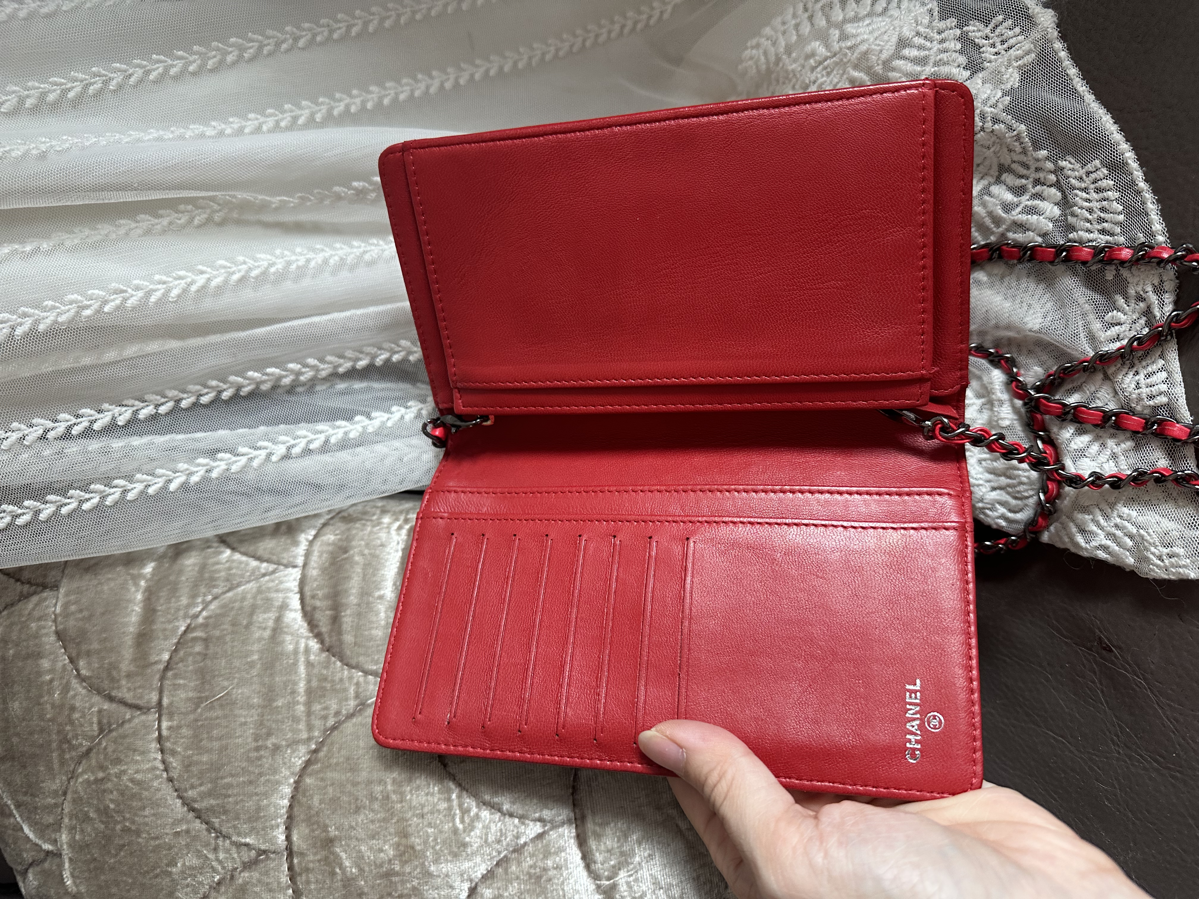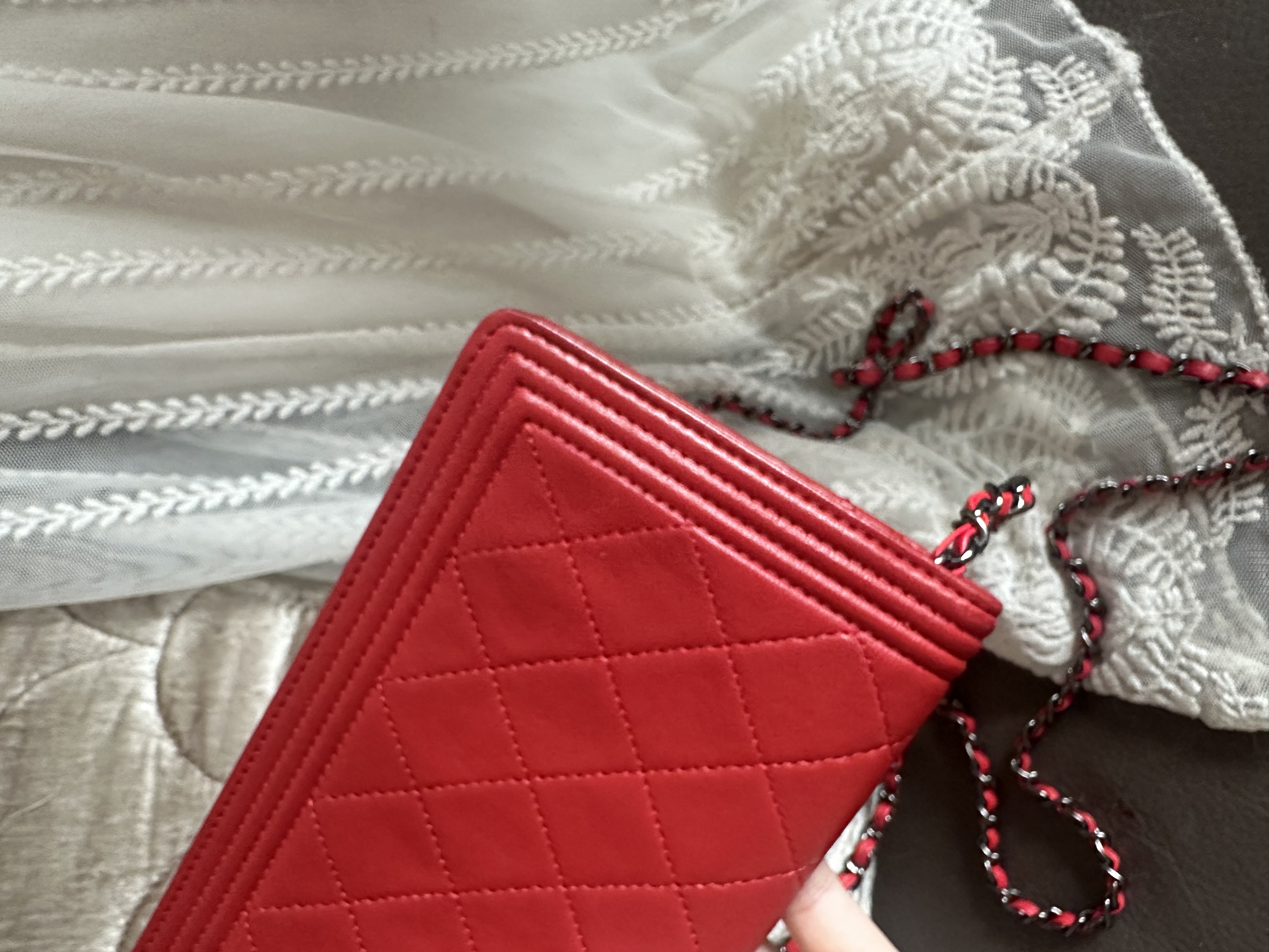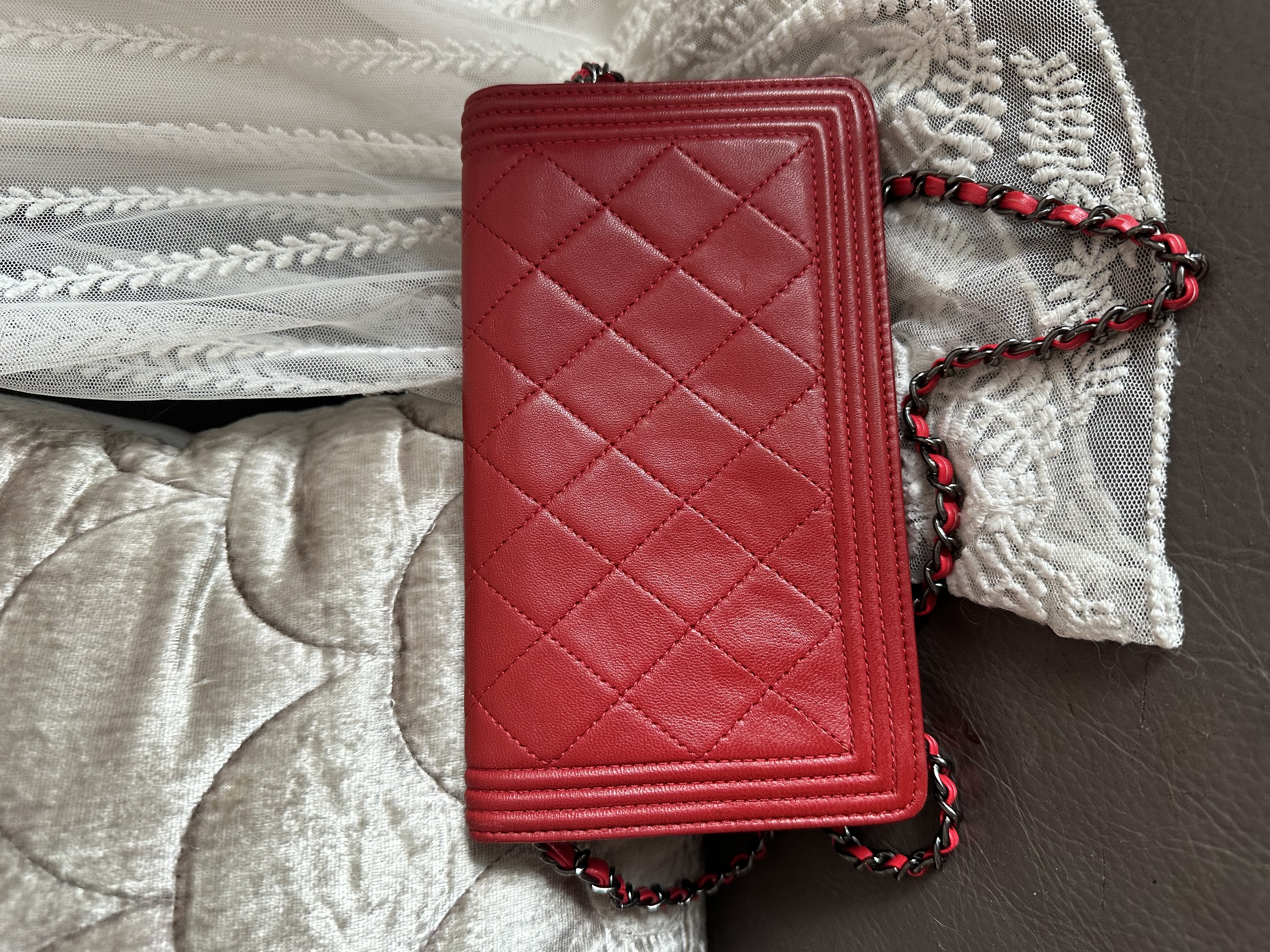 改裝款 cc紅色boy長銀包❤️😆😆發財紅正啊吸財🔥 勁新淨19字頭有貼貼數字清晰可見♥️ 改裝的 🌸原裝冇鏈❤️ 免費安裝埋可變Woc扣同沒品牌長鏈俾你加上去當woc用 (安裝不傷皮革可隨意拆除) 極級平2999帶走🔥 美品chanel red boy long wallet 配件:貼 免費改裝成袋用扣/沒品牌長鏈一條(見尾圖) Item has been modified, free non branded chain/non brand hook (see photo ) (以上是免費贈送原裝並沒有全部可隨意拆除不傷皮革) 尺寸:19x10x2cm 年份:2014 狀態:外觀95新/内95新 chanel red boy long wallet Accessories :authenticity sticker Item has been modified, free non branded chain/non brand hook (see photo ) Dimensions :19x10x2cm Year:2014 Condition :excellent