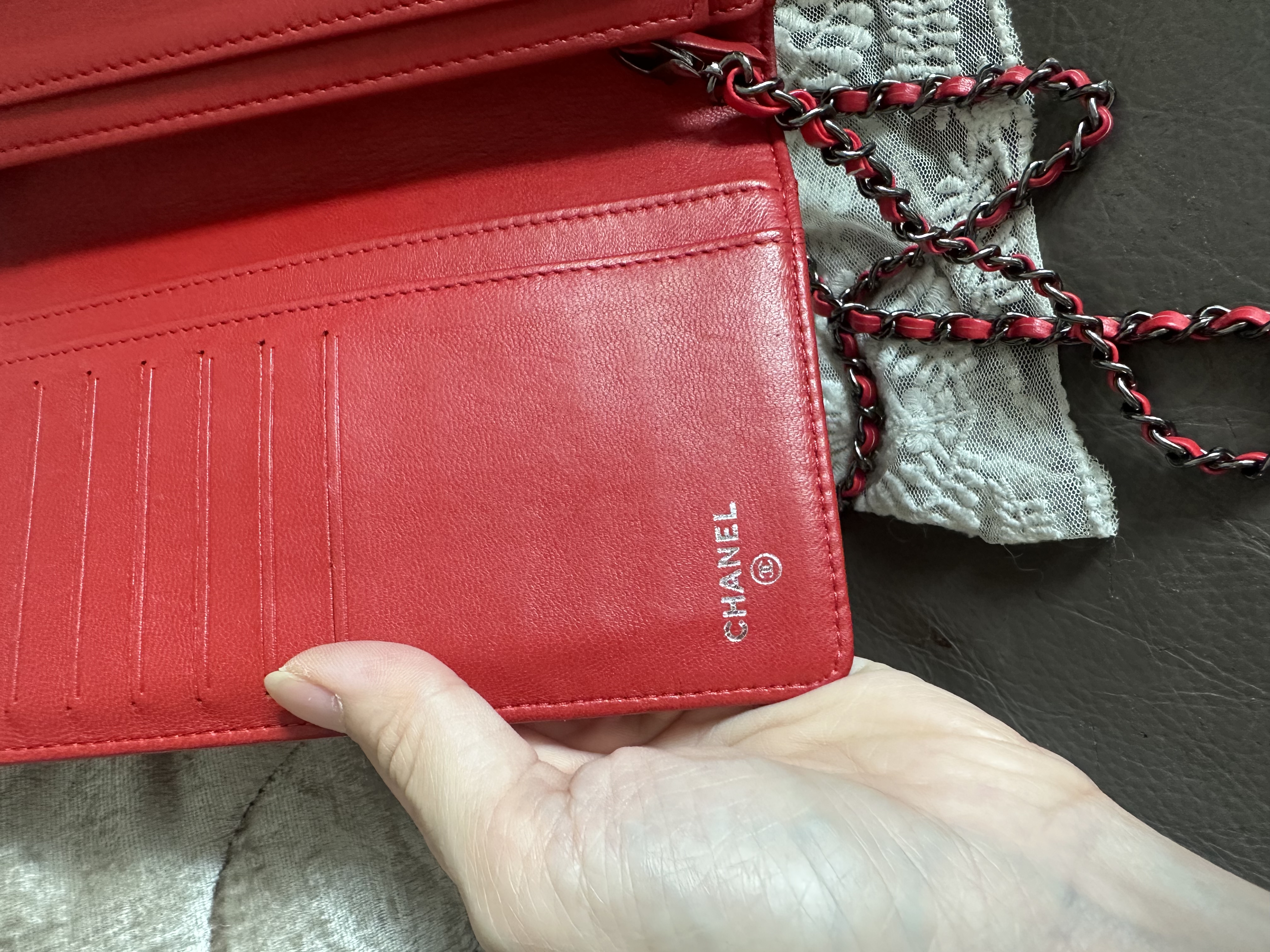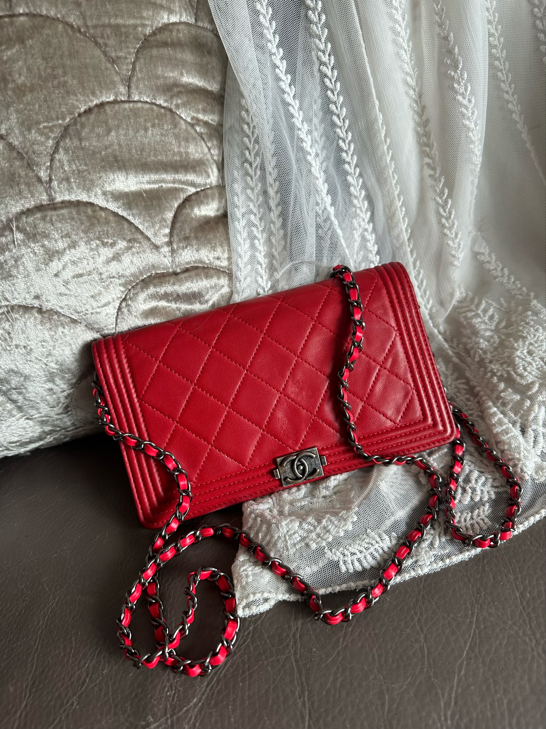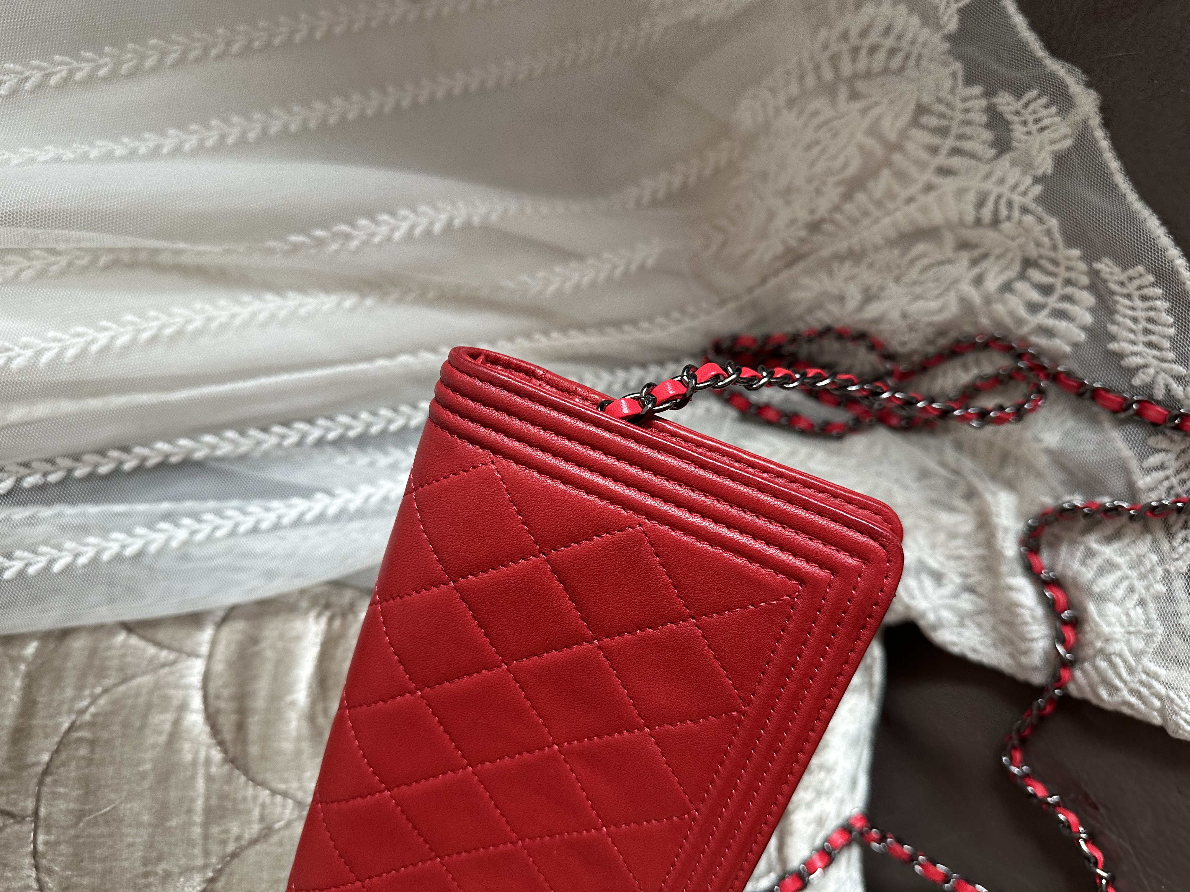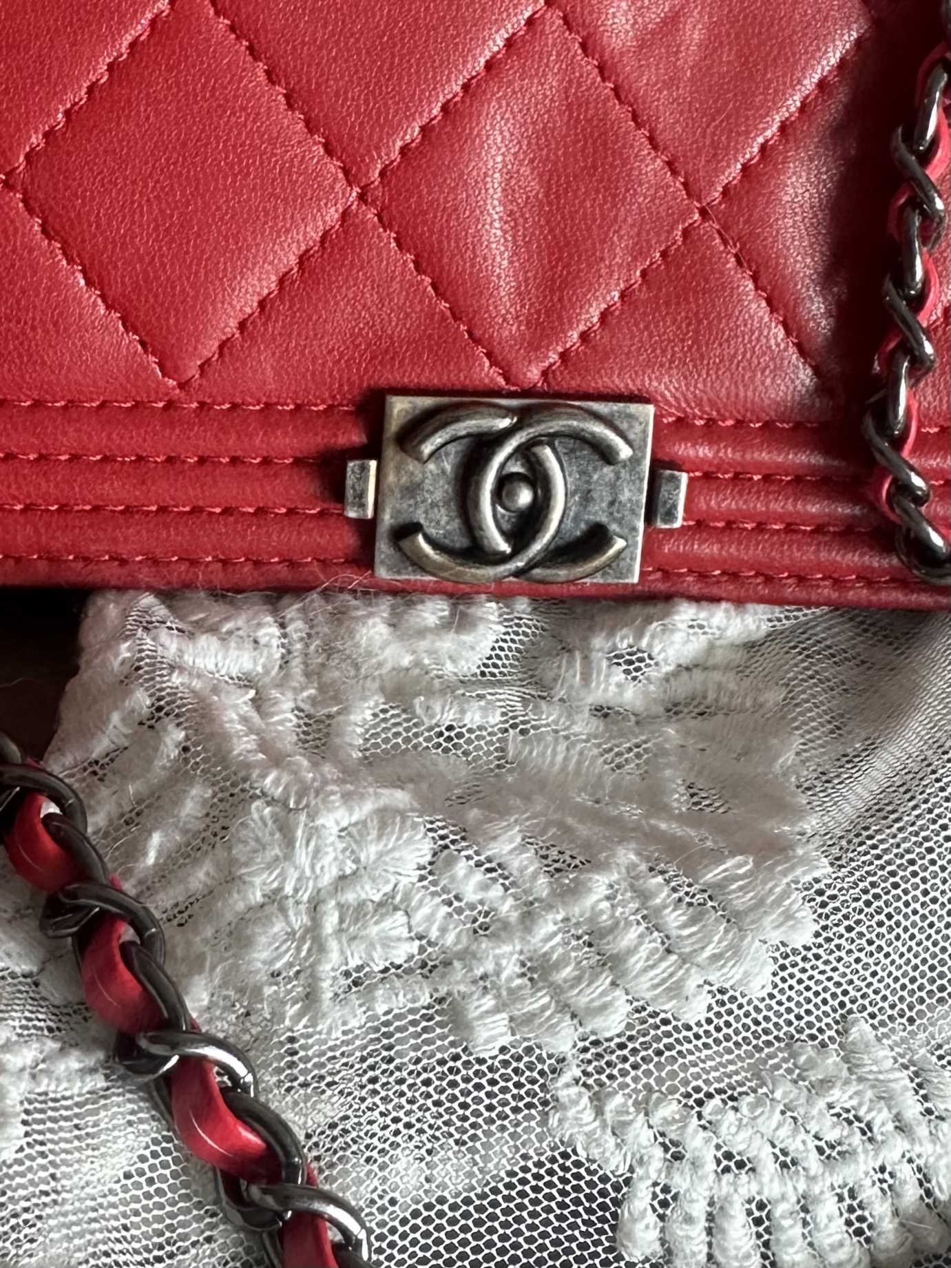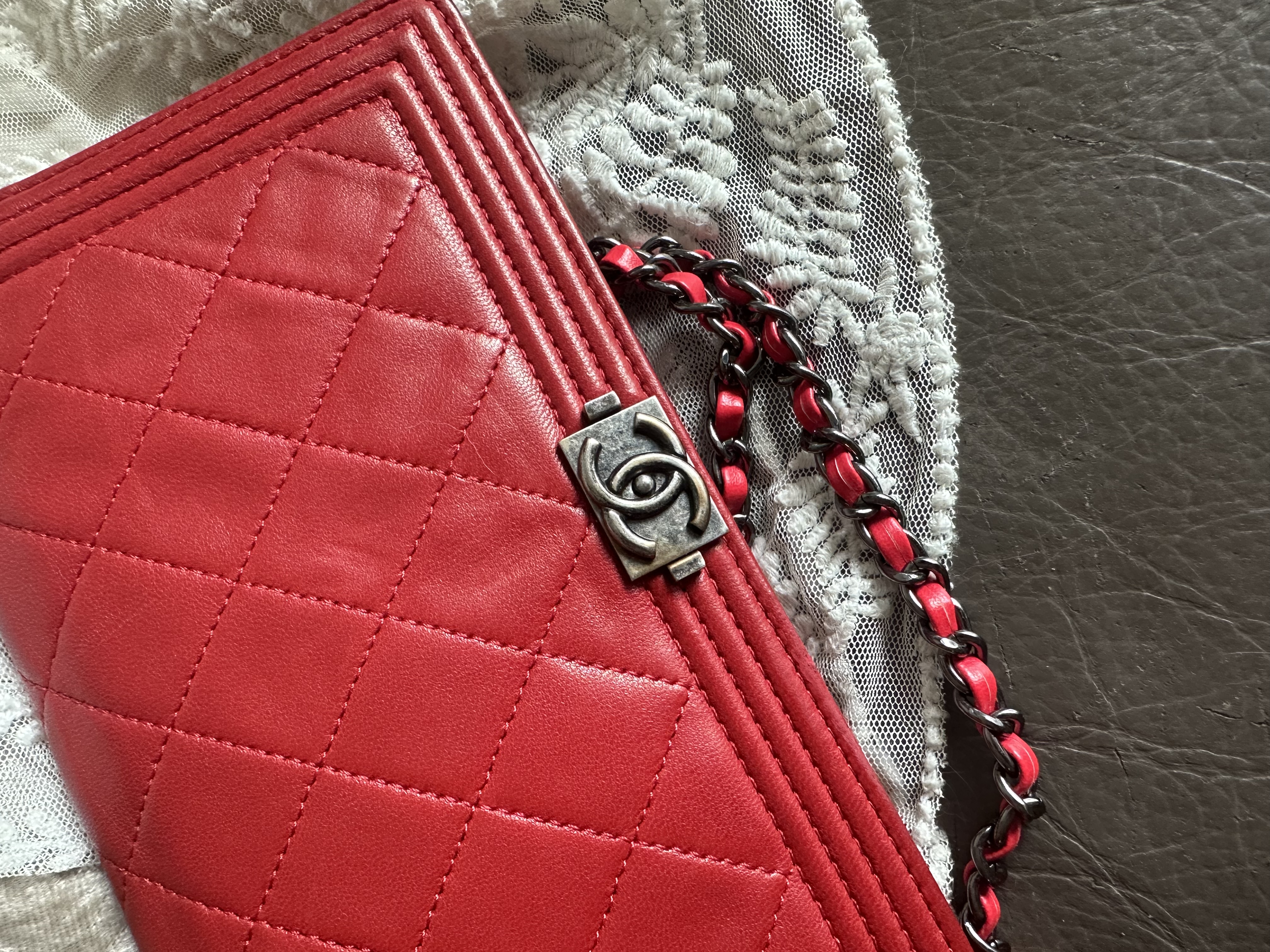 改裝款 cc紅色boy長銀包❤️😆😆發財紅正啊吸財🔥 勁新淨19字頭有貼貼數字清晰可見♥️ 改裝的 🌸原裝冇鏈❤️ 免費安裝埋可變Woc扣同沒品牌長鏈俾你加上去當woc用 (安裝不傷皮革可隨意拆除) 極級平2999帶走🔥 美品chanel red boy long wallet 配件:貼 免費改裝成袋用扣/沒品牌長鏈一條(見尾圖) Item has been modified, free non branded chain/non brand hook (see photo ) (以上是免費贈送原裝並沒有全部可隨意拆除不傷皮革) 尺寸:19x10x2cm 年份:2014 狀態:外觀95新/内95新 chanel red boy long wallet Accessories :authenticity sticker Item has been modified, free non branded chain/non brand hook (see photo ) Dimensions :19x10x2cm Year:2014 Condition :excellent