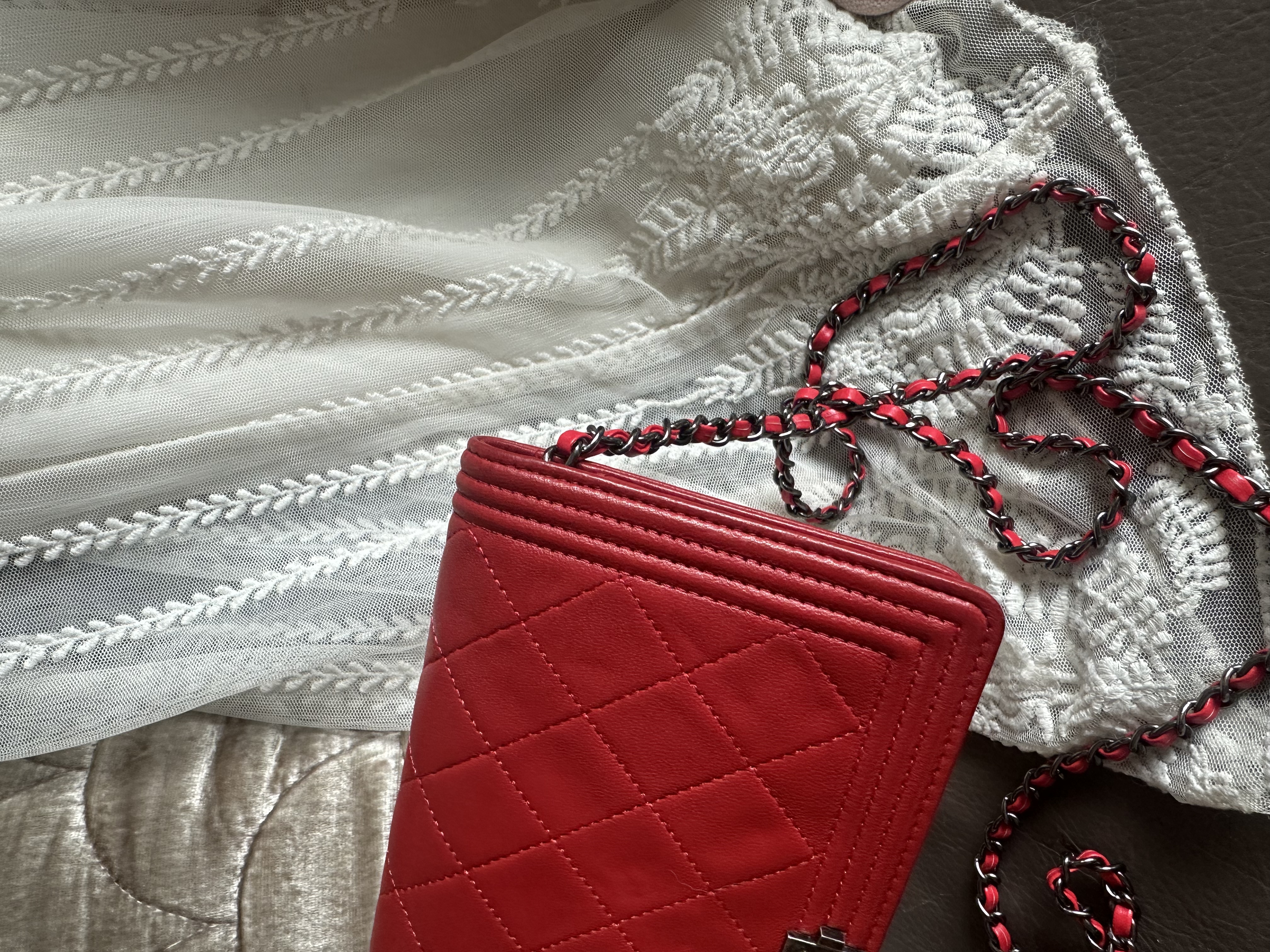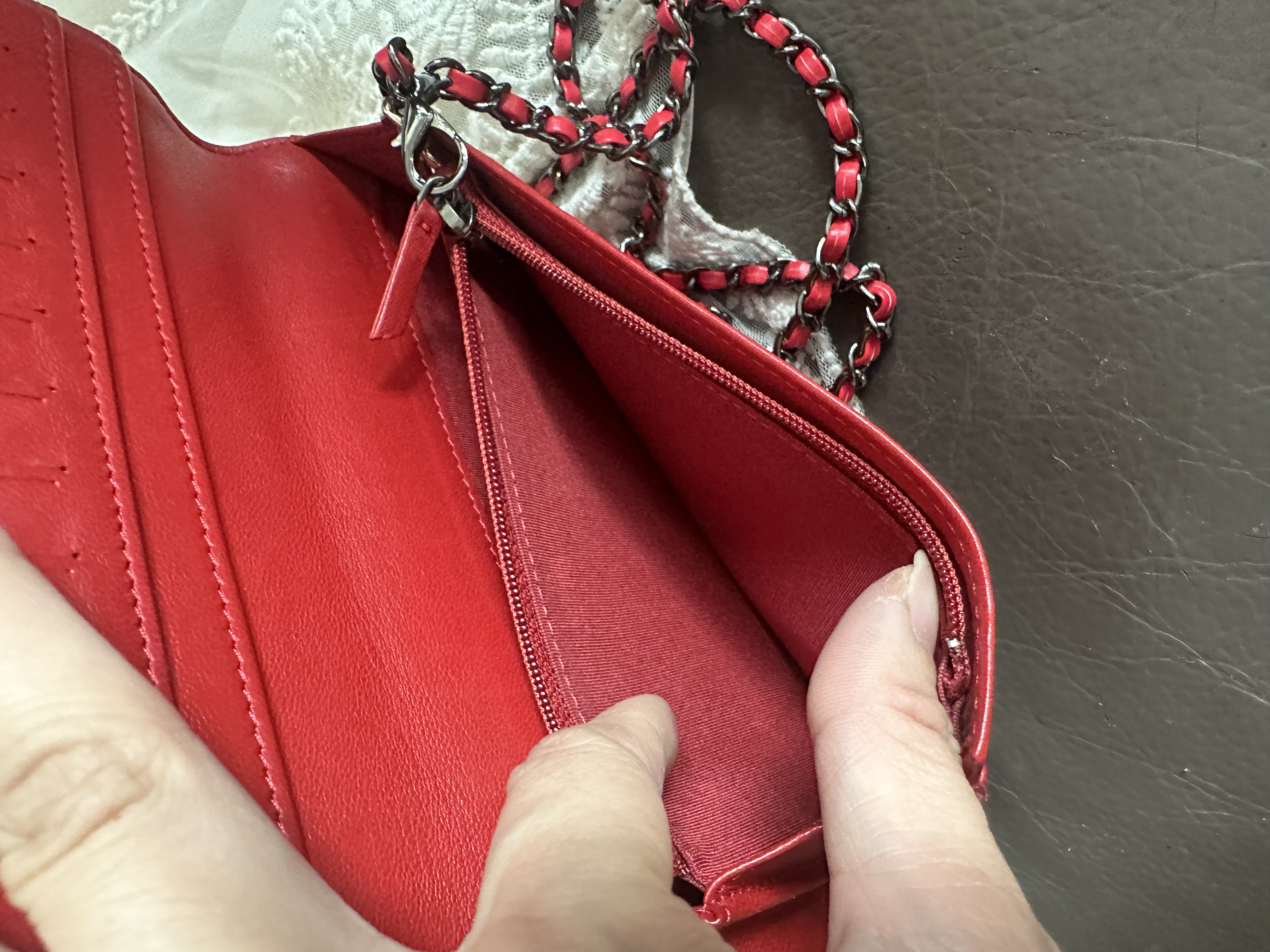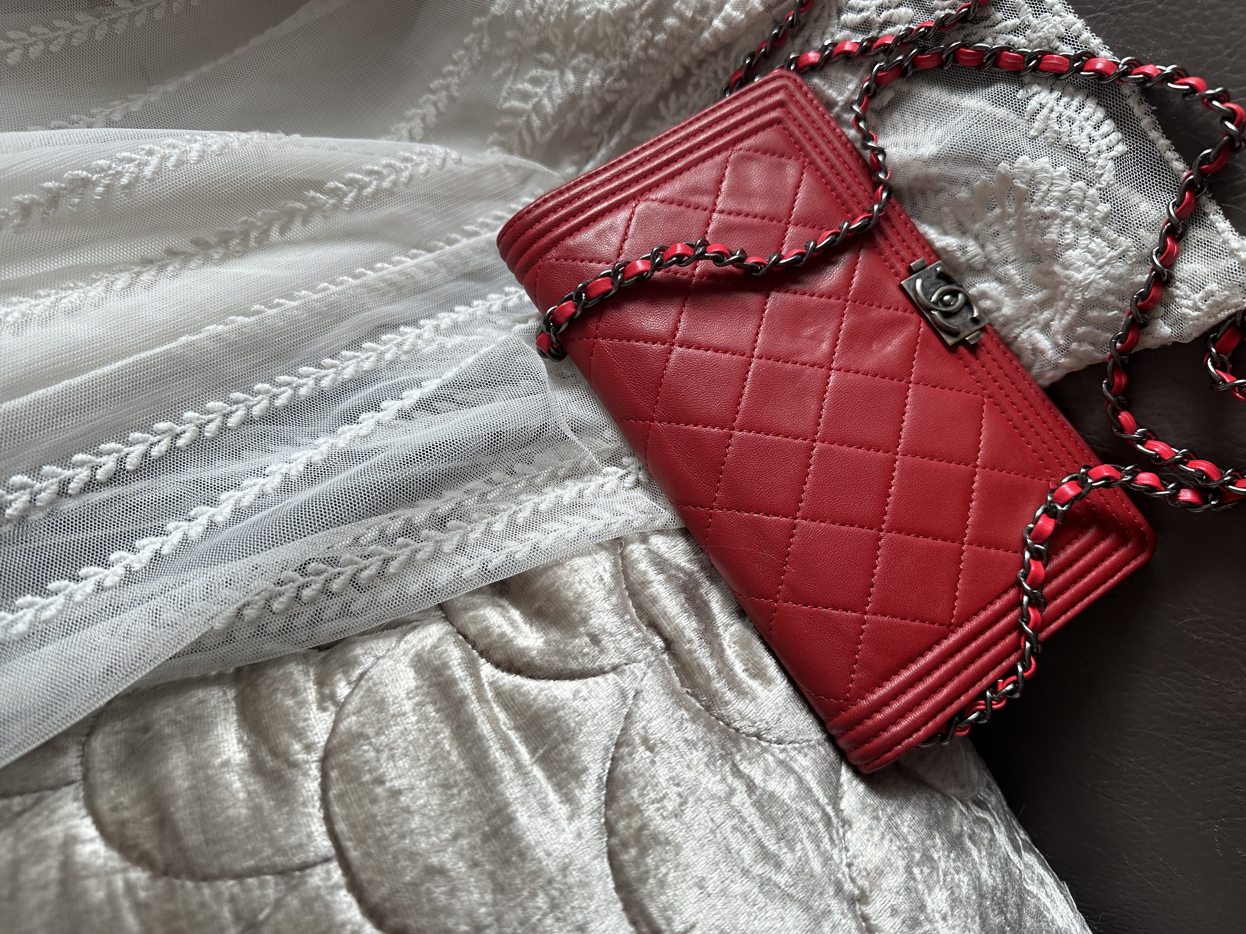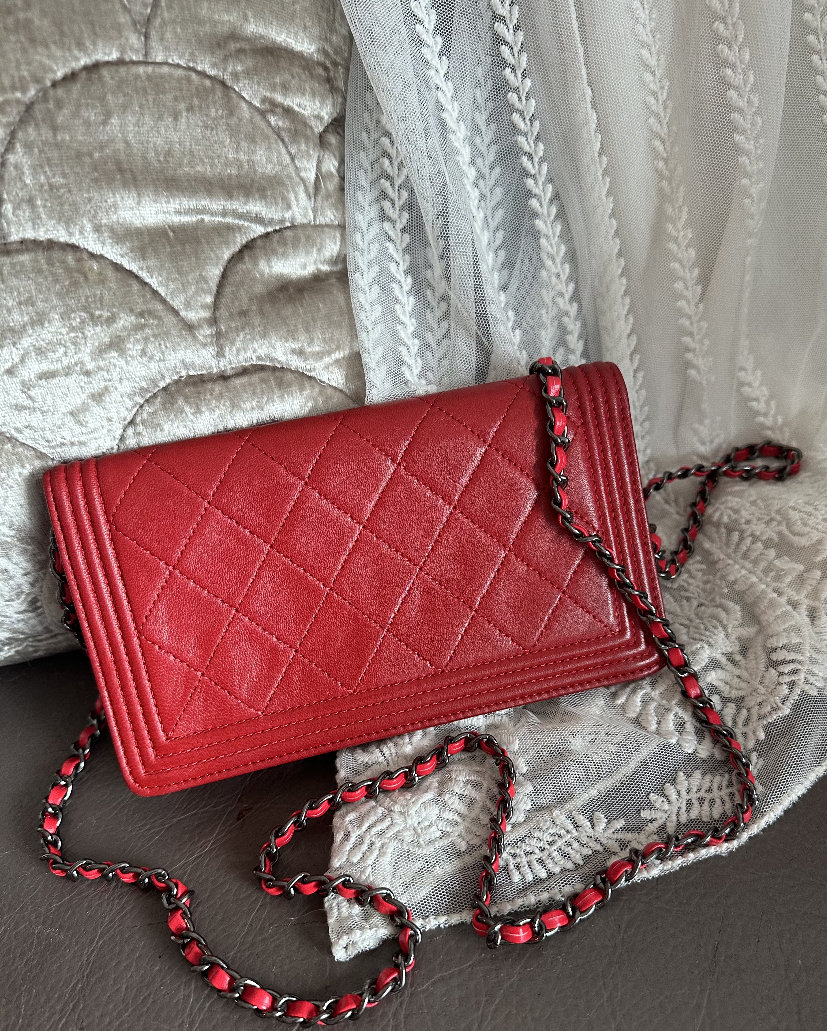 改裝款 cc紅色boy長銀包❤️😆😆發財紅正啊吸財🔥 勁新淨19字頭有貼貼數字清晰可見♥️ 改裝的 🌸原裝冇鏈❤️ 免費安裝埋可變Woc扣同沒品牌長鏈俾你加上去當woc用 (安裝不傷皮革可隨意拆除) 極級平2999帶走🔥 美品chanel red boy long wallet 配件:貼 免費改裝成袋用扣/沒品牌長鏈一條(見尾圖) Item has been modified, free non branded chain/non brand hook (see photo ) (以上是免費贈送原裝並沒有全部可隨意拆除不傷皮革) 尺寸:19x10x2cm 年份:2014 狀態:外觀95新/内95新 chanel red boy long wallet Accessories :authenticity sticker Item has been modified, free non branded chain/non brand hook (see photo ) Dimensions :19x10x2cm Year:2014 Condition :excellent