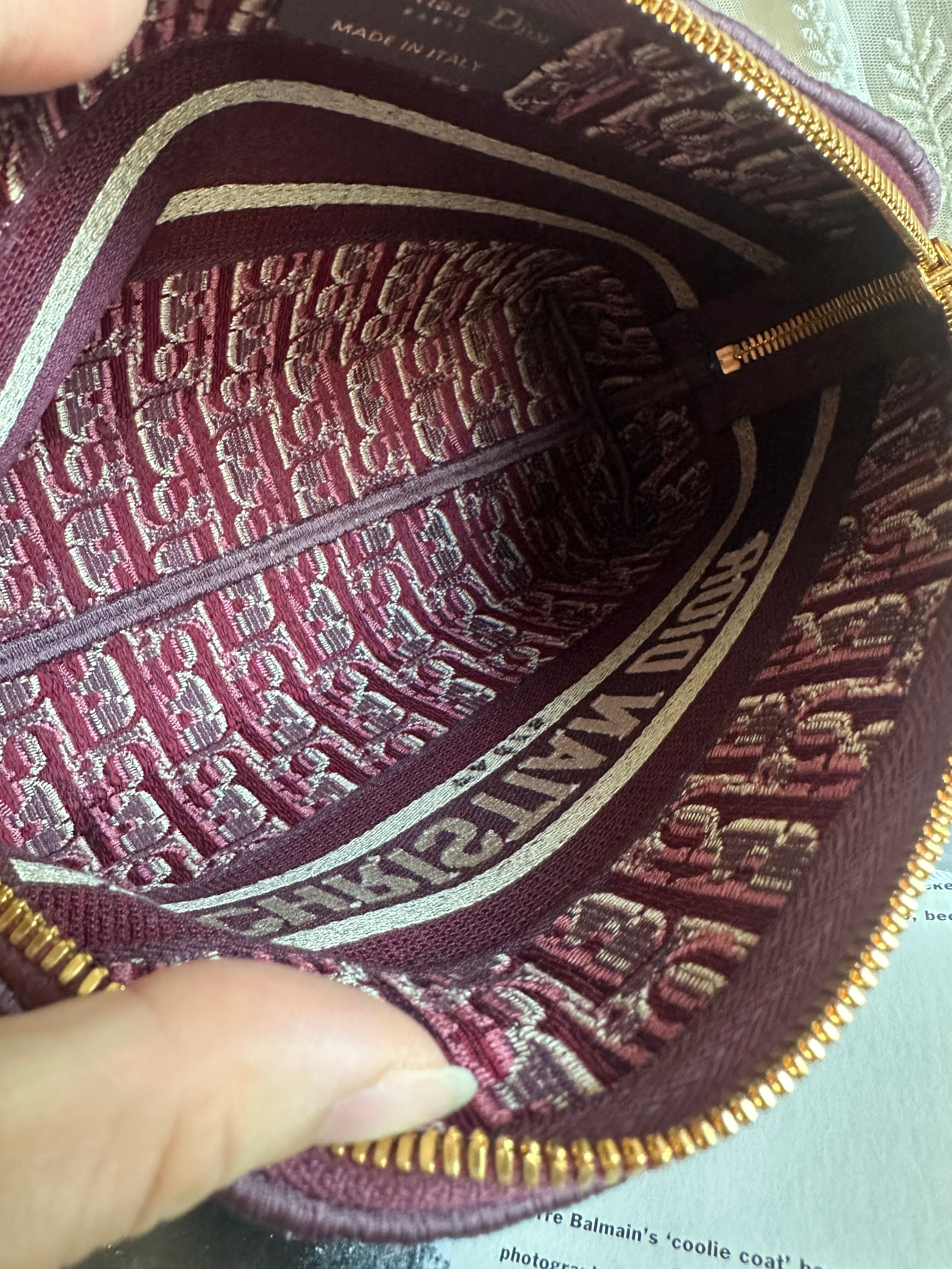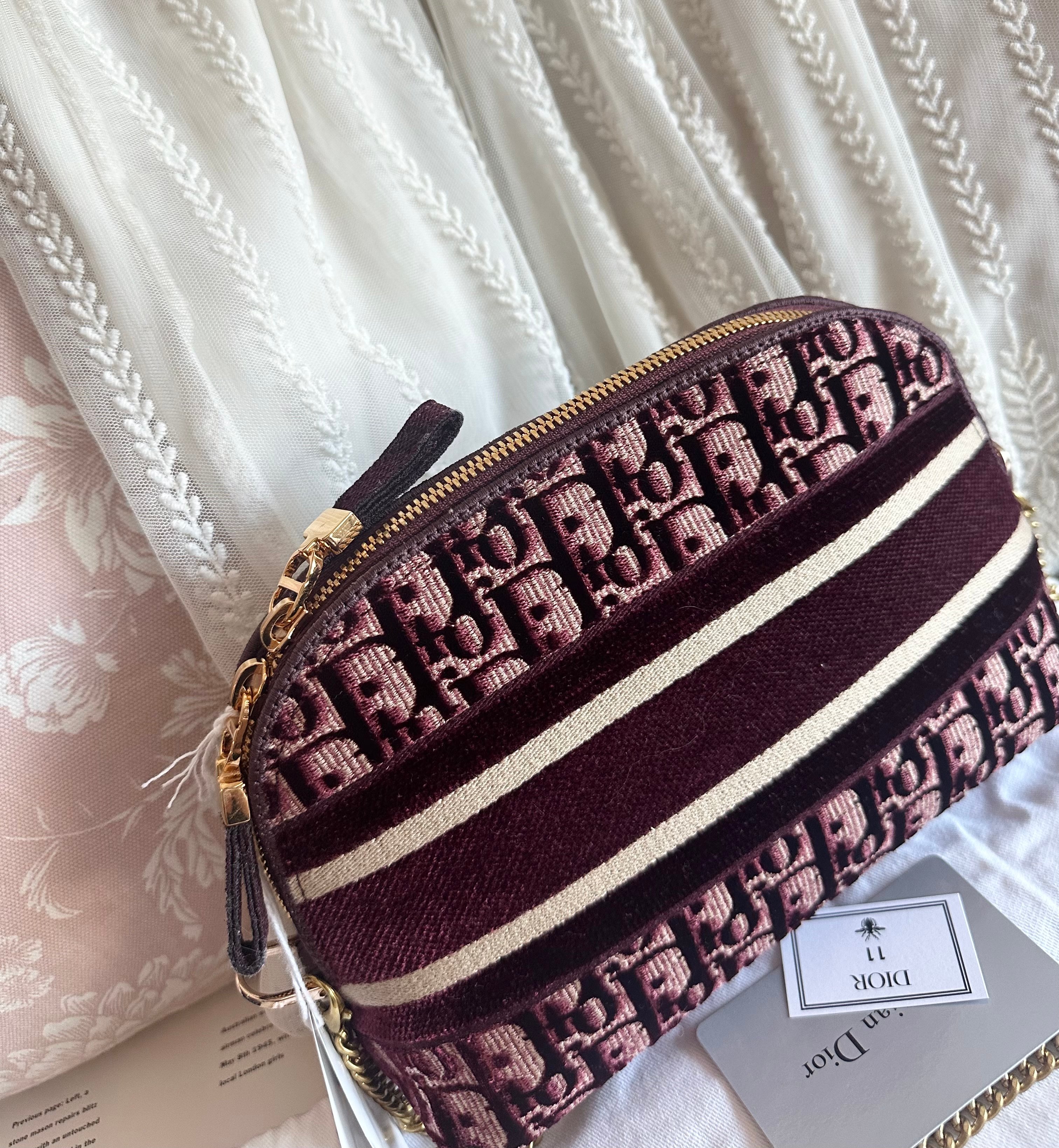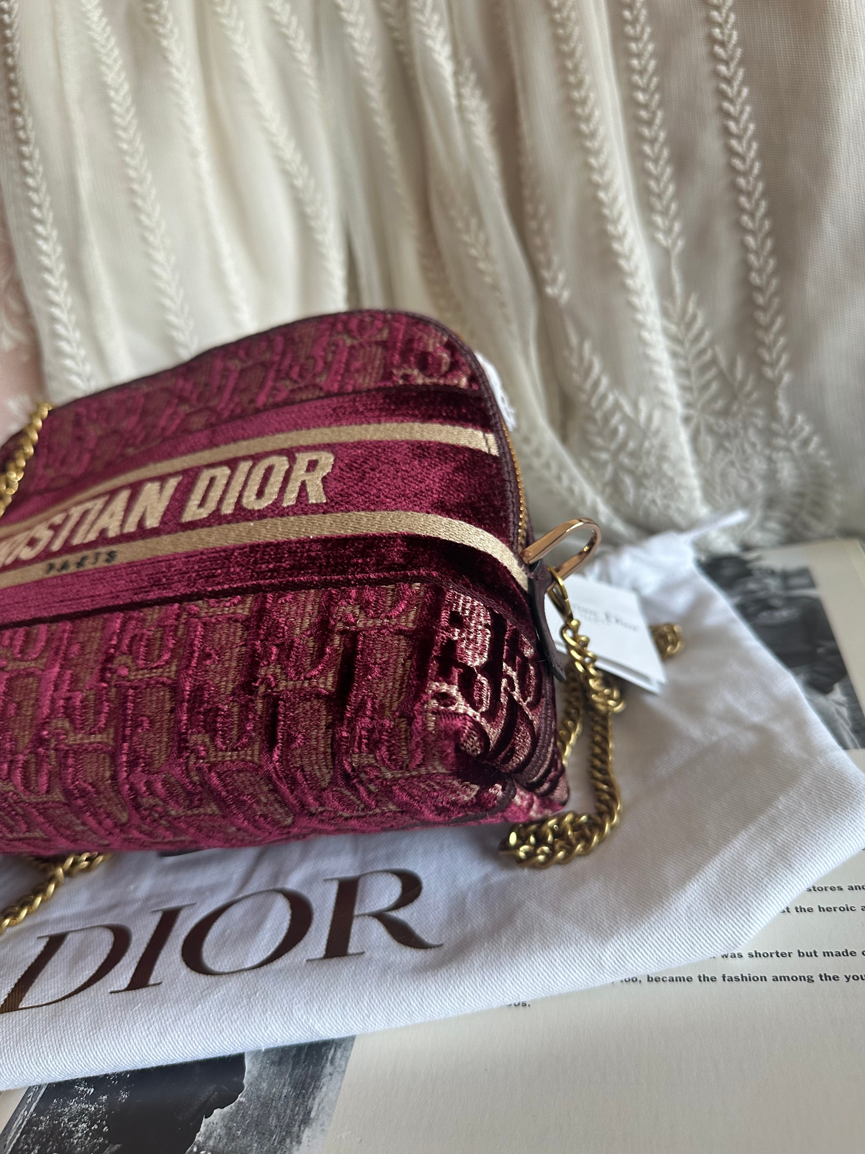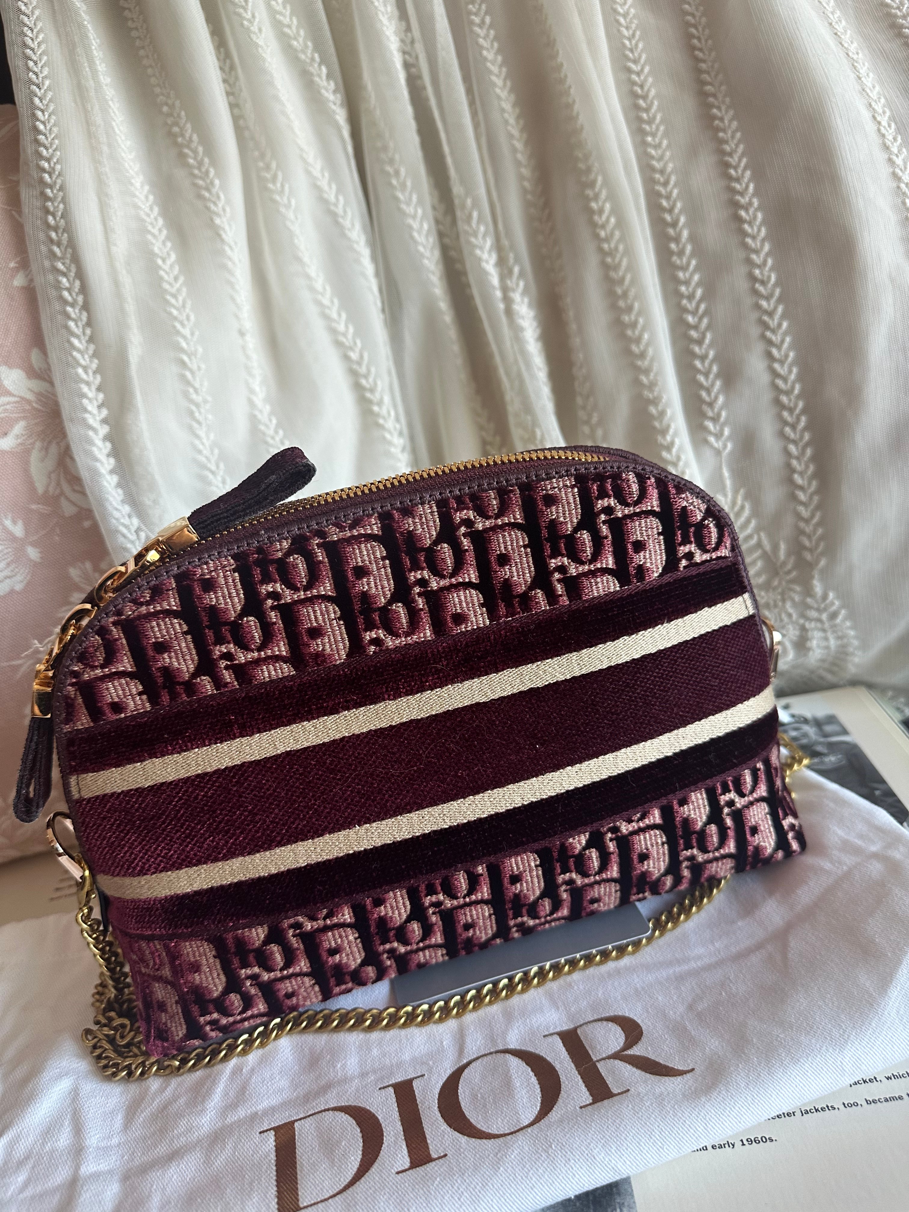 閑置品99新DIOR 刺繡款 Monogram burgundy Velvet Oblique Cosmetic Pouch vanity Bag