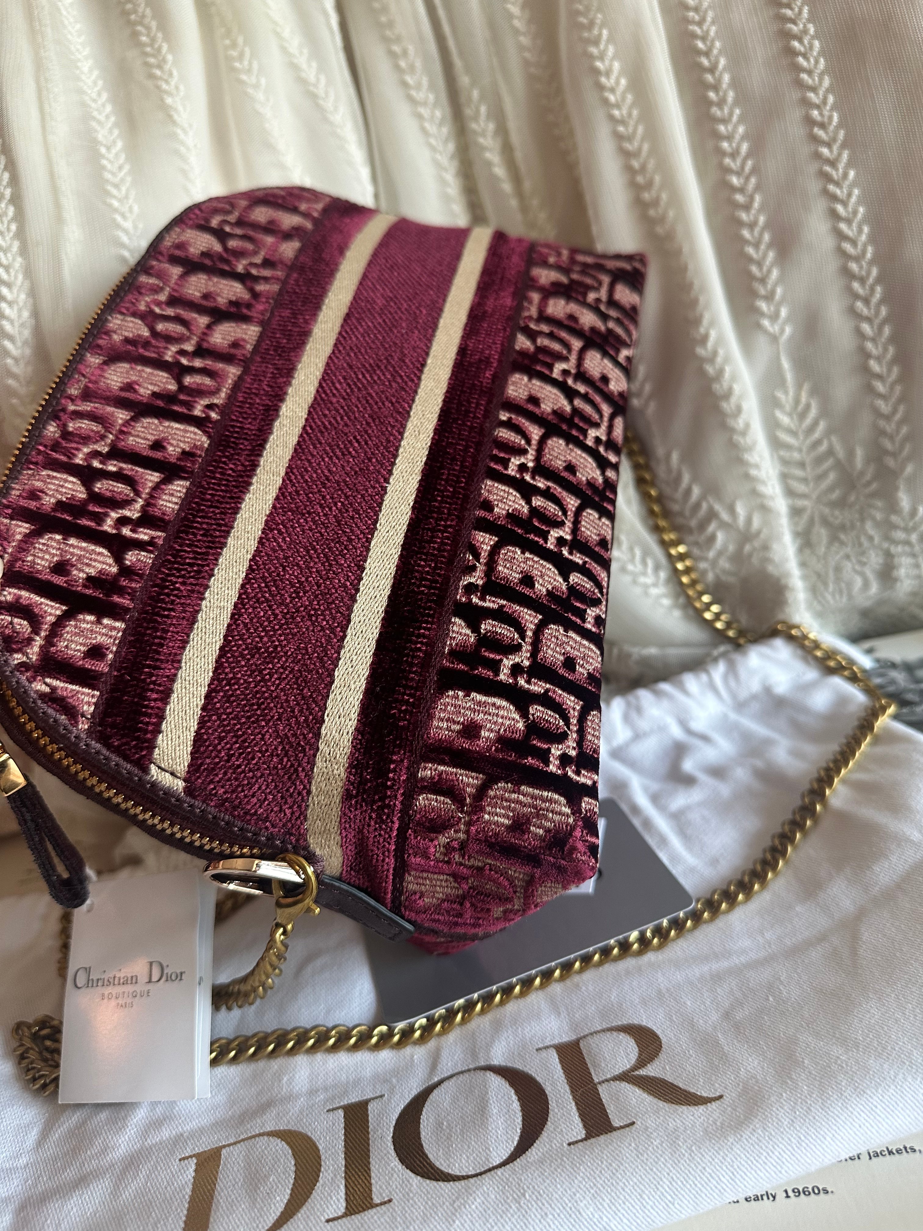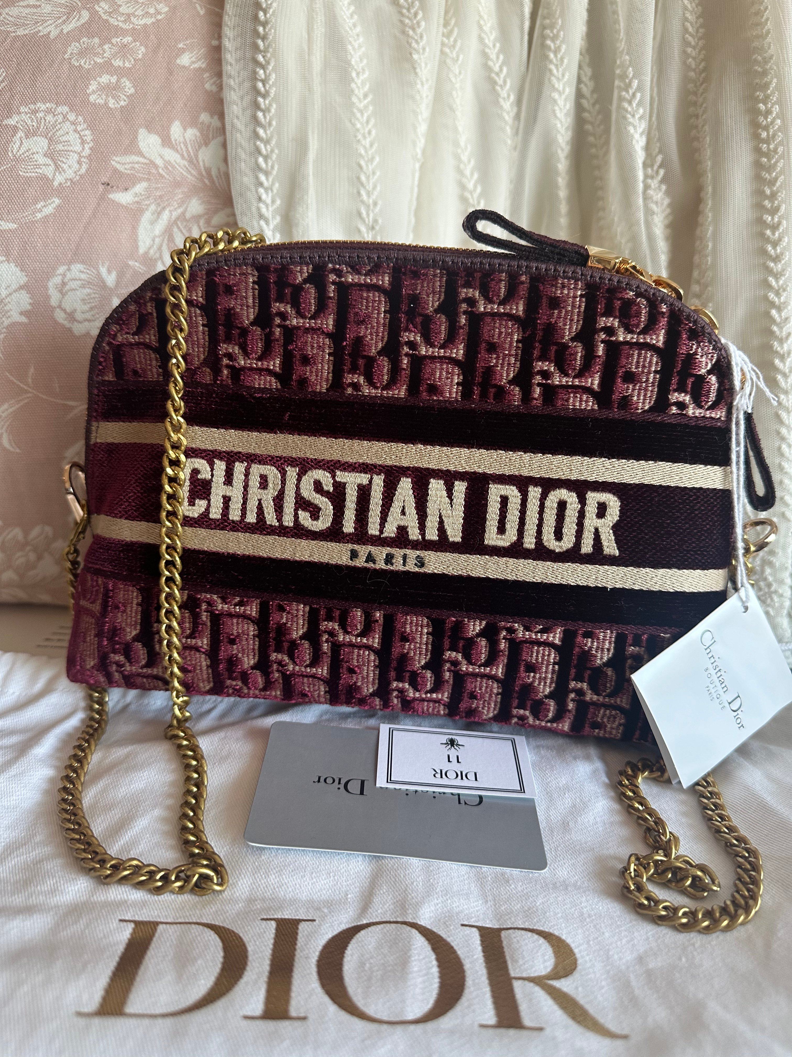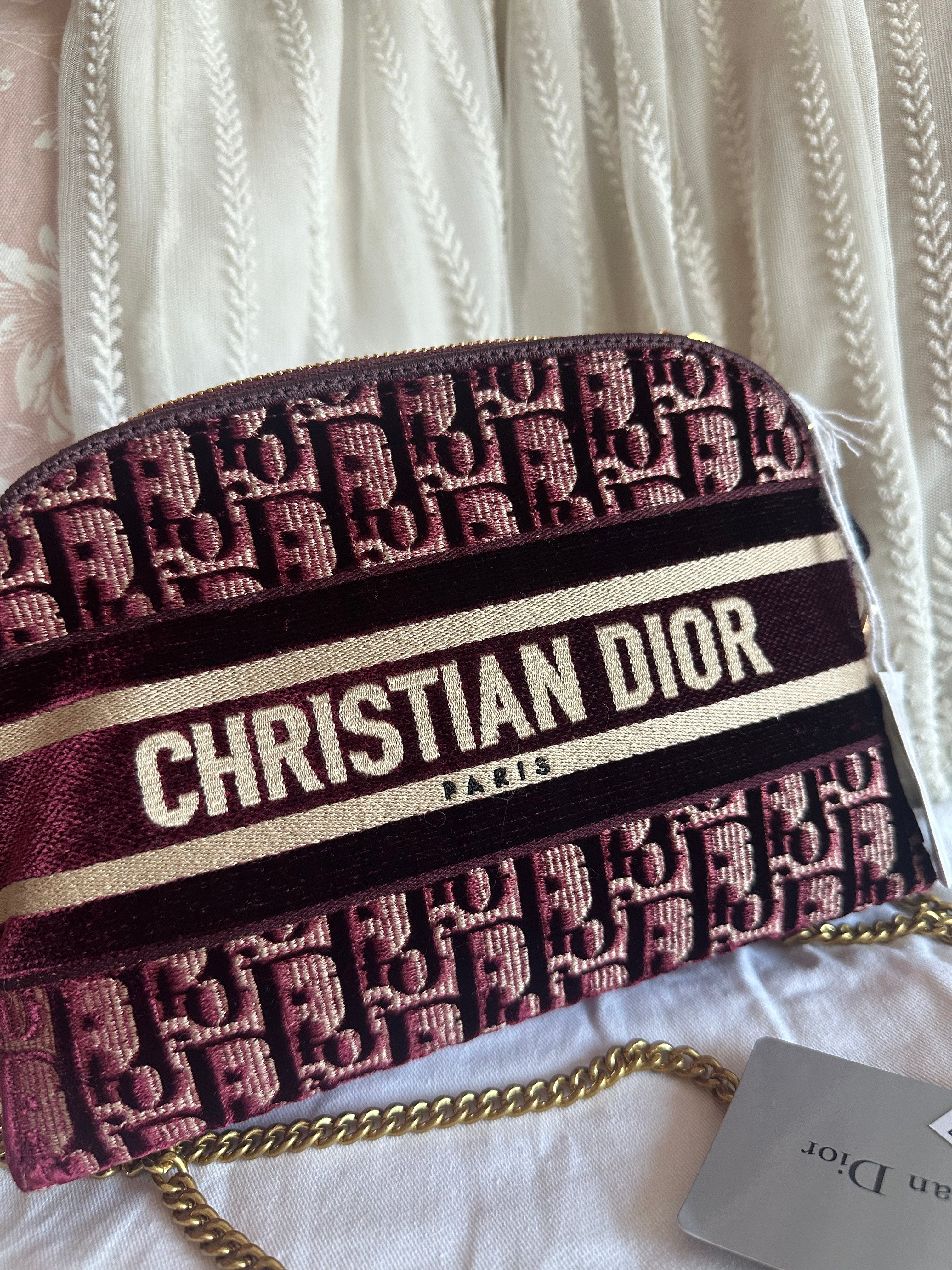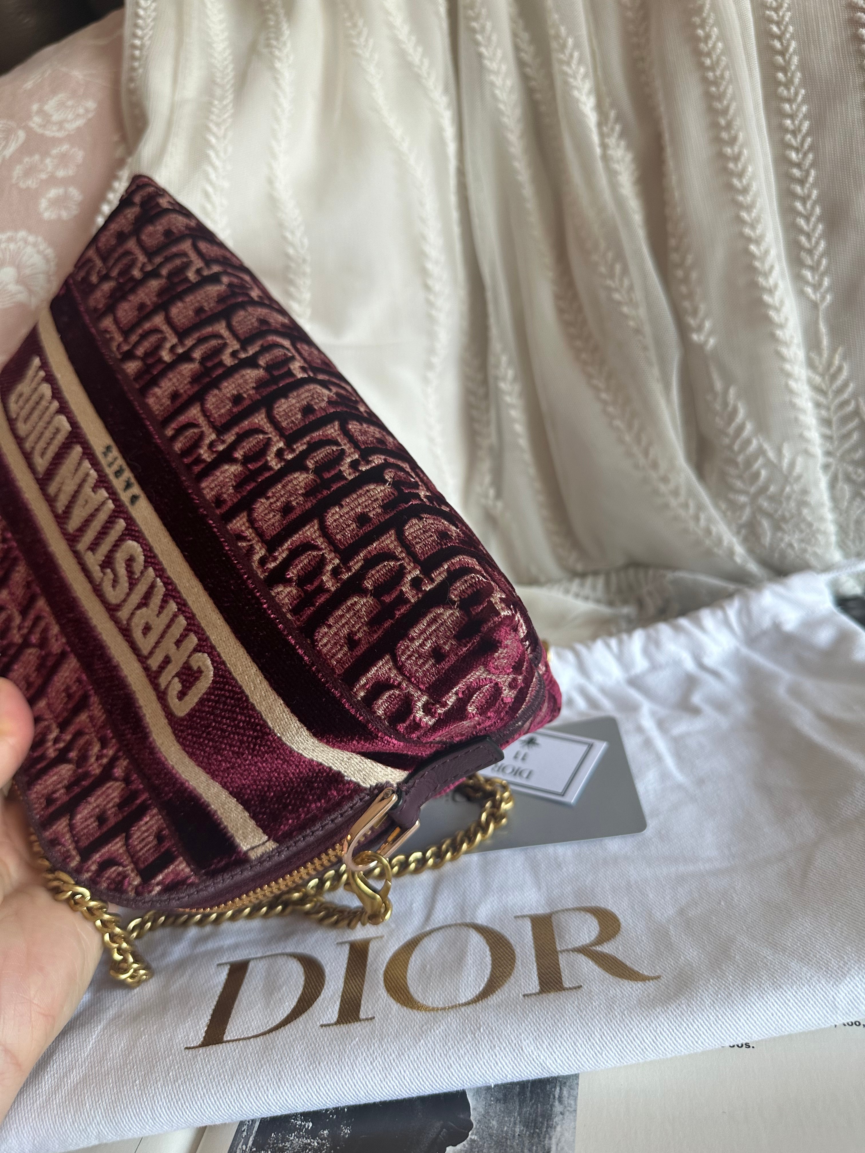 閑置品99新DIOR 刺繡款 Monogram burgundy Velvet Oblique Cosmetic Pouch vanity Bag