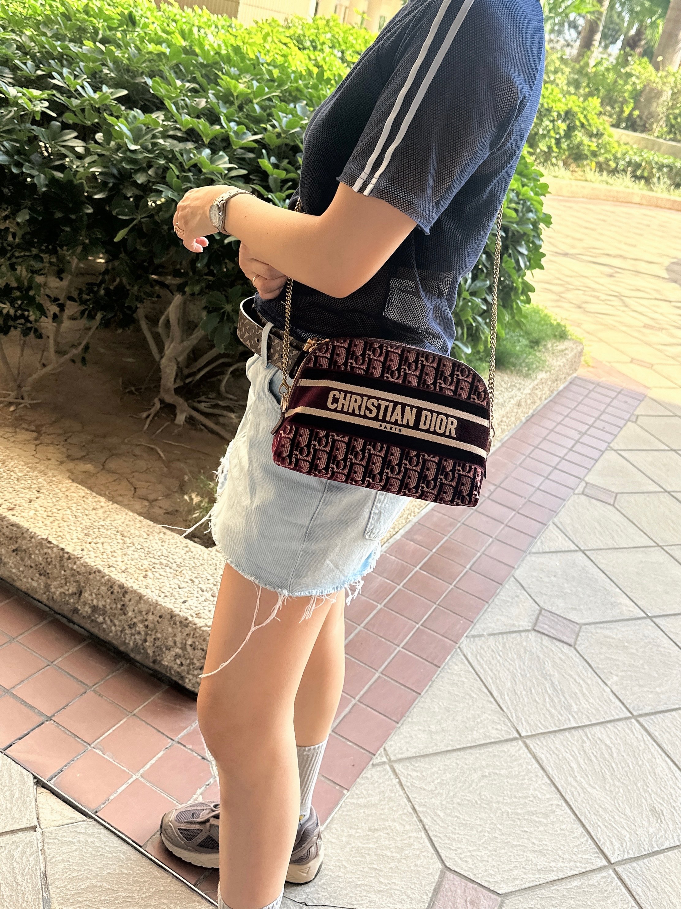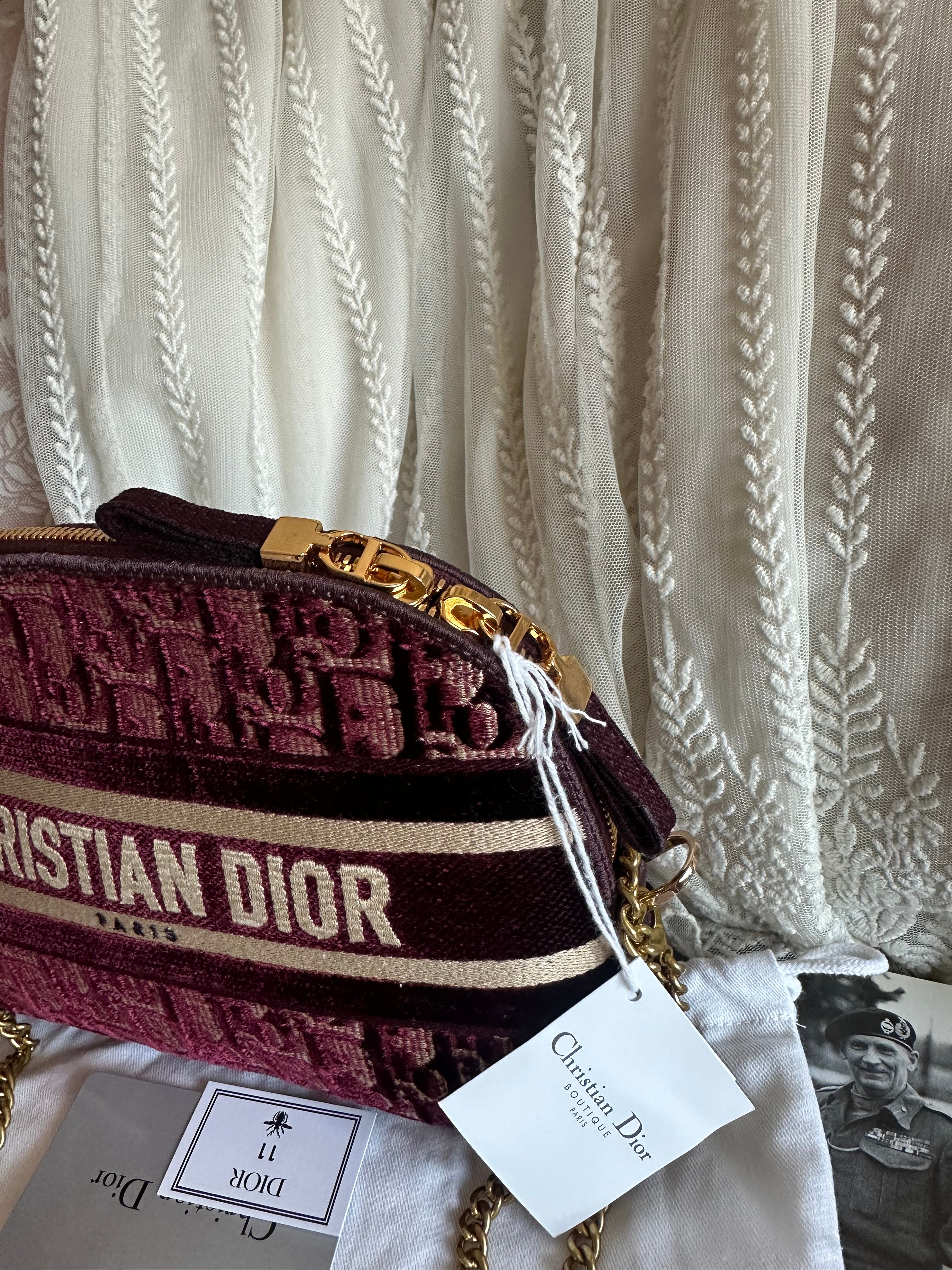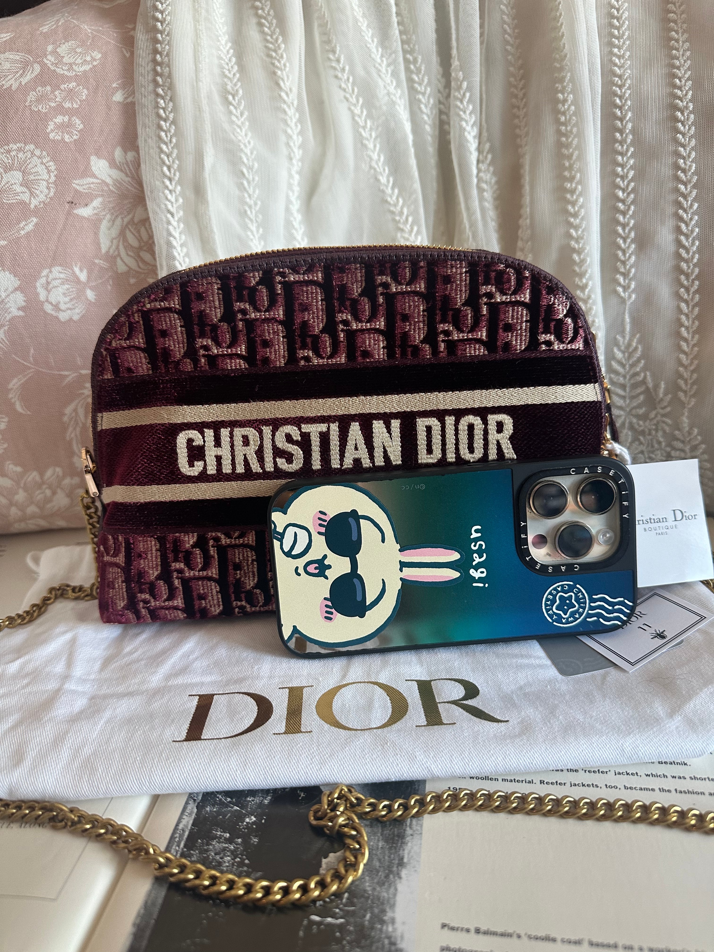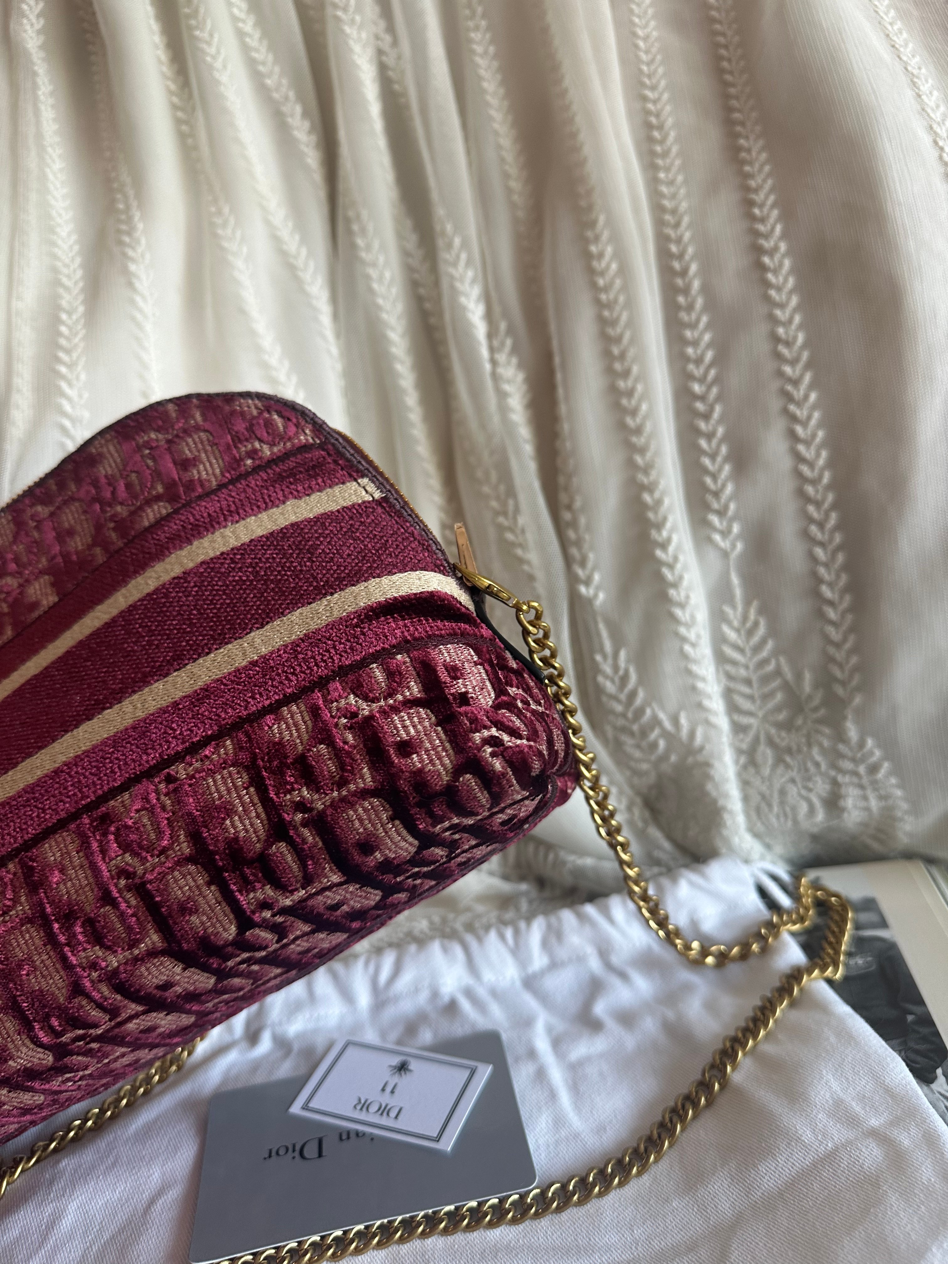 閑置品99新DIOR 刺繡款 Monogram burgundy Velvet Oblique Cosmetic Pouch vanity Bag
