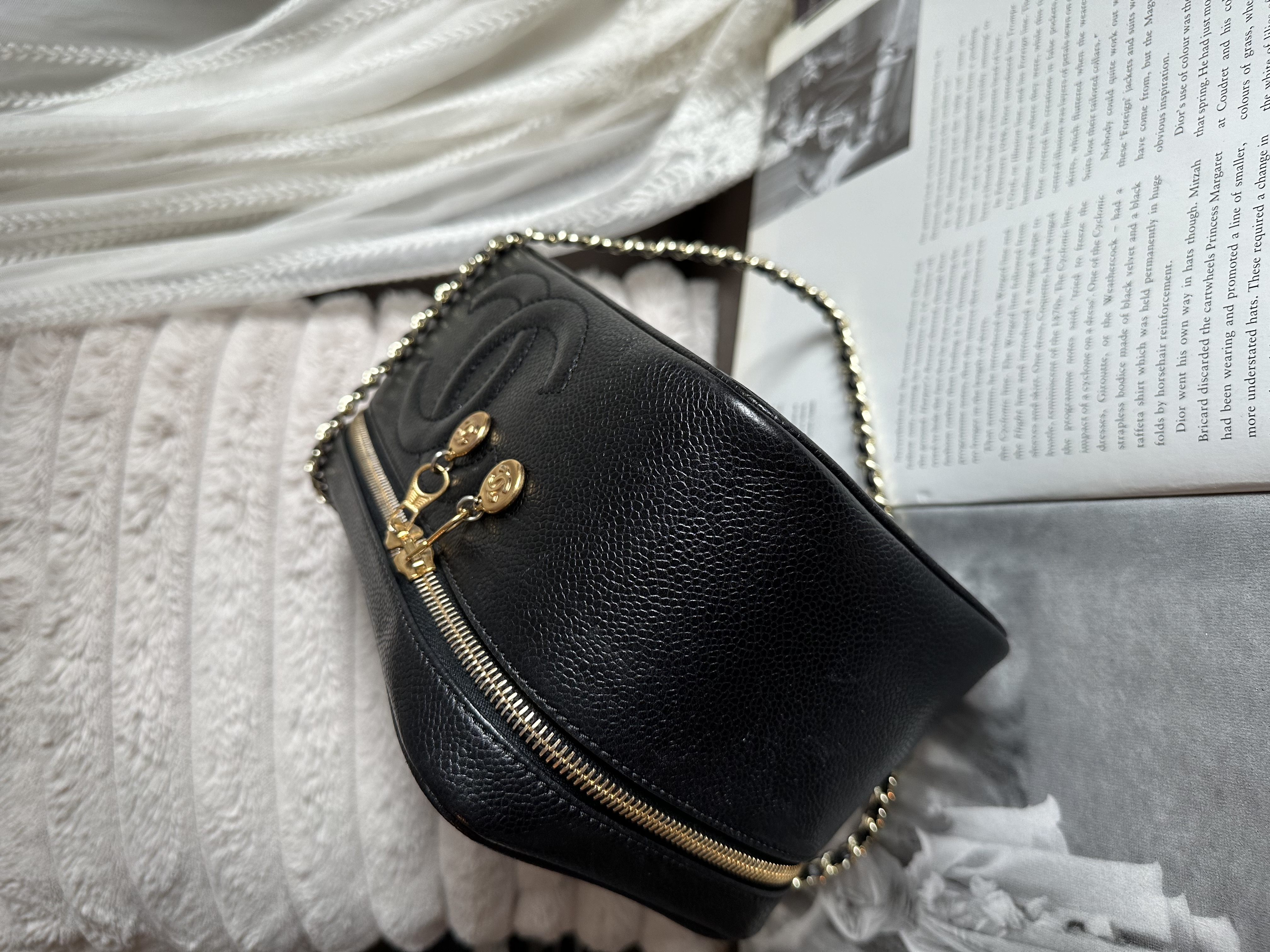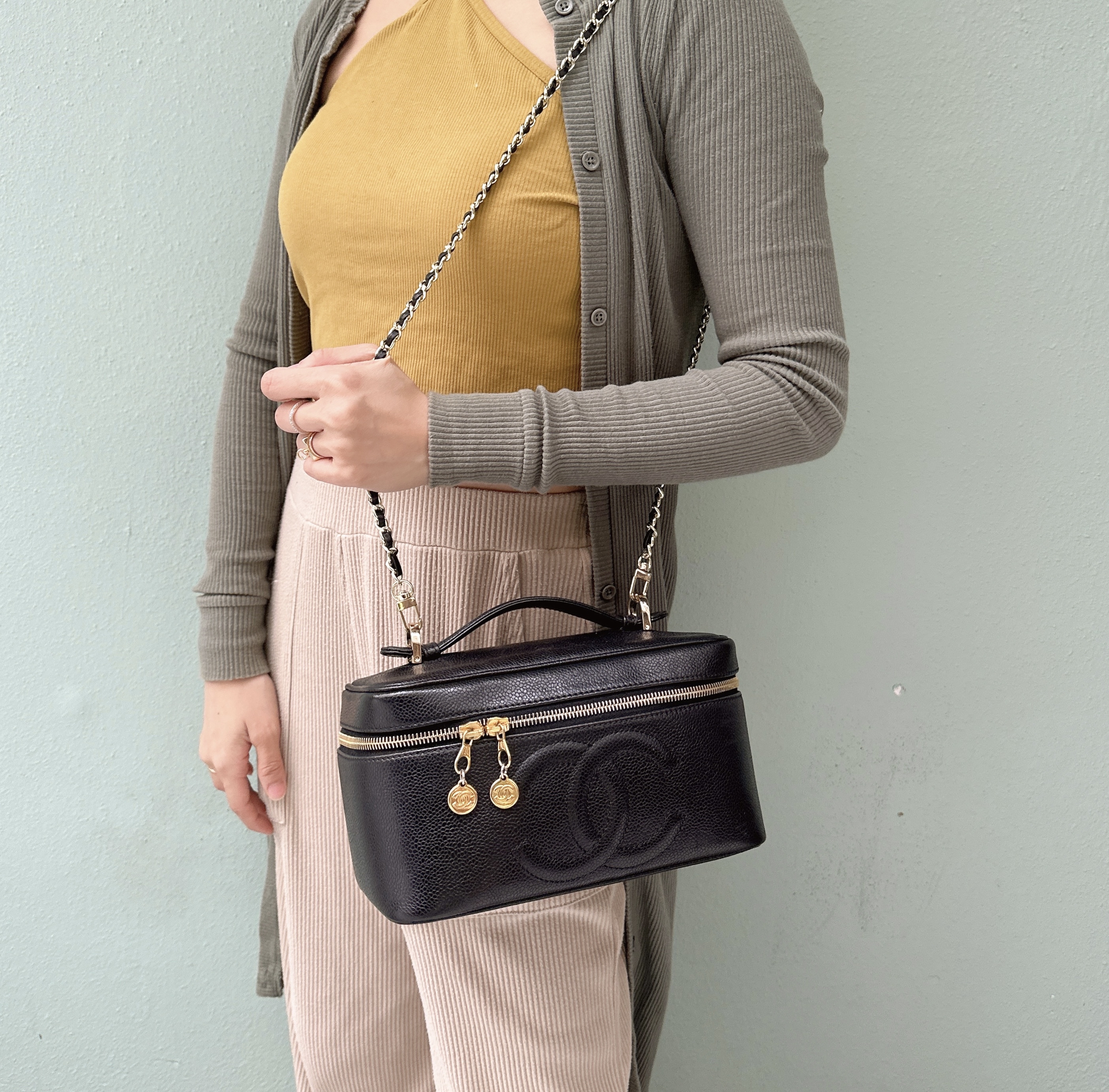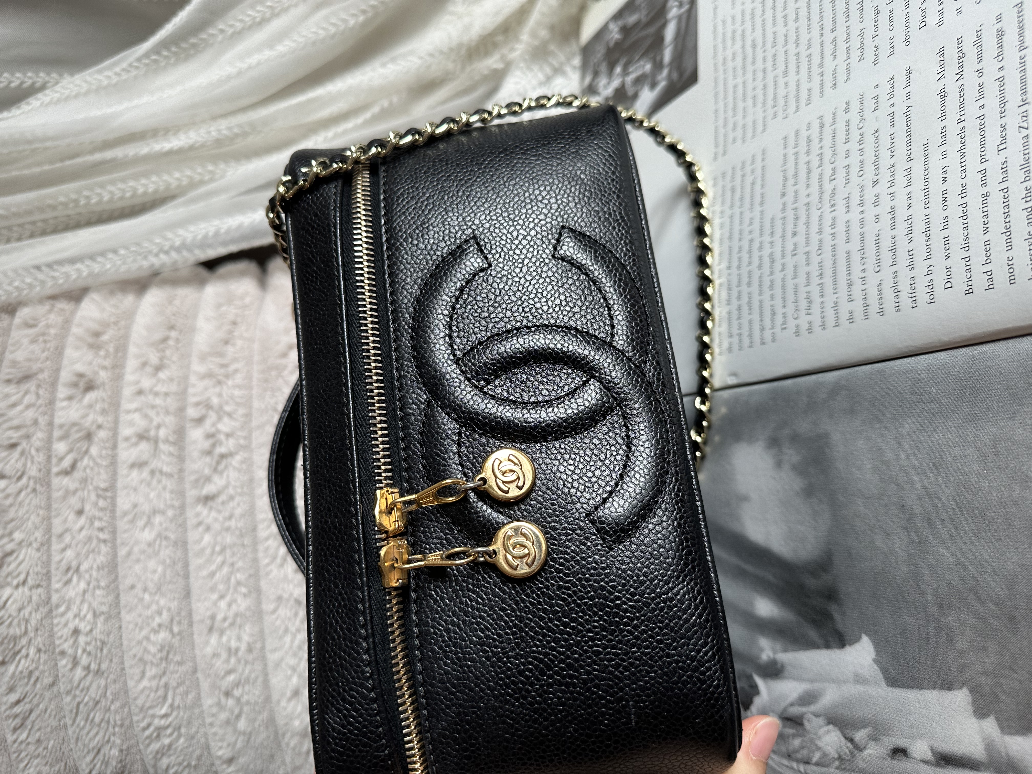 vintage cc vanity vanity 黑色荔枝皮 荔枝皮vanity返親都俾靚靚帶走😍有鏡同雙拉鏈款 尺寸比之前售出的容量更多鍾意裝得多嘢嘅靚靚啱晒 ⭐️經典款長期升值系列 改裝的後加左沒品牌鏈同扣 放到長銀包iphone 14 pro重點係黑色荔枝皮 今時今日呢個價錢專門店加價勁多 長銀包都買唔到 😱 投資手袋總好過投資其他嘢🙌 極美品 vintage chanel black caviar vanity bag 配件:貼 ;數字清晰可見 ) 年份;:1997-1999 送可改裝成袋用扣一對/送冇品牌長鏈一條 以上是免費贈送原裝並沒有 Item has been modified, installed non branded hook and non branded chain (全部可隨意拆除) 狀態:外觀95新/内93新 Dimensions:23x13x13cm 97-99 vintage chanel black caviar vanity bag Item has been modified, free non branded chain /non brand hook added to it (see photo ) its a vanity original without chain so you can wear as a crossbody bag Dimensions:23x13x13 Comes with authenticity sticker only Very Good condition inside/very good condition outside ❤️本店為香港零售管理協會會員/門市已開業8年連續多年正版正貨商戶2024編號 2538 付款方法:VISA / MASTER / AE / 銀聯 / UNION PAY /現金 /alipay ❤️另提供 AE 信用卡12個月免息分期 /恆生信用卡12個月免息分期/hsbc 12個月免息分期/渣打12個月免息分期 📢本店只出售正版貨📢 ❤️歡迎親臨銅鑼灣門市😍 ❤️ 本門市已搬到銅鑼灣記利佐治街2-10號銅鑼灣地帶2樓237號鋪 Shop 237, 2/f, causeway place, 2 great george street, causeway bay 門市電話:27808868 WhatsApp :📞65230308