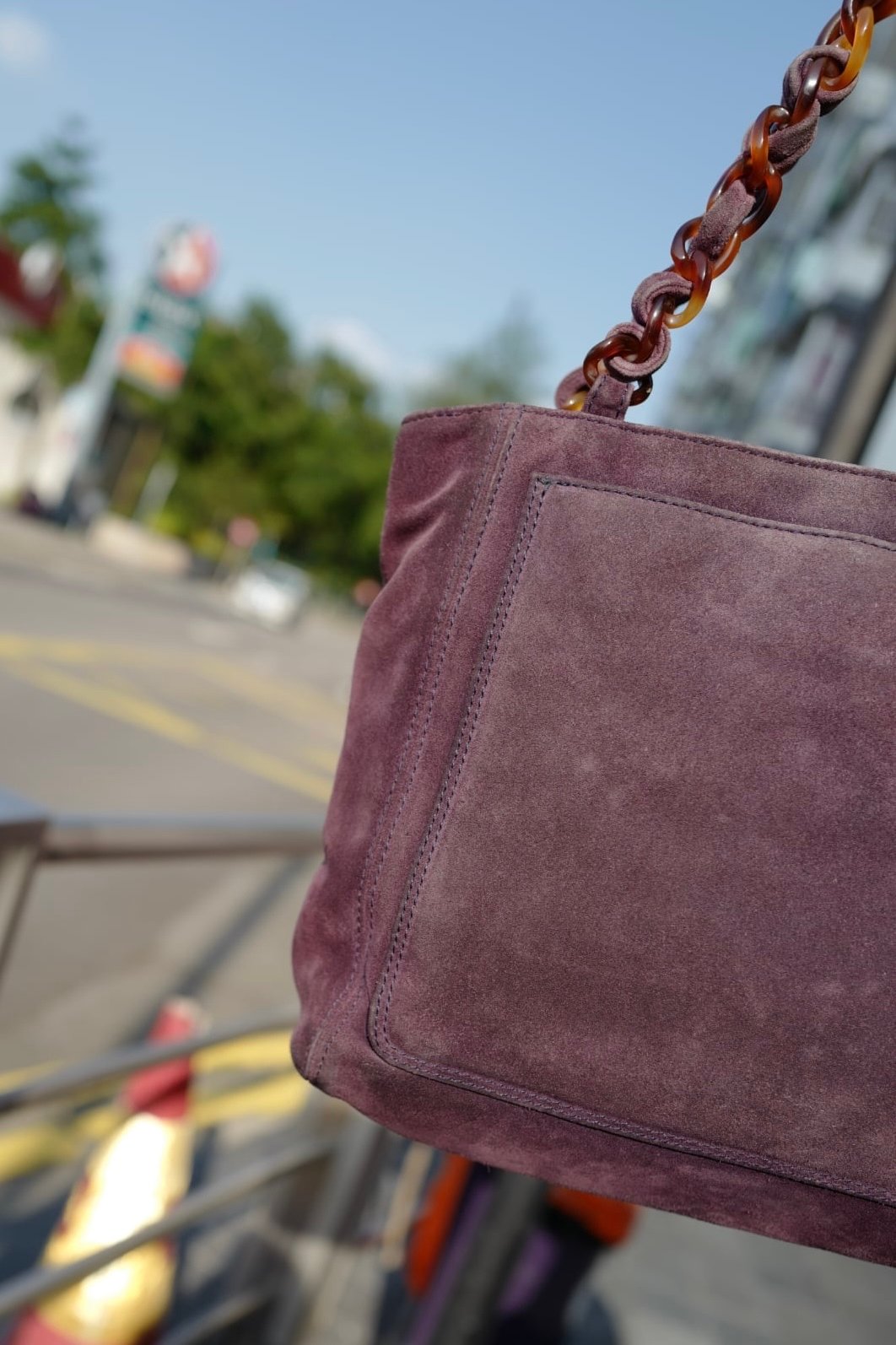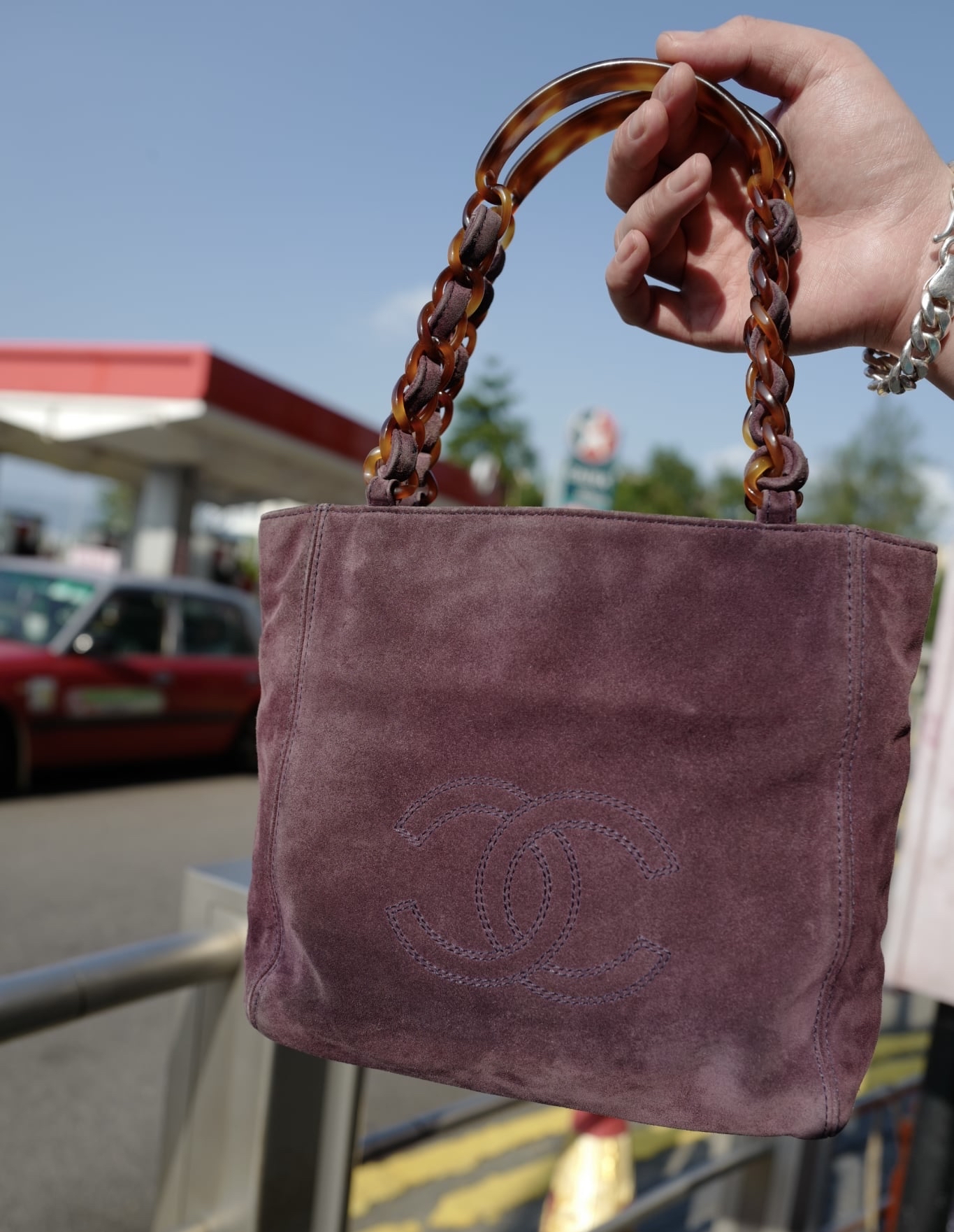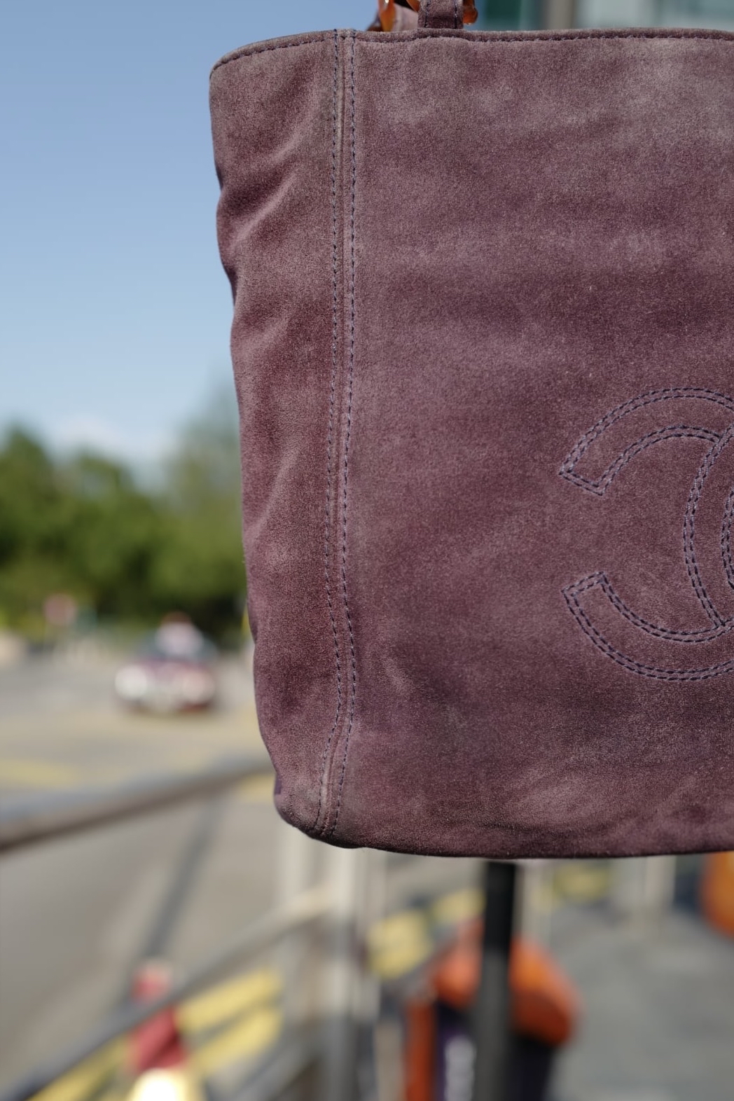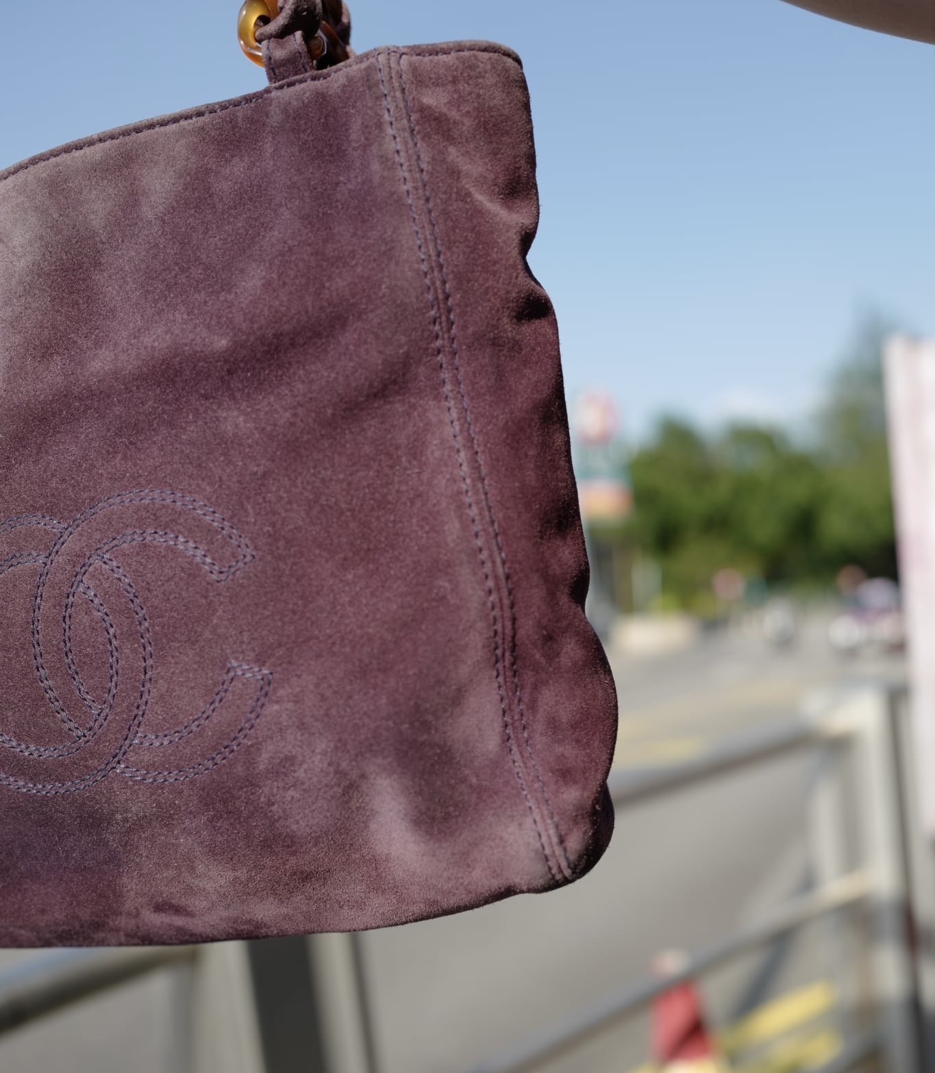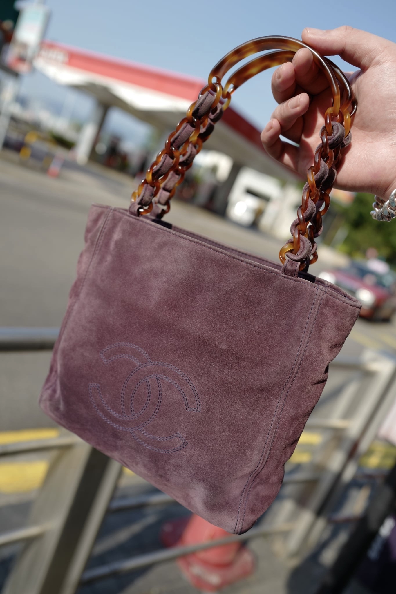 97-99 vintage chanel purple suede Tortoise Shell Style Strap Tote Bag