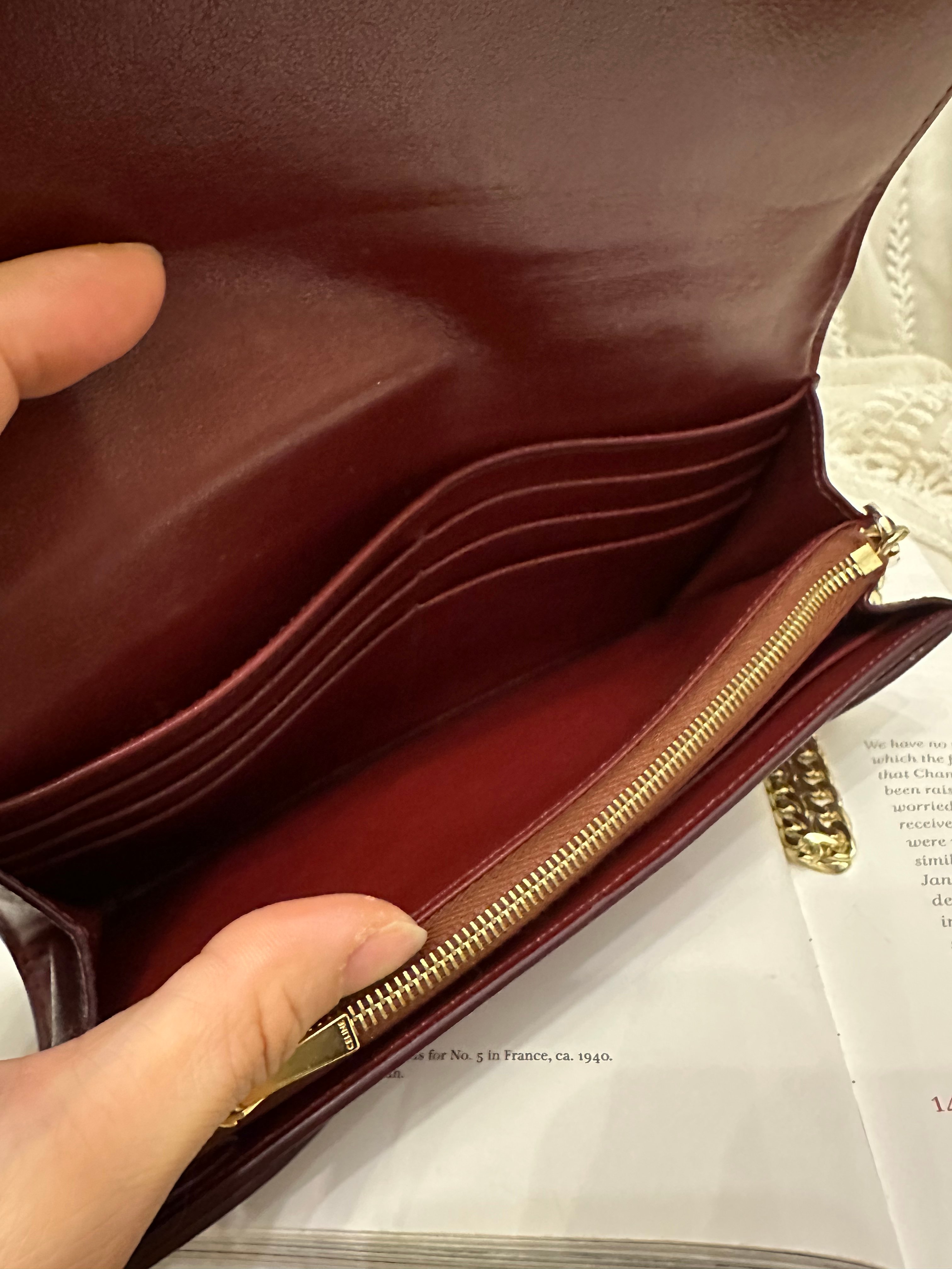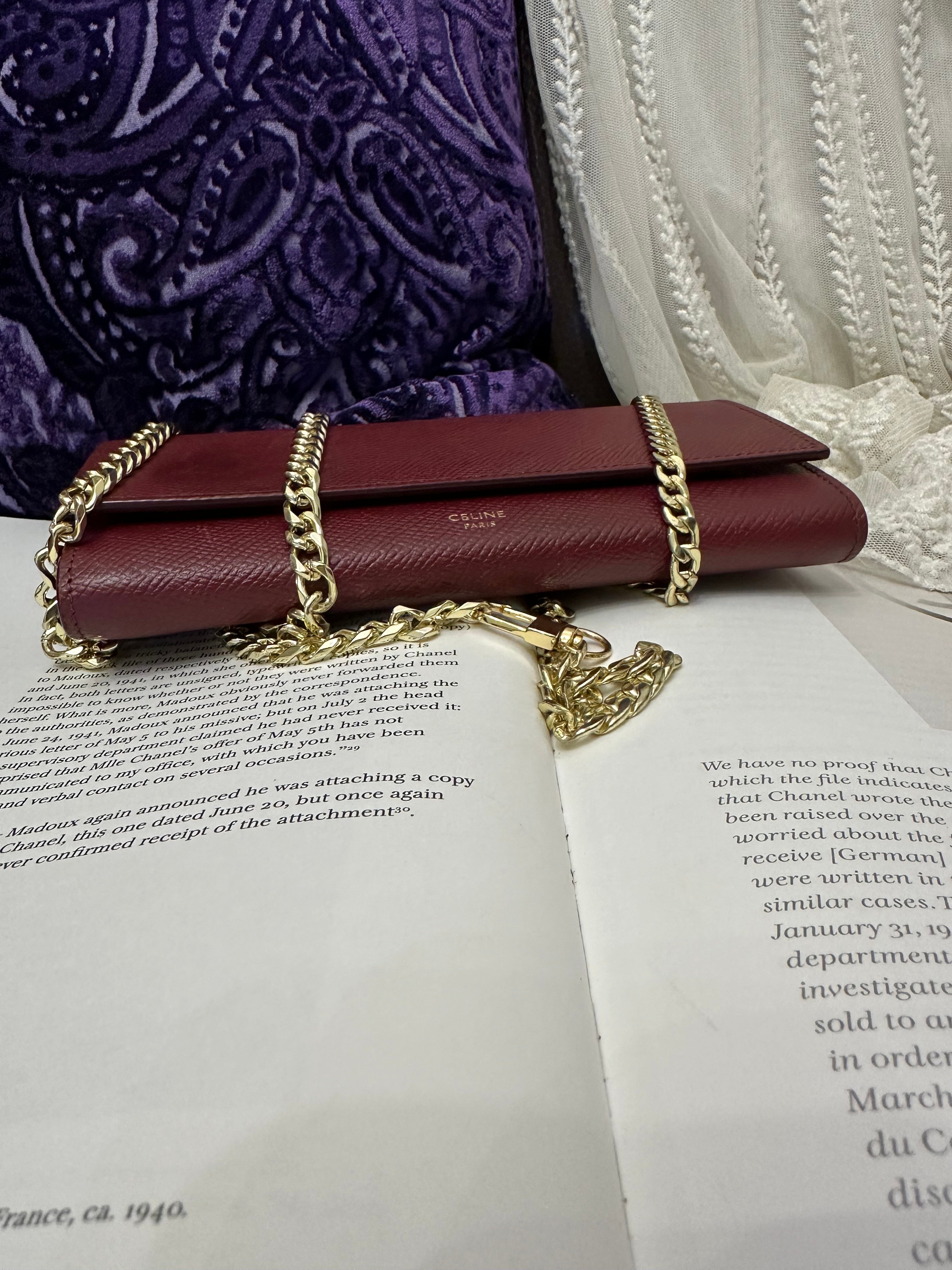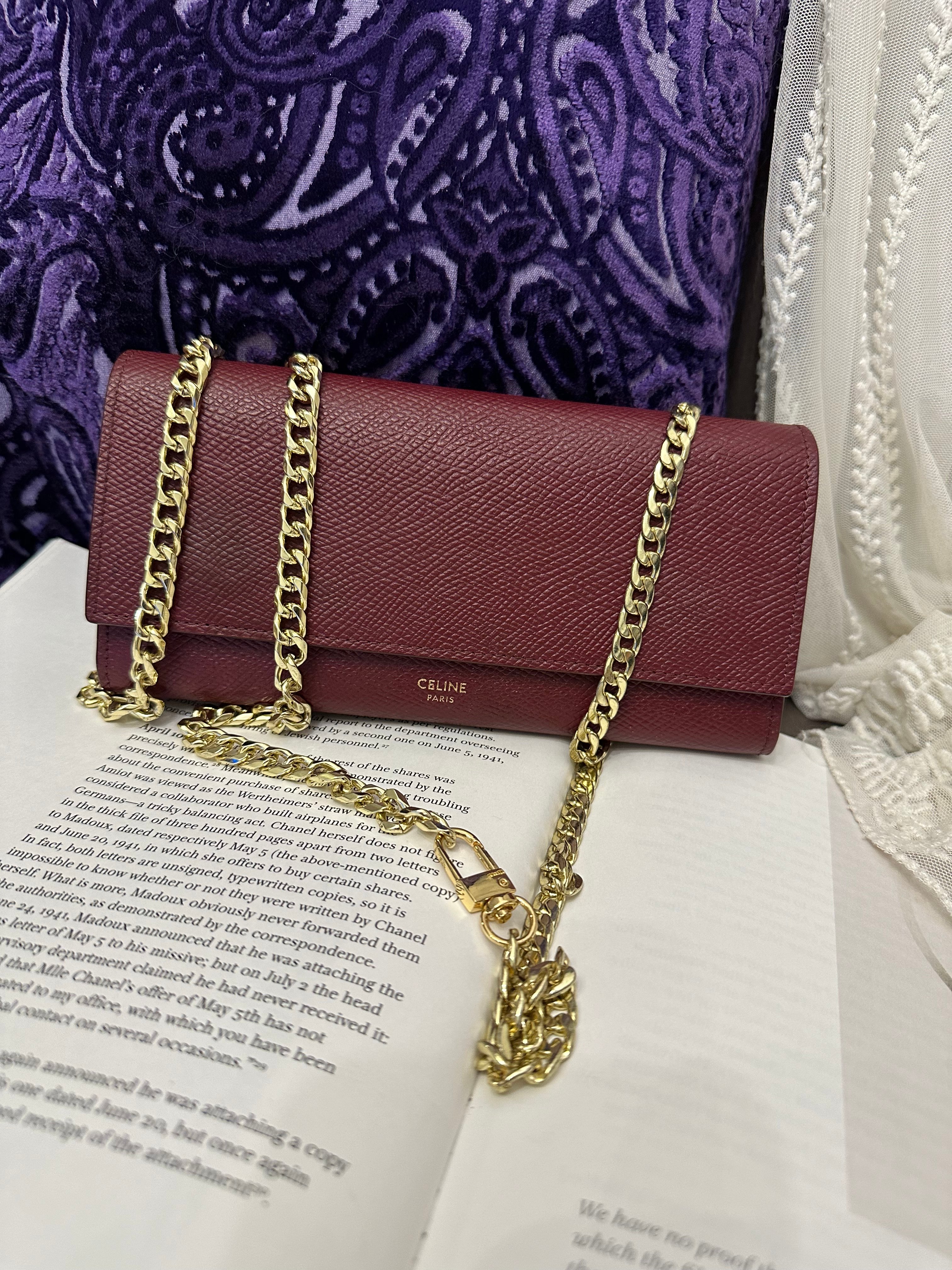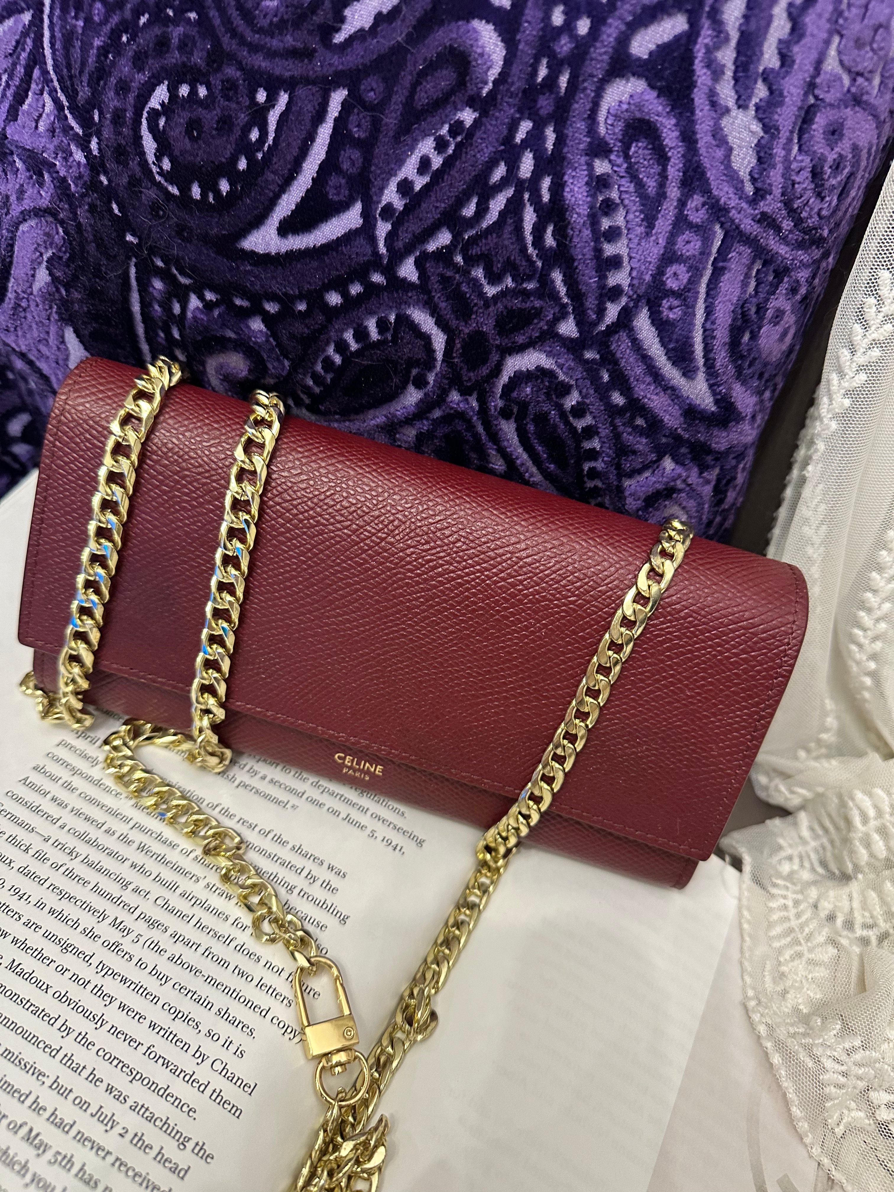 Celine burgundy long wallet 改裝的 後加左扣同chain 可crossbody Celine burgundy wallet 狀態:袋外88新/內98新 尺寸:19x10x2 配件:沒有 己改裝成袋用扣一對/沒品牌長鏈一條(見圖) Celine burgundy long wallet Dimensions:19x10x2cm Accessories :none Item has been modified, installed non branded hook / non branded chain (removable) (see photo ) so you can wear as a crossbody bag Condition: Very Good condition 🖤本店為香港零售管理協會會員/門市已開業9年連續多年正版正貨商戶2025編號 001176 付款方法:VISA / MASTER / AE / 銀聯 / UNION PAY /現金 /alipay ❤️門市提供恒生💳渣打💳滙豐💳AE 💳DBS 💳Citibank💳mox 信用卡✅免息分期✅ 📢本店只出售正版貨📢 ❤️歡迎親臨銅鑼灣門市😍 ❤️ 本門市已搬到銅鑼灣記利佐治街2-10號銅鑼灣地帶2樓237號鋪 Shop 237, 2/f, causeway place, 2 great george street, causeway bay 📞65230308