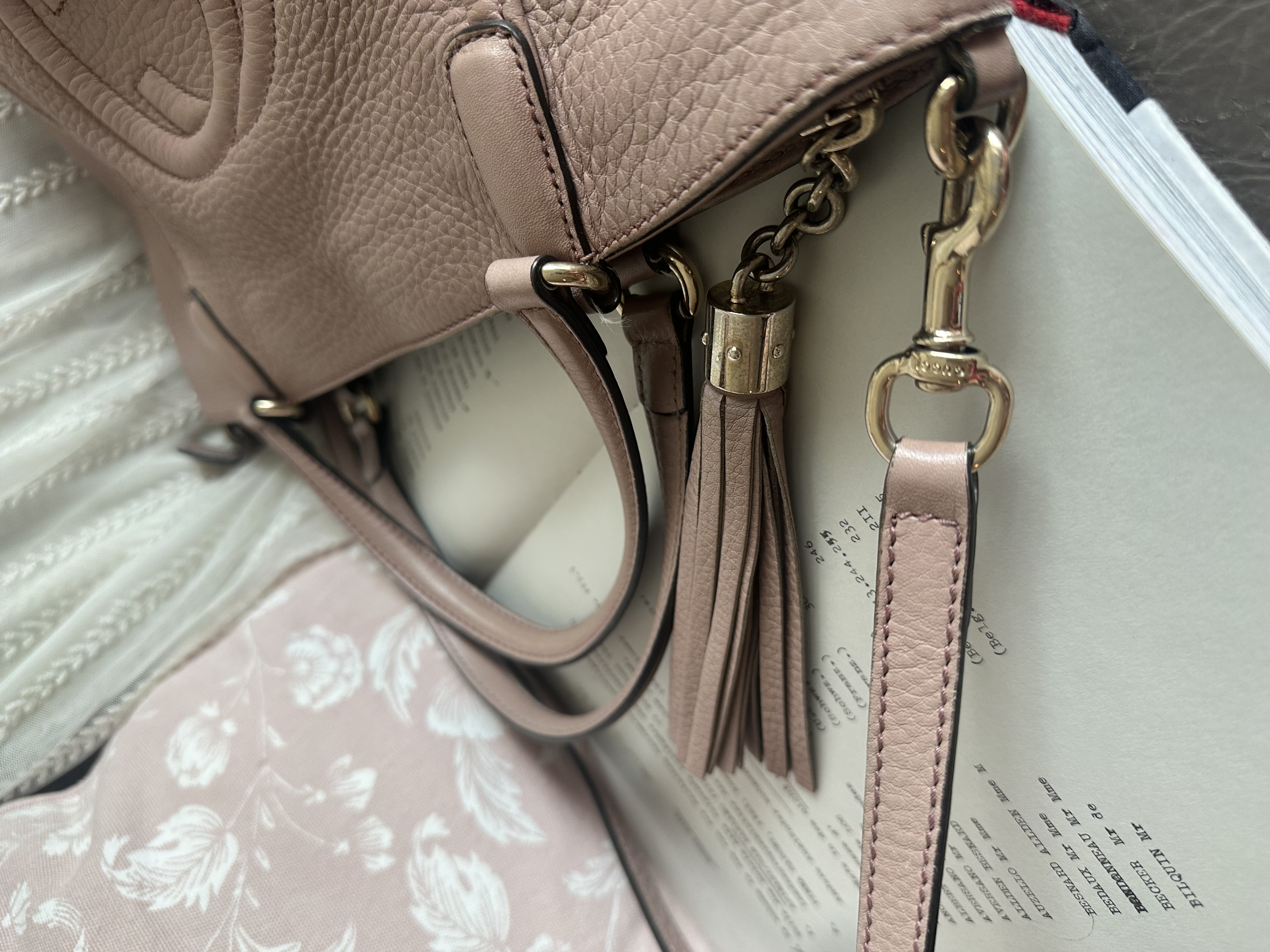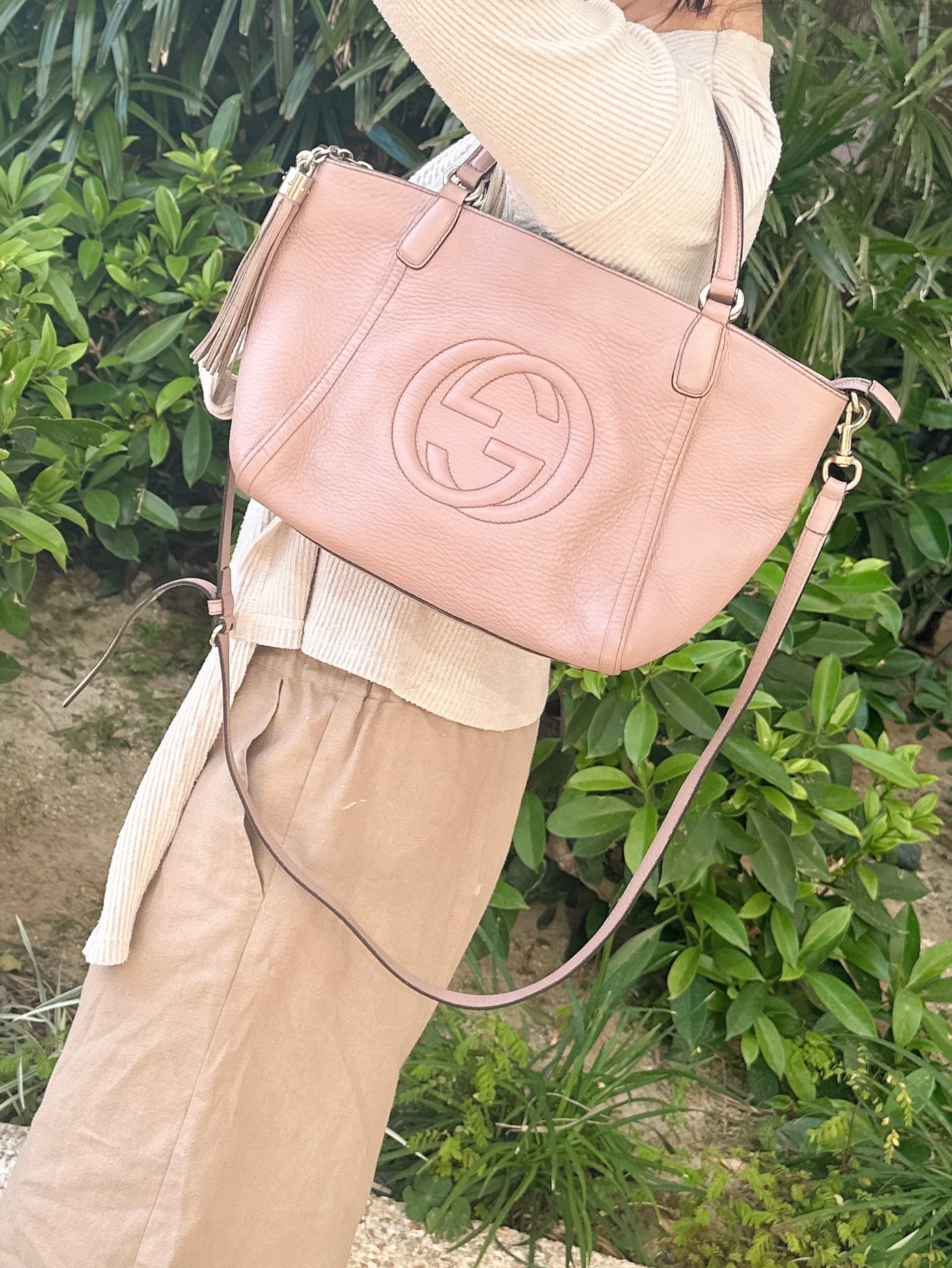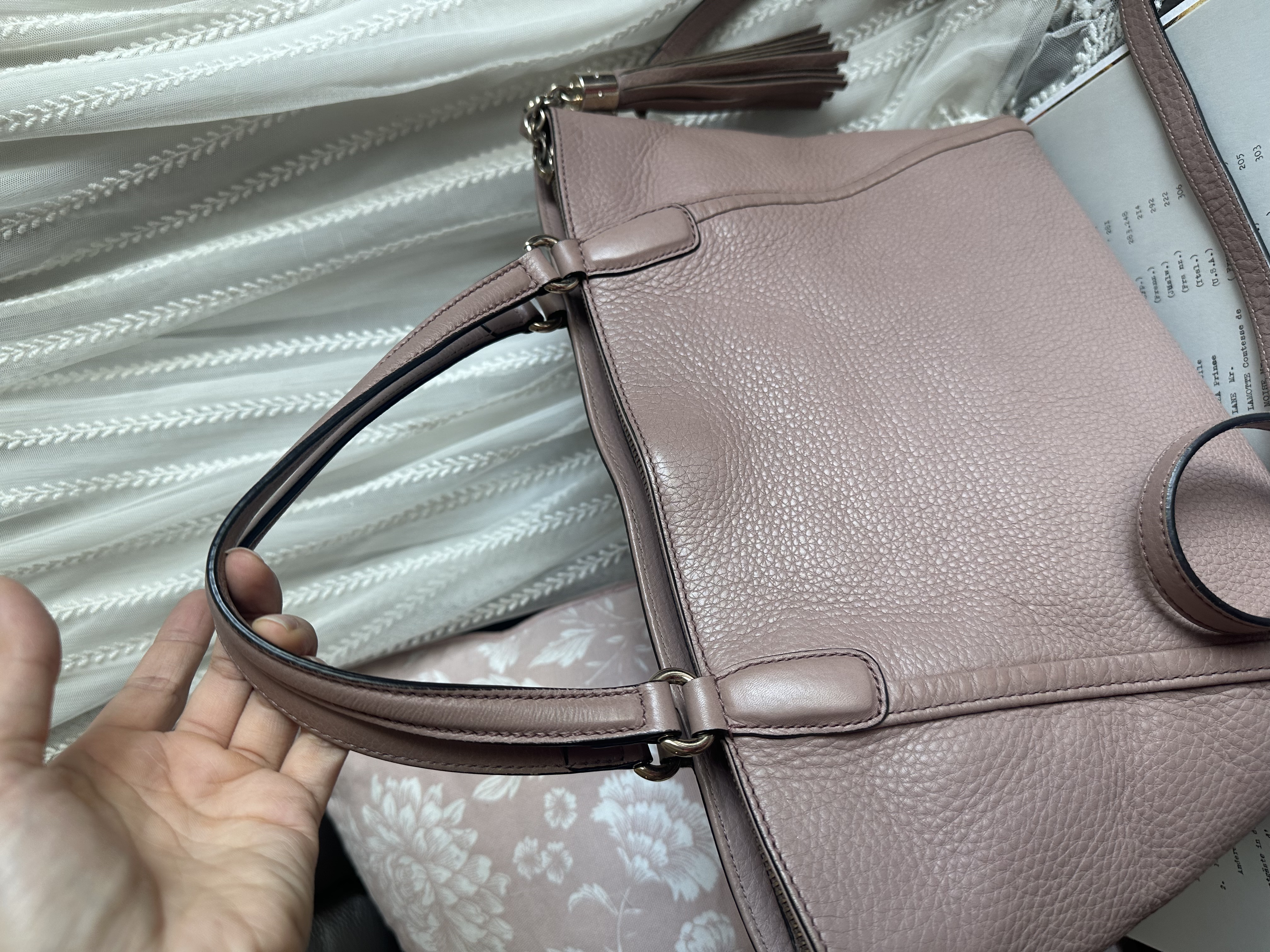 超靚櫻花粉Gucci Pink Soho Cellarius tassel tote bag 可上膊/crossbody💓🌸 非常新淨 Gucci Pink Soho Cellarius tassel tote bag 狀態:袋外93新/袋內93新 配件:原裝長帶 Dimensions:26x21x13cm 🖤本店為香港零售管理協會會員/門市已開業9年連續多年正版正貨商戶2025編號 001176 付款方法:VISA / MASTER / AE / 銀聯 / UNION PAY /現金 /alipay ❤️門市提供恒生💳渣打💳滙豐💳AE 💳DBS 💳Citibank💳mox 信用卡✅免息分期✅ 📢本店只出售正版貨📢 ❤️歡迎親臨銅鑼灣門市😍 ❤️ 本門市已搬到銅鑼灣記利佐治街2-10號銅鑼灣地帶2樓237號鋪 Shop 237, 2/f, causeway place, 2 great george street, causeway bay