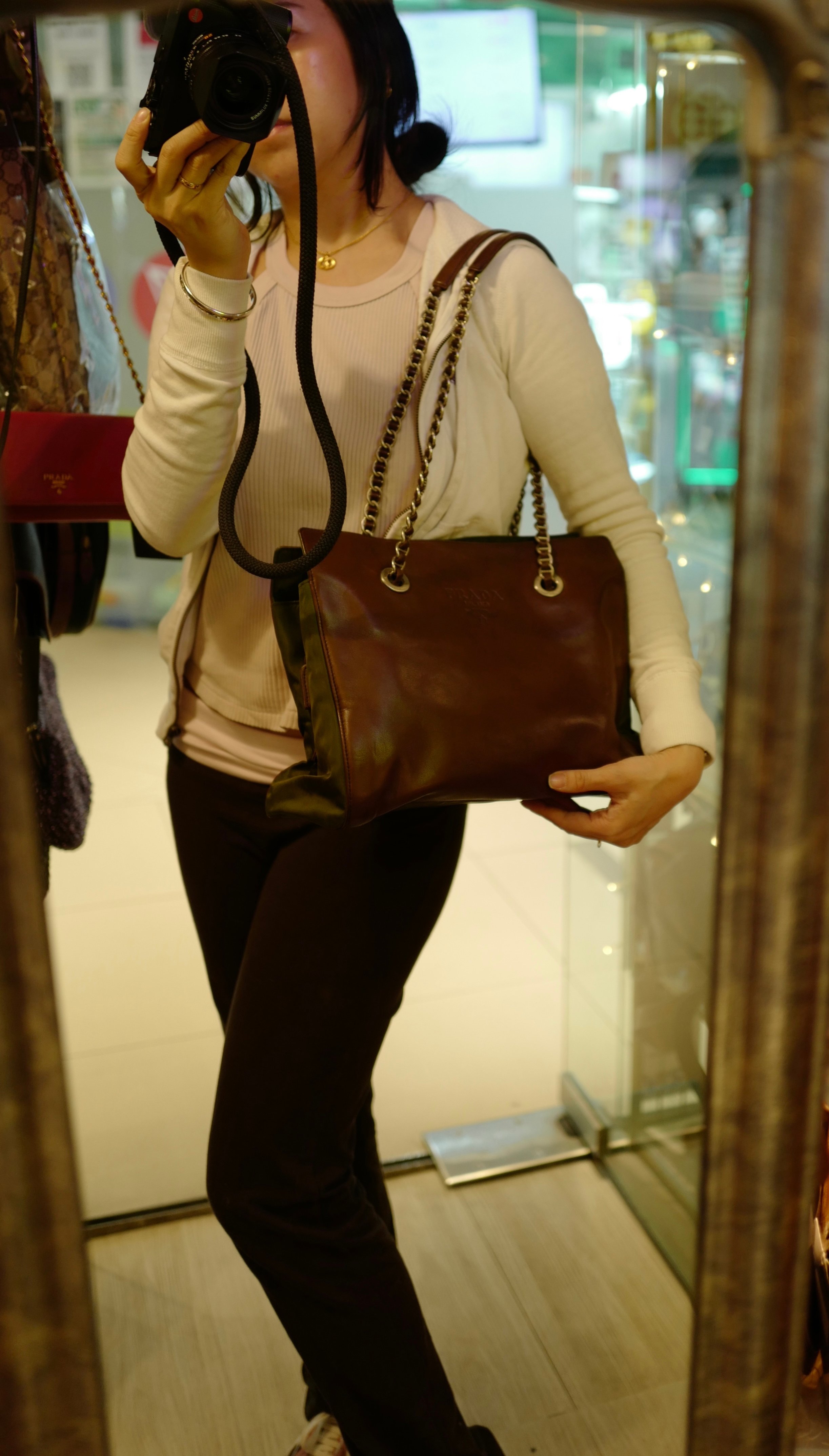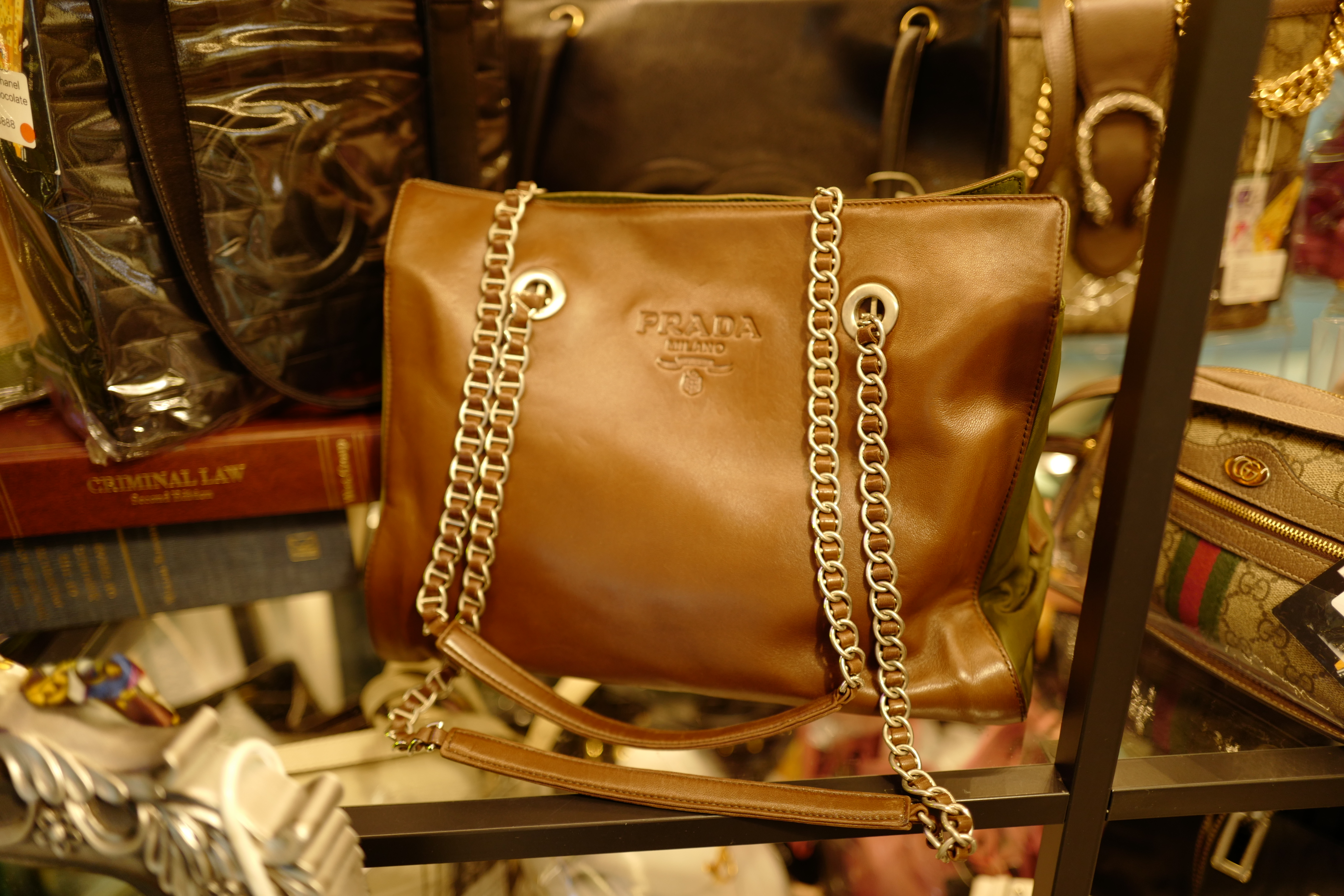 稀小Vintage prada dark brown/army green chain shoulder tote bag
