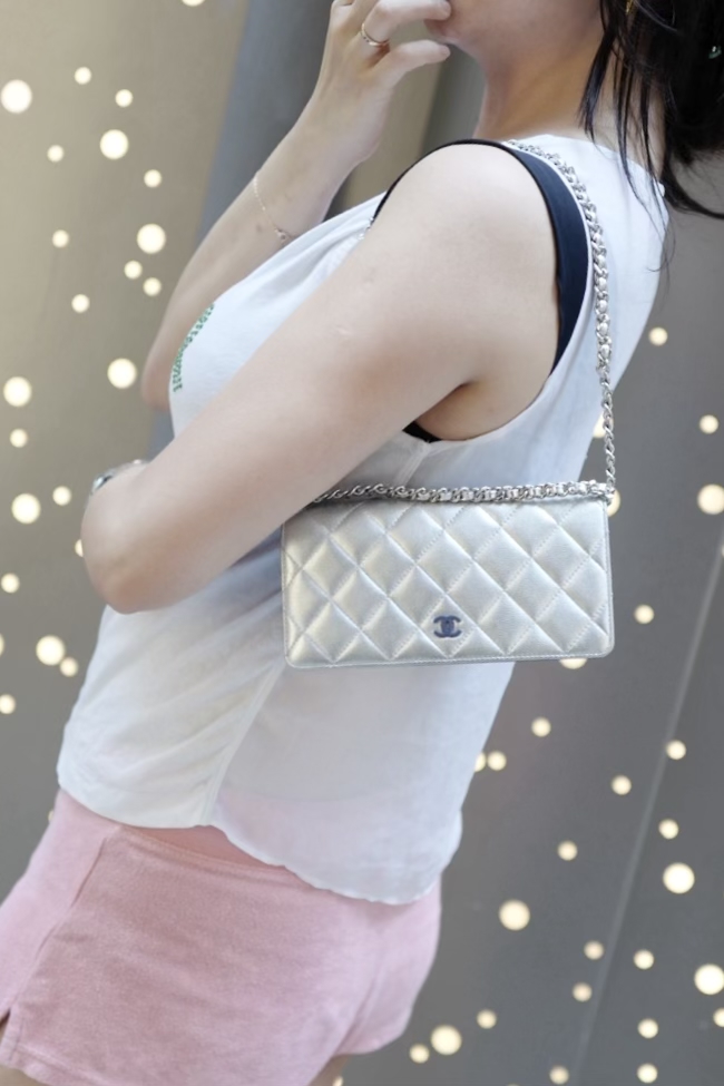 翻親都秒售嘅改裝款 cc銀色皮藍色扣🖤長銀包❤️超特別超靚勁新淨 16字頭有貼有盒 數字清晰可見♥️保存超新淨 👑 改裝的 🌸原裝冇鏈❤️ 免費安裝埋可變Woc扣同沒品牌長鏈俾你加上去當woc用 (安裝不傷皮革可拆除) 超美品chanel silver leather long wallet 配件:貼/盒 免費改裝成袋用扣/沒品牌長鏈一條(見尾圖) Item has been modified, free non branded chain/non brand hook (see photo ) (以上是免費贈送原裝並沒有全部可隨意拆除不傷皮革) Dimensions:19x10x2cm 狀態:外觀98新/内98新 ❤️本店為香港零售管理協會會員/門市已開業9年連續多年正版正貨商戶2025編號001176 付款方法:VISA / MASTER / AE / 銀聯 / UNION PAY /現金 /alipay ❤️另提供 AE 信用卡12個月免息分期 /恆生信用卡12個月免息分期/hsbc 12個月免息分期/渣打12個月免息分期 📢本店只出售正版貨📢 ❤️歡迎親臨銅鑼灣門市😍 ❤️ 本門市已搬到銅鑼灣記利佐治街2-10號銅鑼灣地帶2樓237號鋪 Shop 237, 2/f, causeway place, 2 great george street, causeway bay 門市電話:27808868 WhatsApp :📞65230308