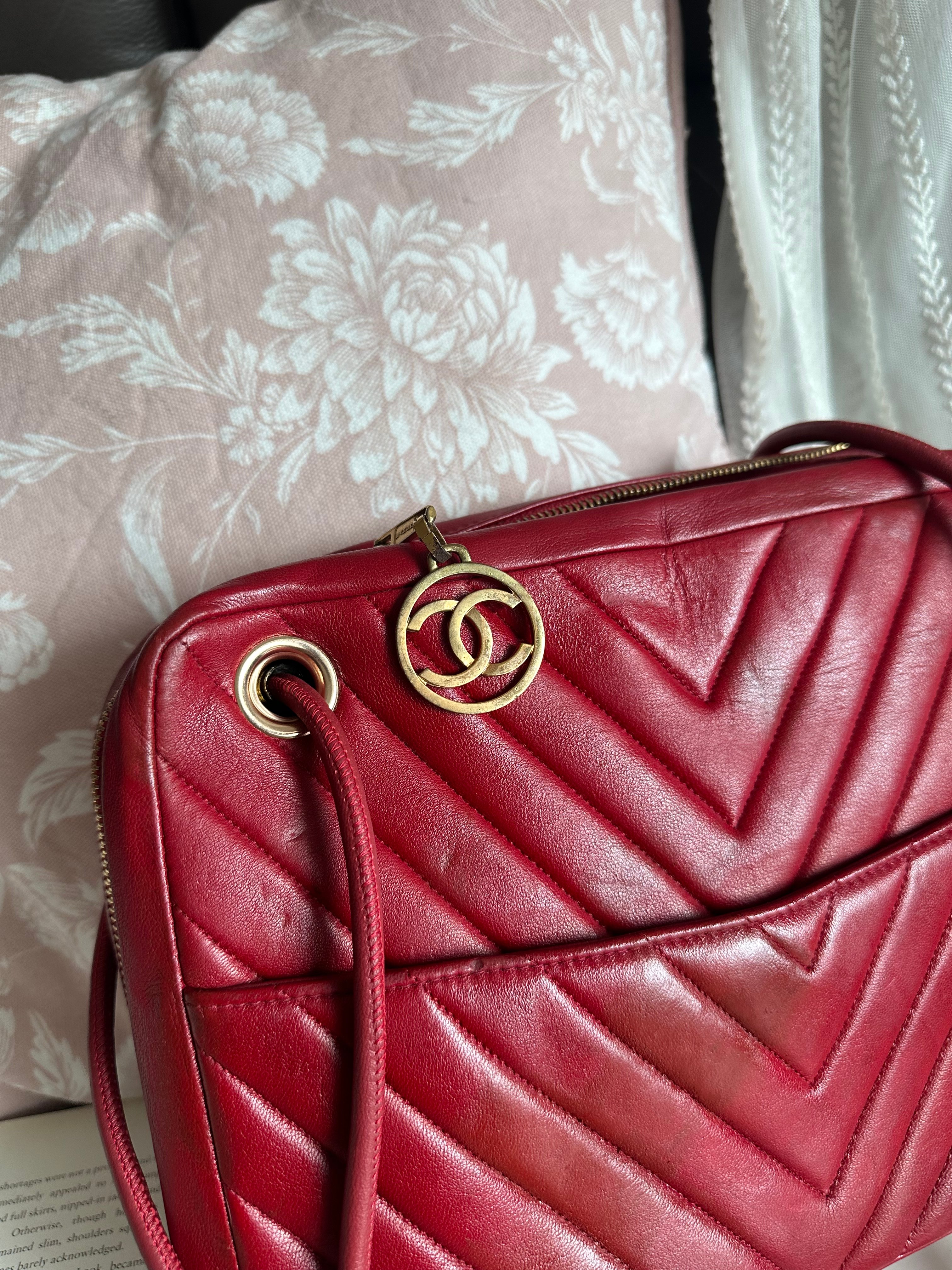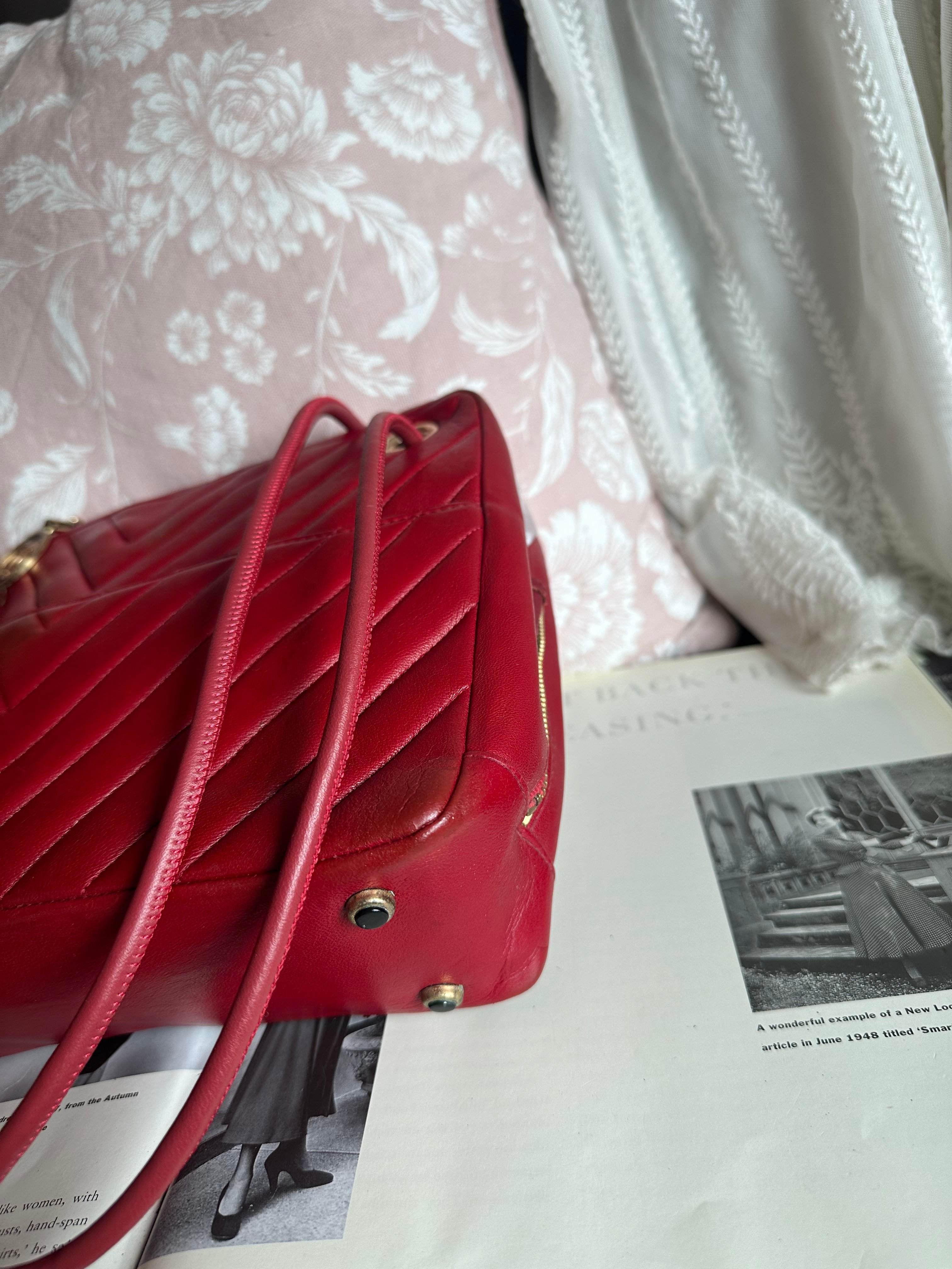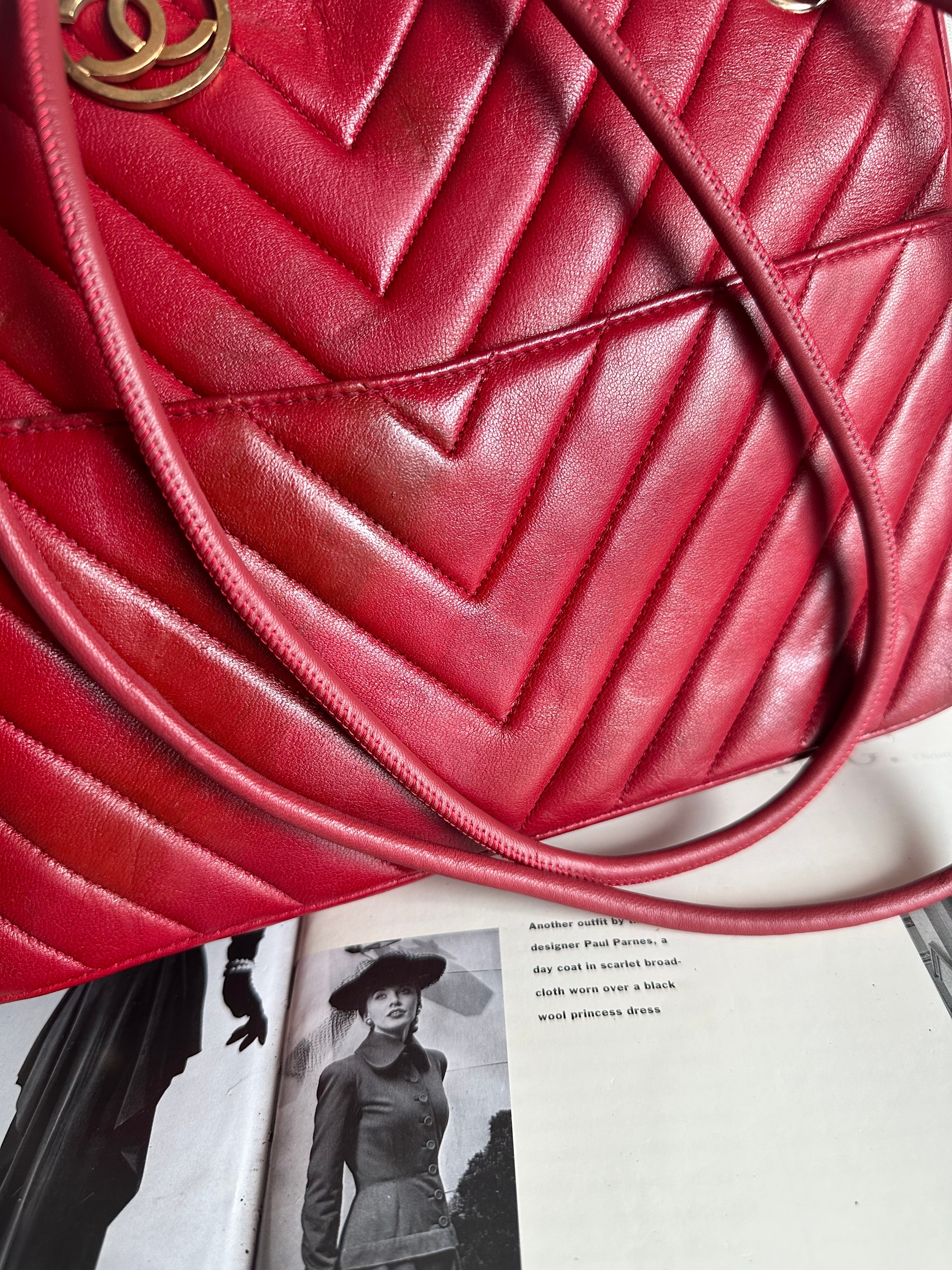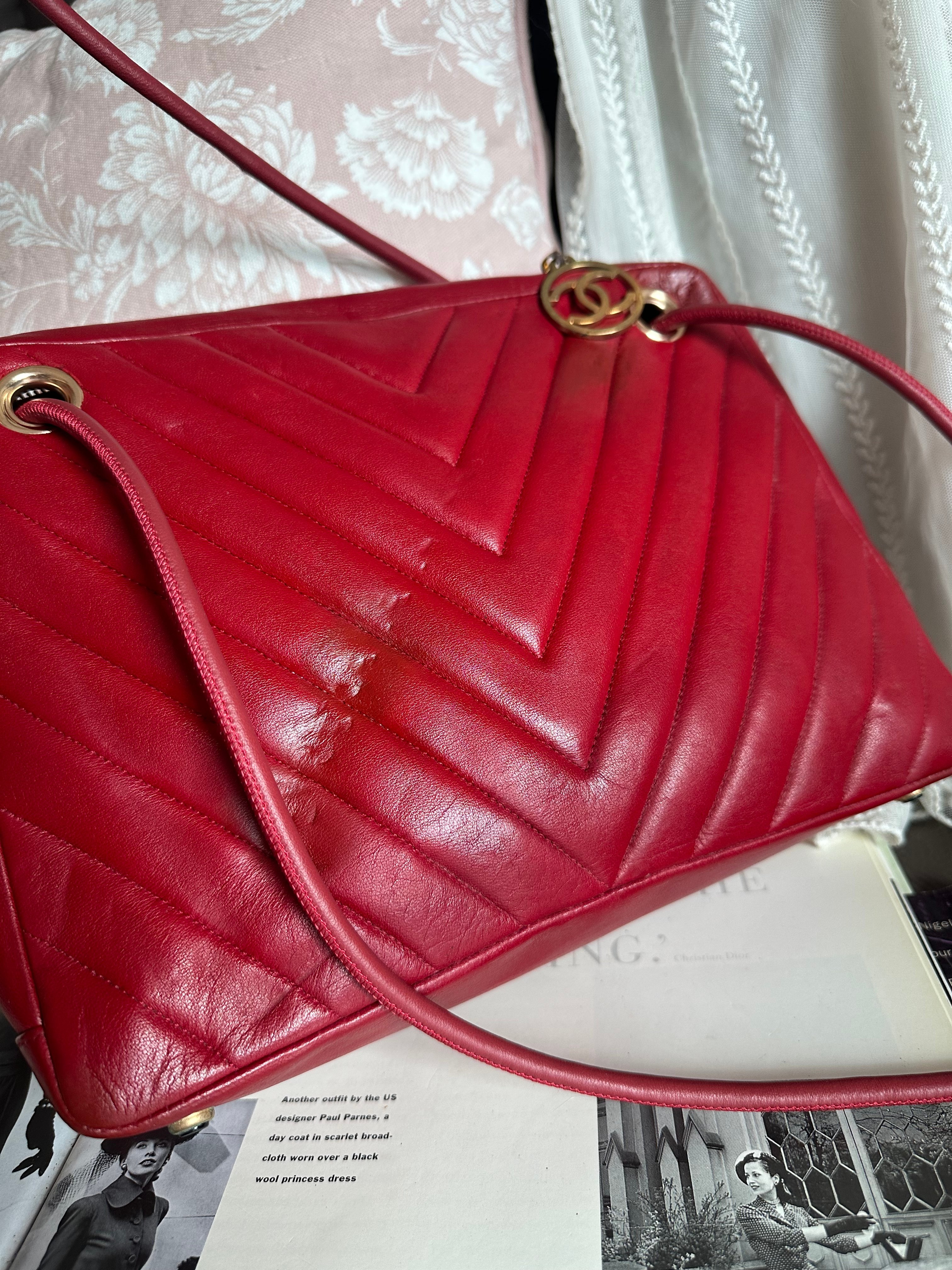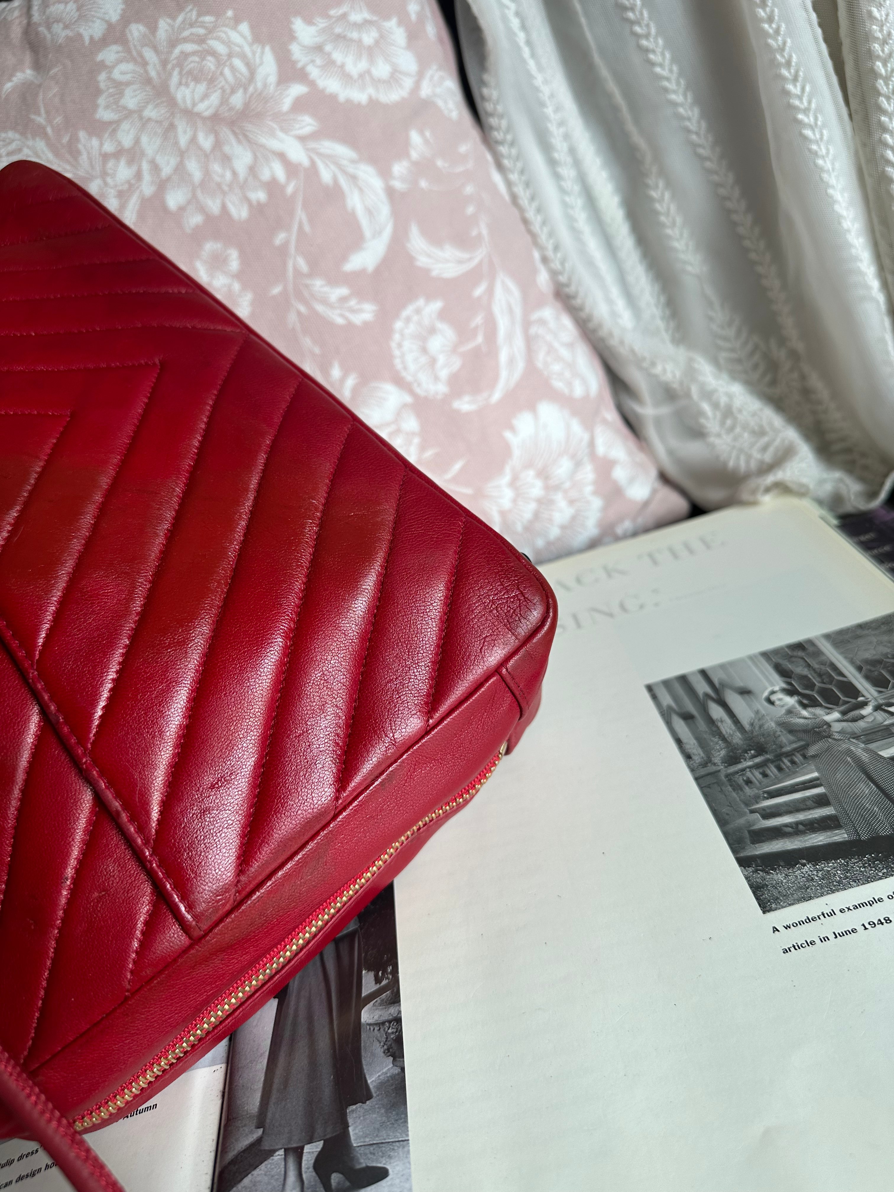 vintage chanel 1991年V-Stitch chevron shoulder bag red lambskin leather shoulder bag /crossbody bag