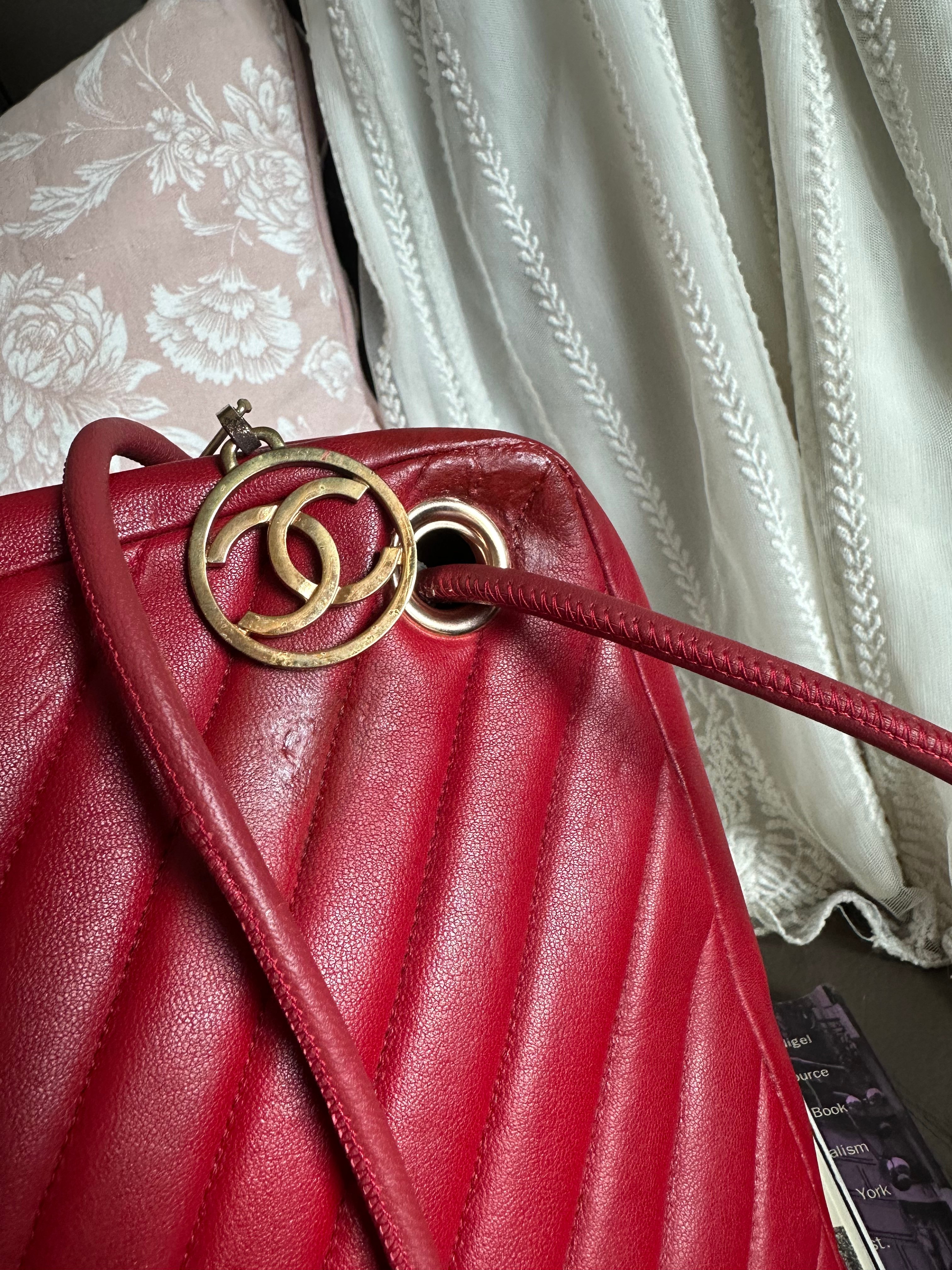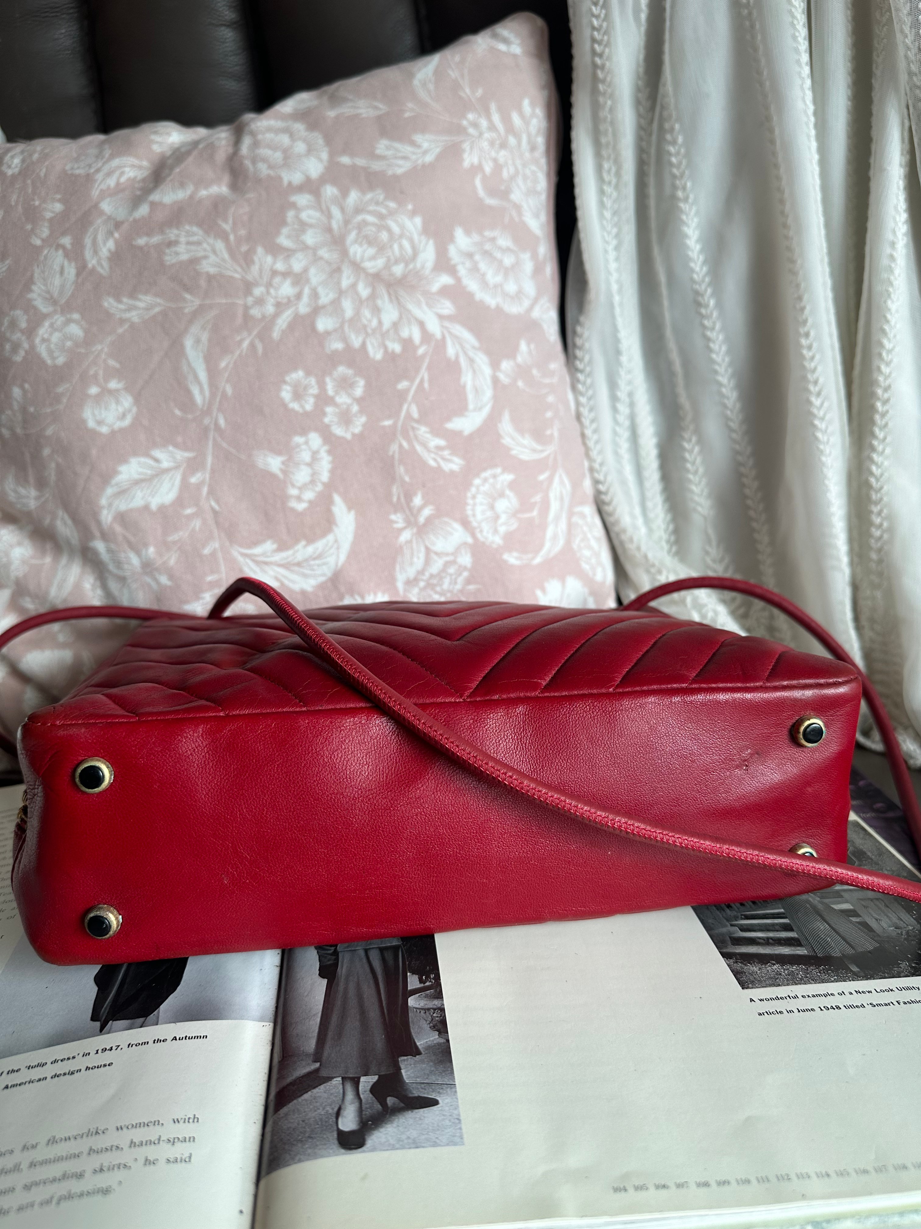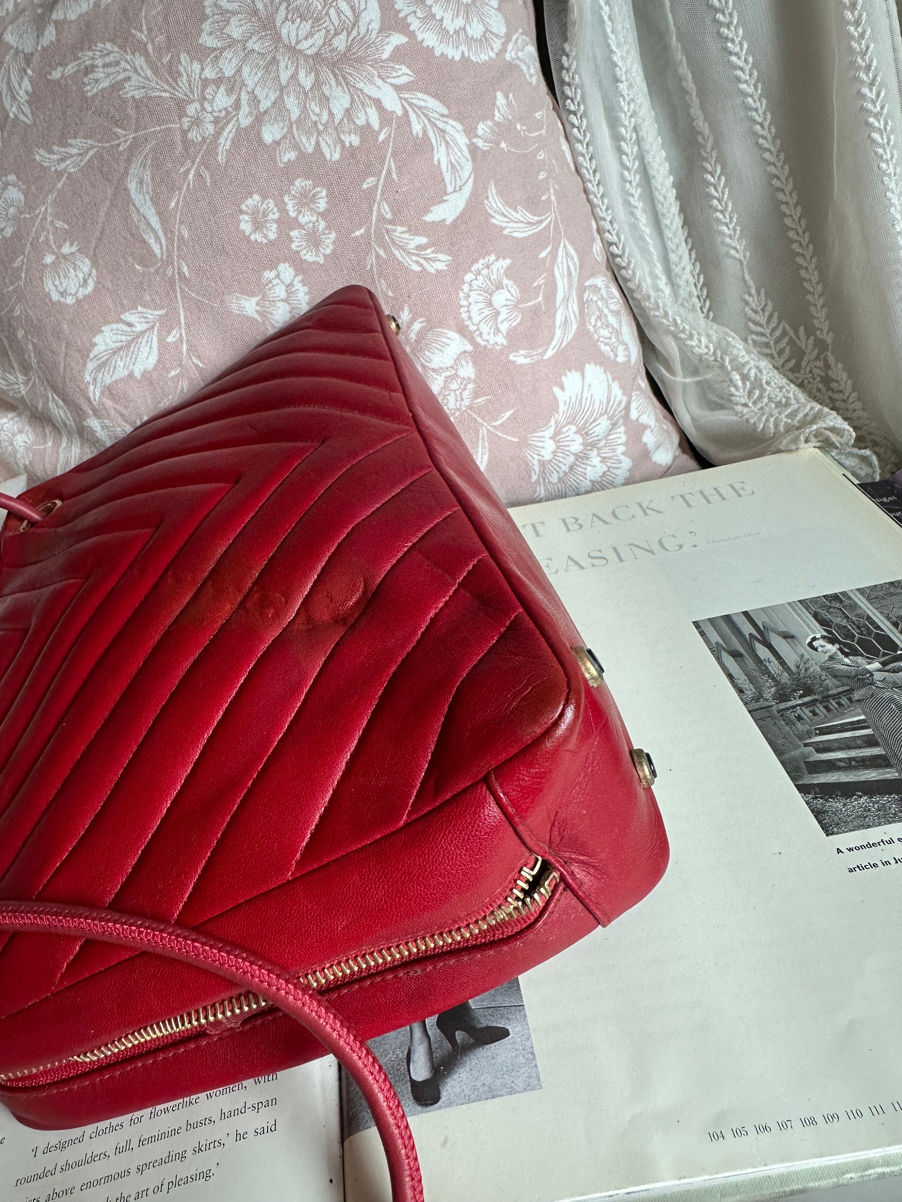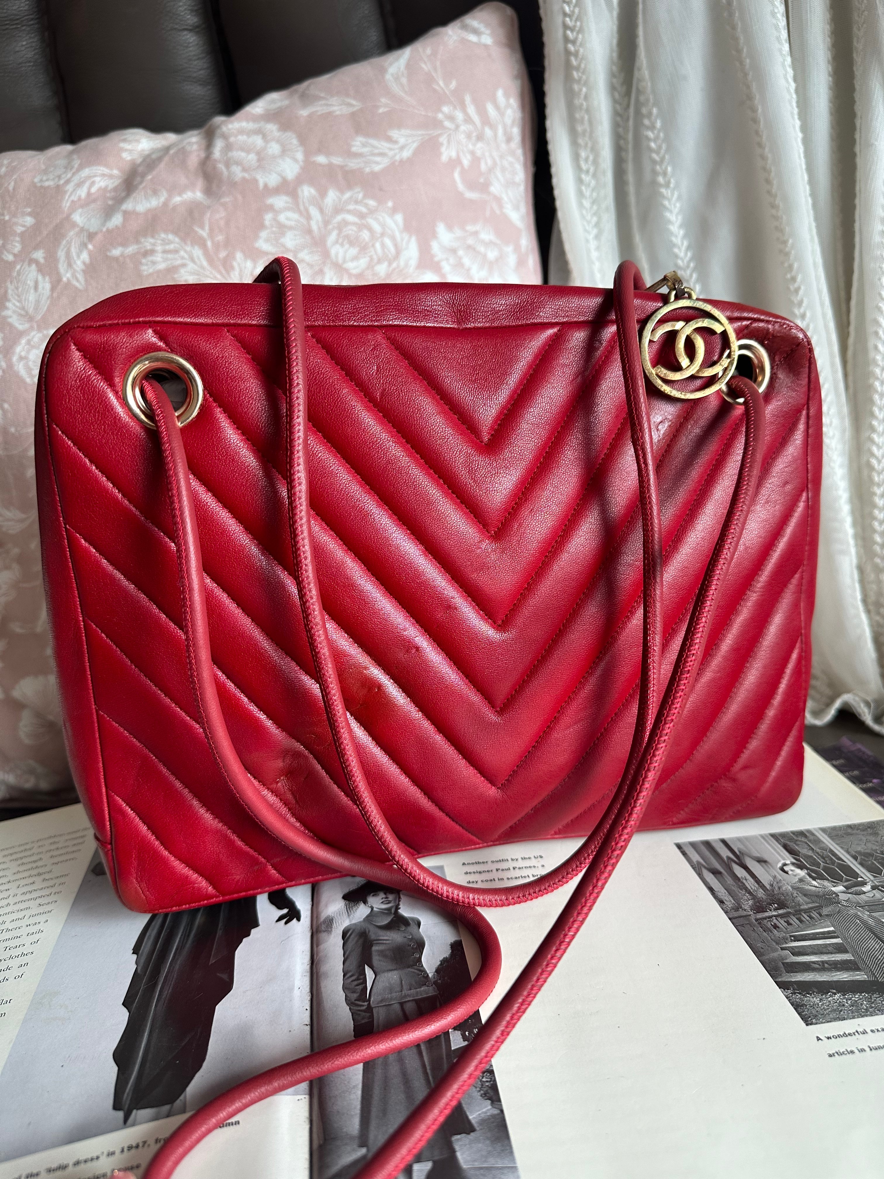 vintage chanel 1991年V-Stitch chevron shoulder bag red lambskin leather shoulder bag /crossbody bag