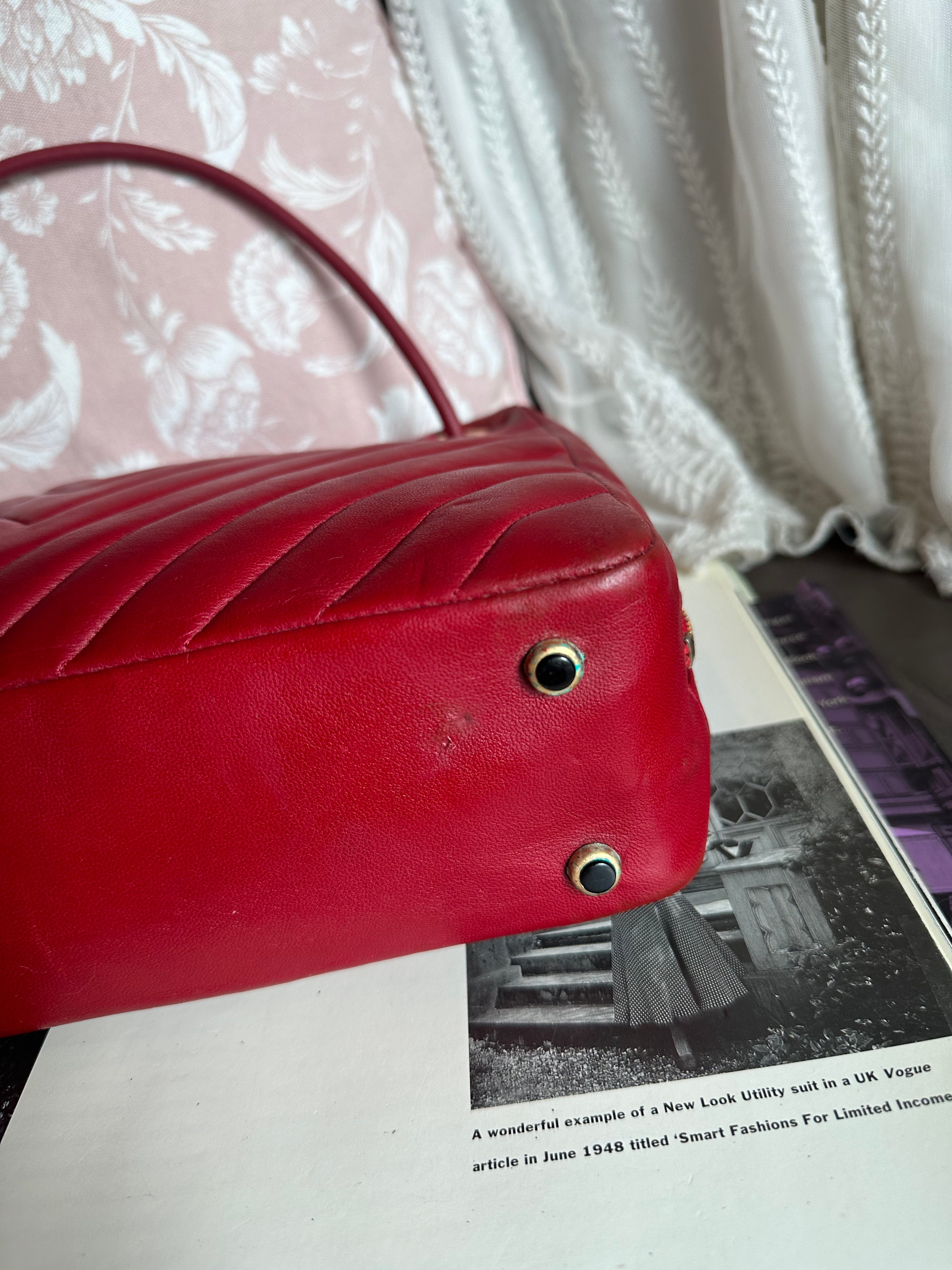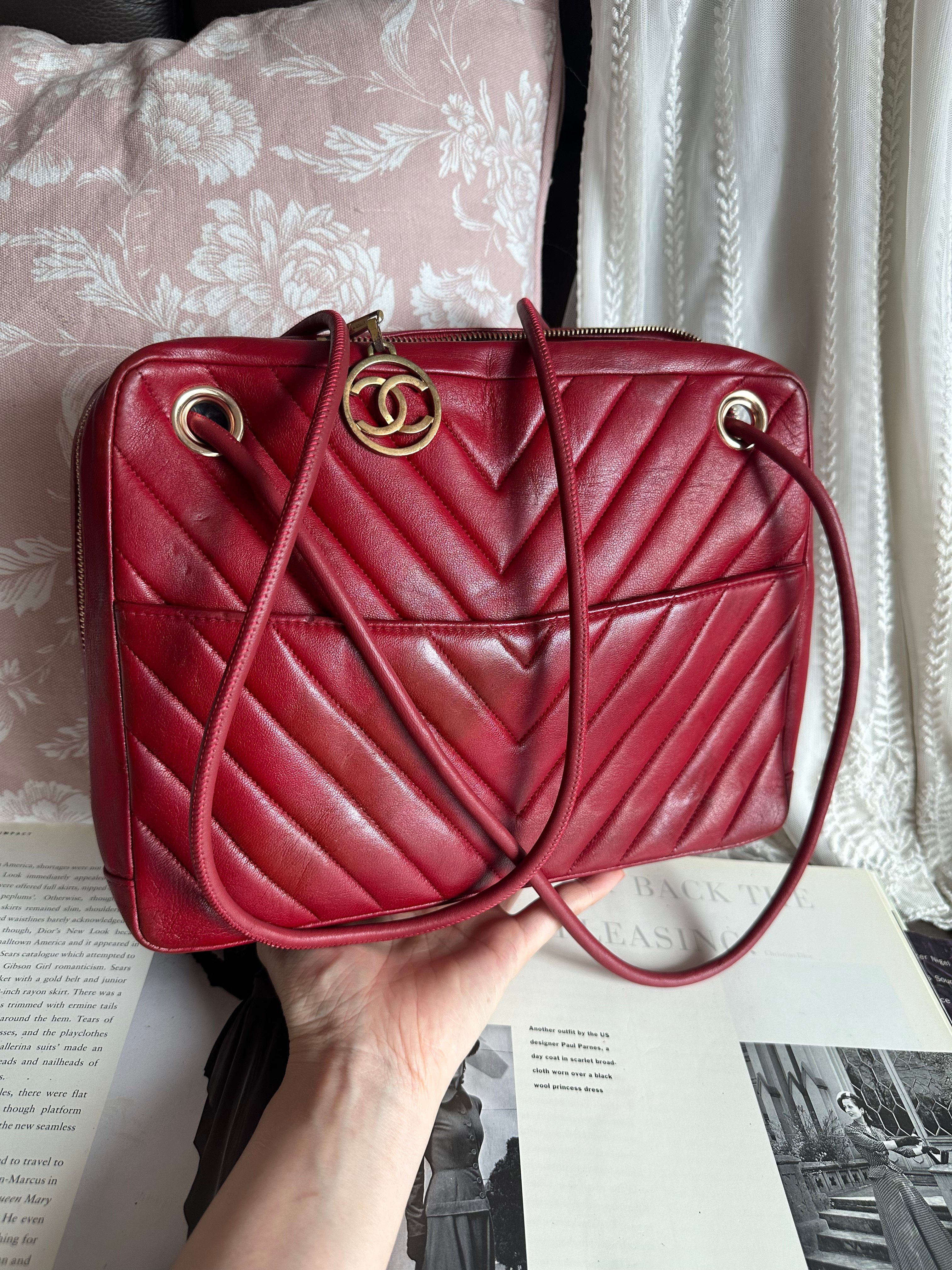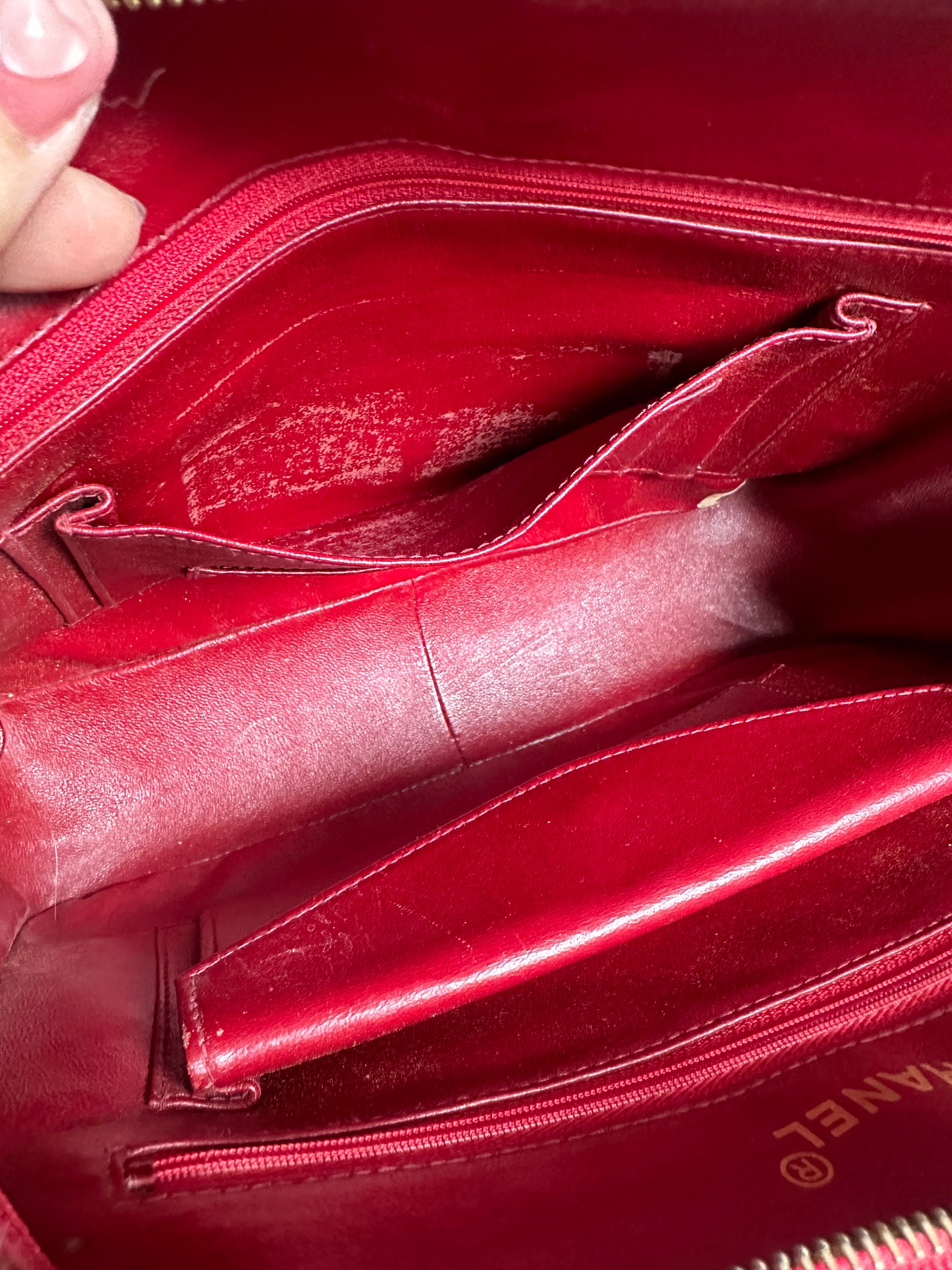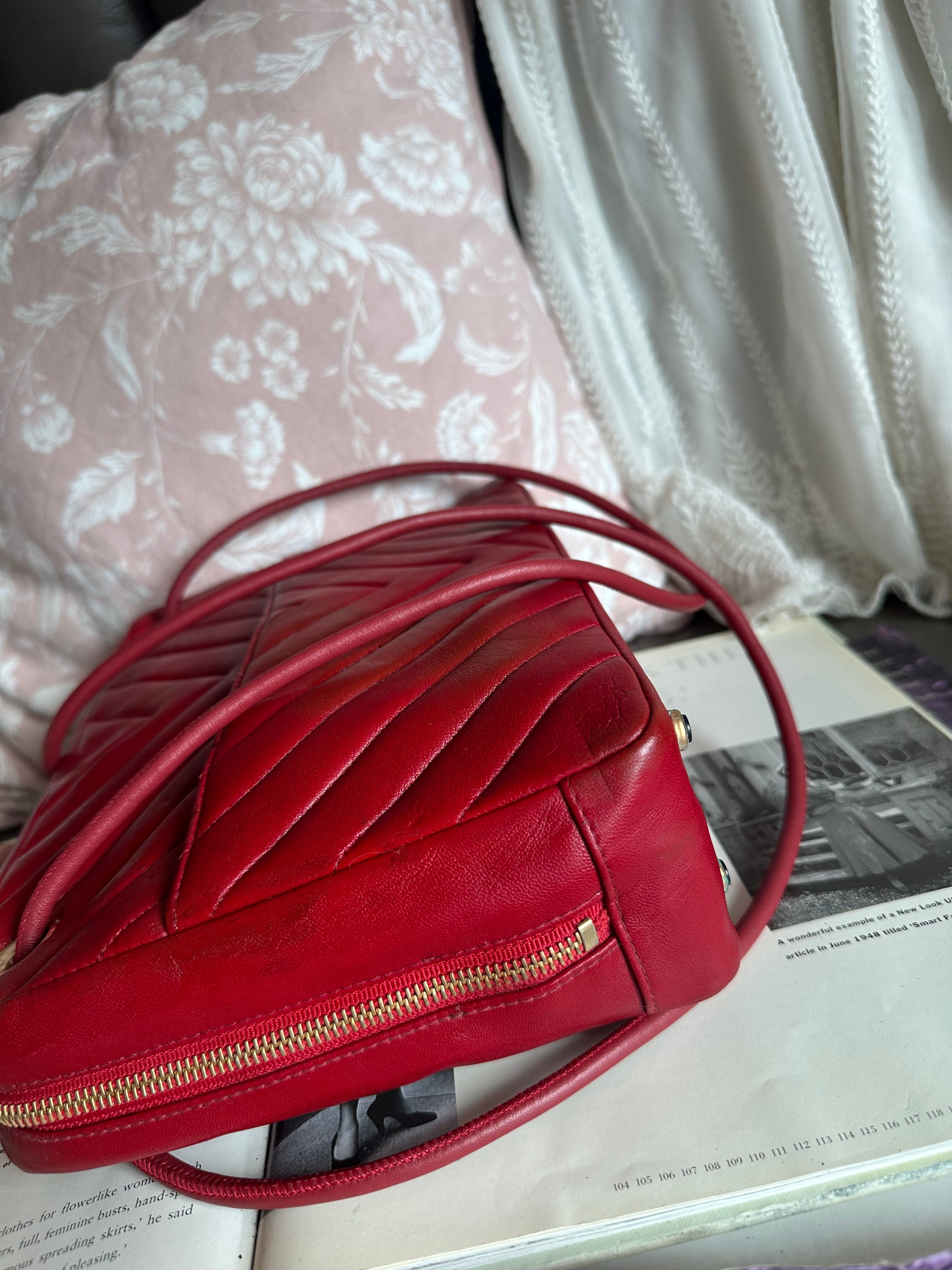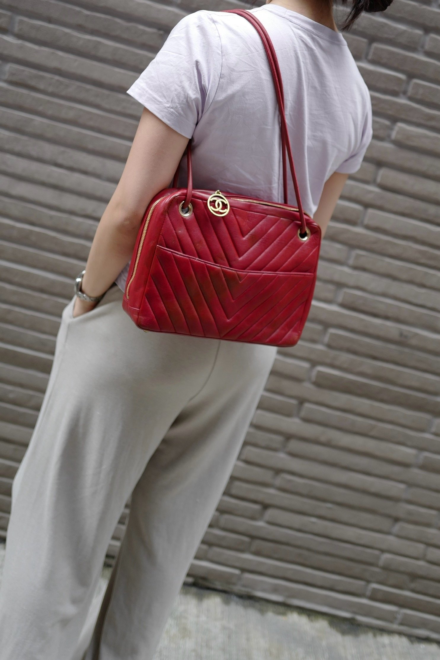 vintage chanel 1991年V-Stitch chevron shoulder bag red lambskin leather shoulder bag /crossbody bag