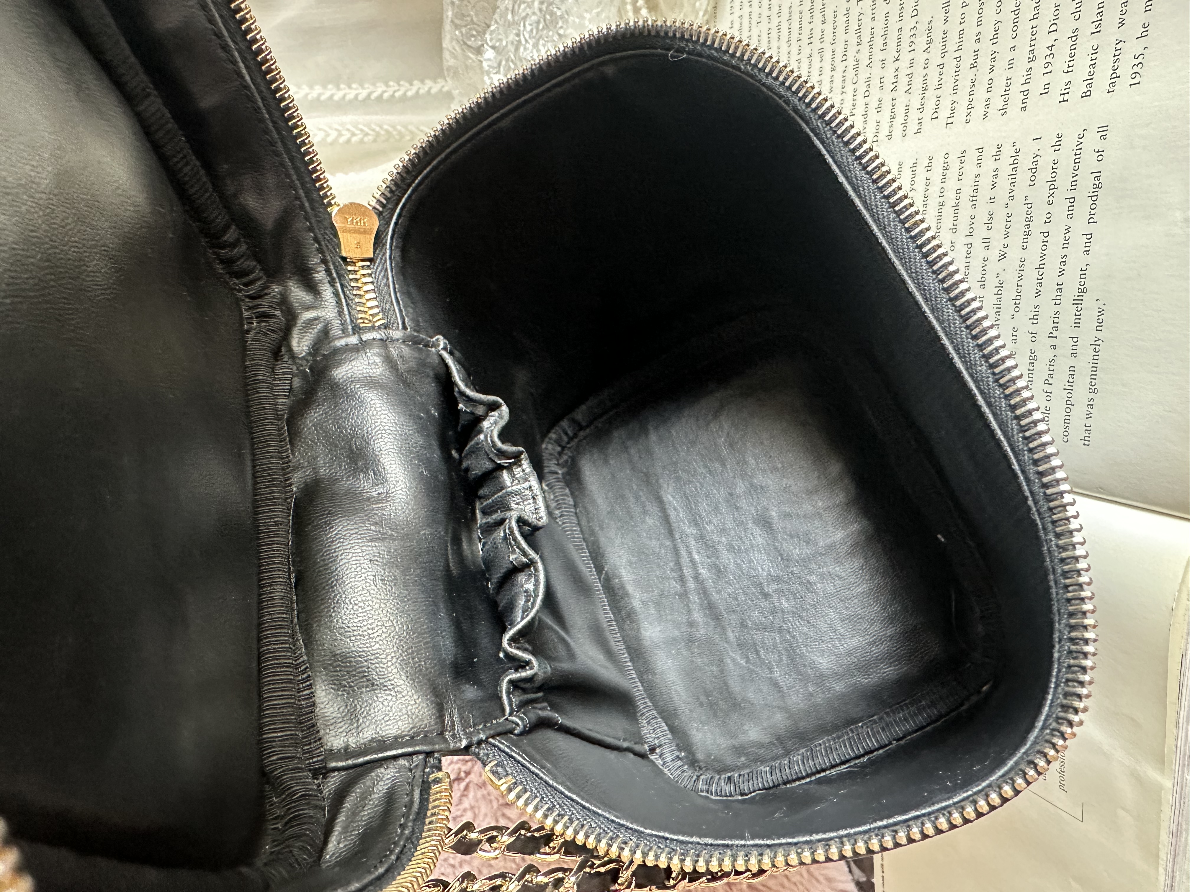 超大熱中古vintage cc vanity 黑色荔枝皮 改裝的❤️後加左沒品牌鏈同扣 即刻可以單鏈同雙鏈斜咩或做腋下包用 容量多放到長銀包同電話 💙 超平帶走🌸 vintage chanel black caviar vanity bag Dimensions:17x15x13 配件:貼 (己模糊) 狀態:外觀90新/内90新 (拉鍊頭己更換 ) 送可改裝成袋用扣一對/送冇品牌長鏈一條 以上是免費贈送原裝並沒有/ Item has been modified, installed non branded hook and non branded chain (全部可隨意拆除) vintage chanel black caviar vanity case Dimemsions: 17x15x13cm Accessories :serial seal (not clear) Condition:very good Item has been modified, installed non branded hook and non branded chain ❤️本店為香港零售管理協會會員/門市已開業9年連續多年正版正貨商戶2025編號 1176 付款方法:VISA / MASTER / AE / 銀聯 / UNION PAY /現金 /alipay ❤️另提供 AE 信用卡12個月免息分期 /恆生信用卡12個月免息分期/hsbc 12個月免息分期/渣打12個月免息分期 📢本店只出售正版貨📢 ❤️歡迎親臨銅鑼灣門市😍 ❤️ 本門市已搬到銅鑼灣記利佐治街2-10號銅鑼灣地帶2樓237號鋪 Shop 237, 2/f, causeway place, 2 great george street, causeway bay