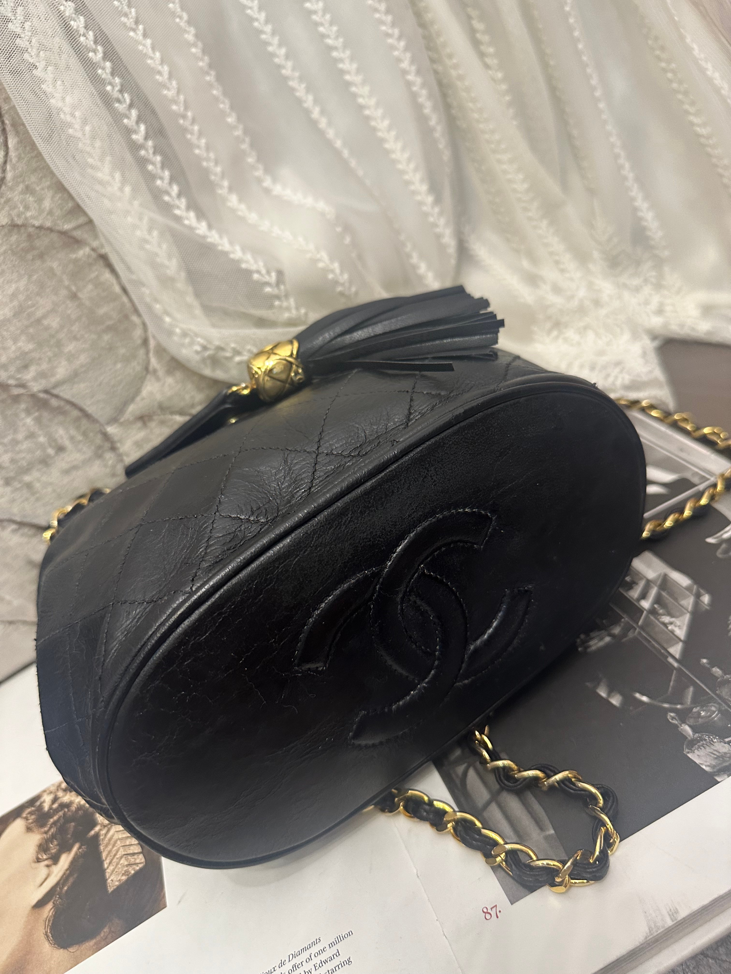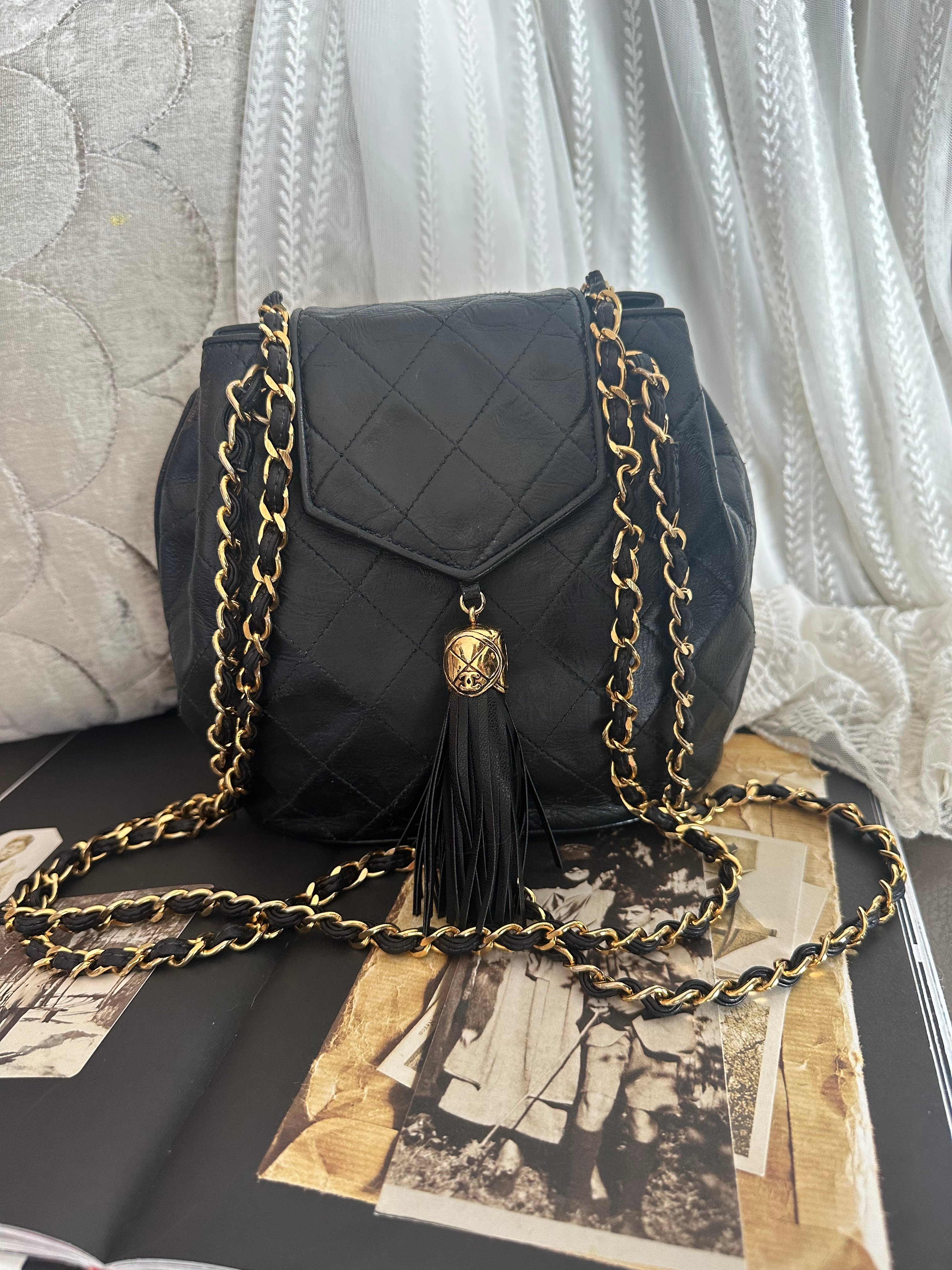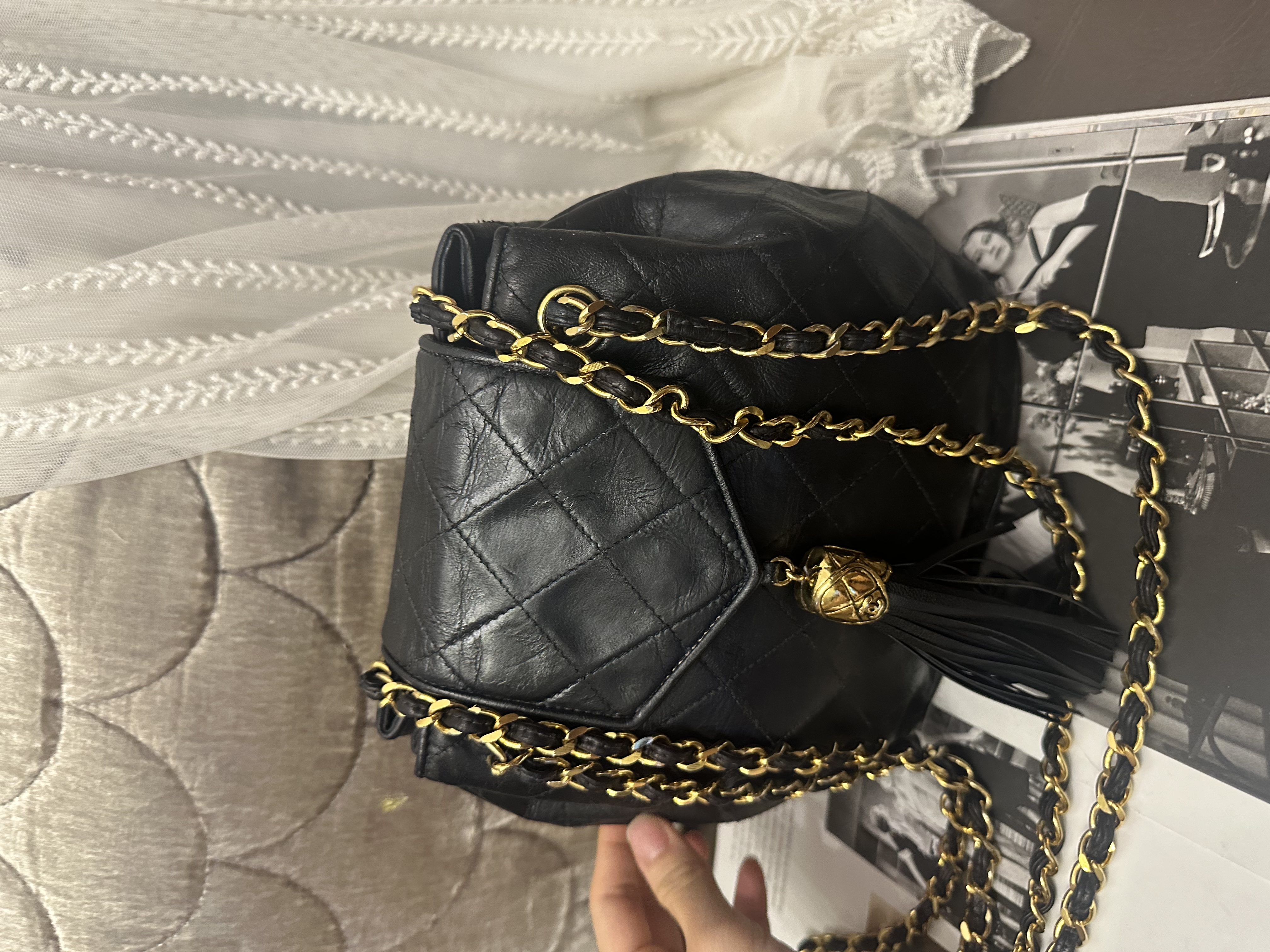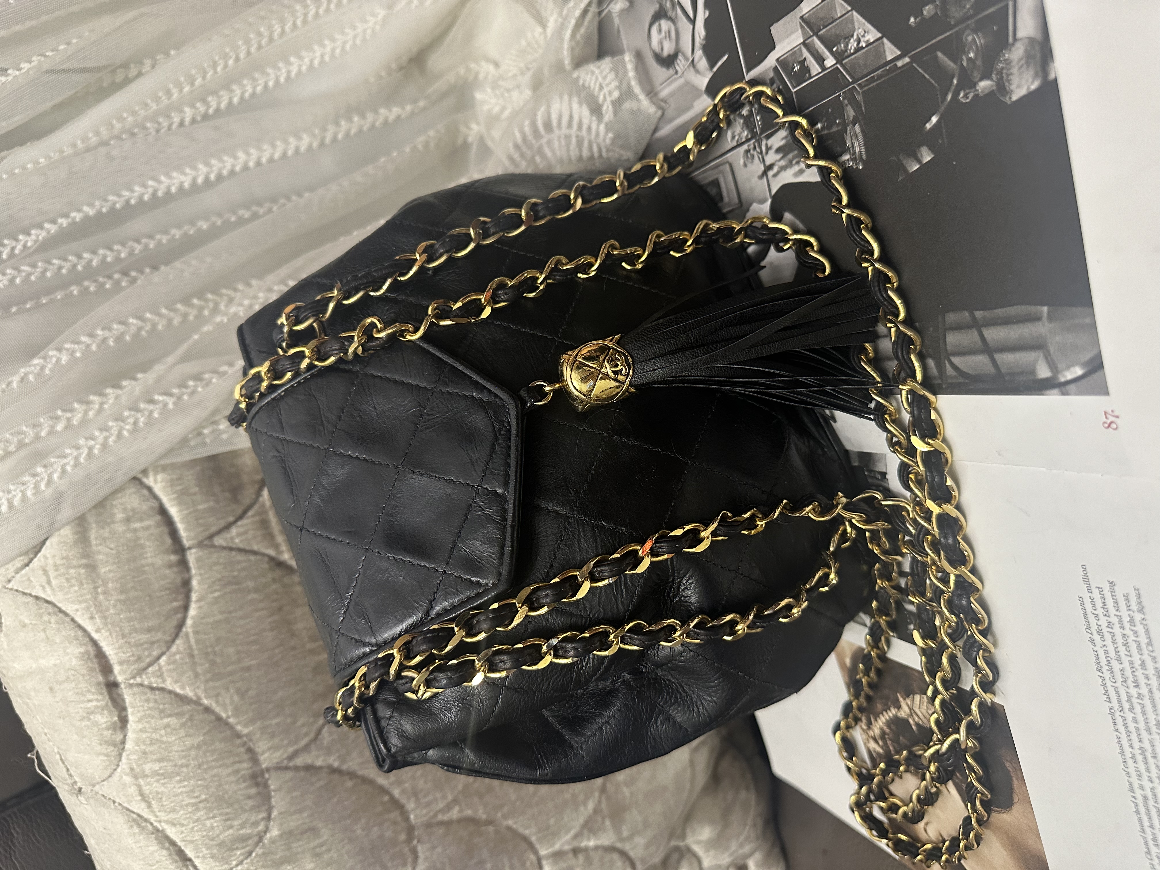 vintage chanel black leather tassel bucket chain bag