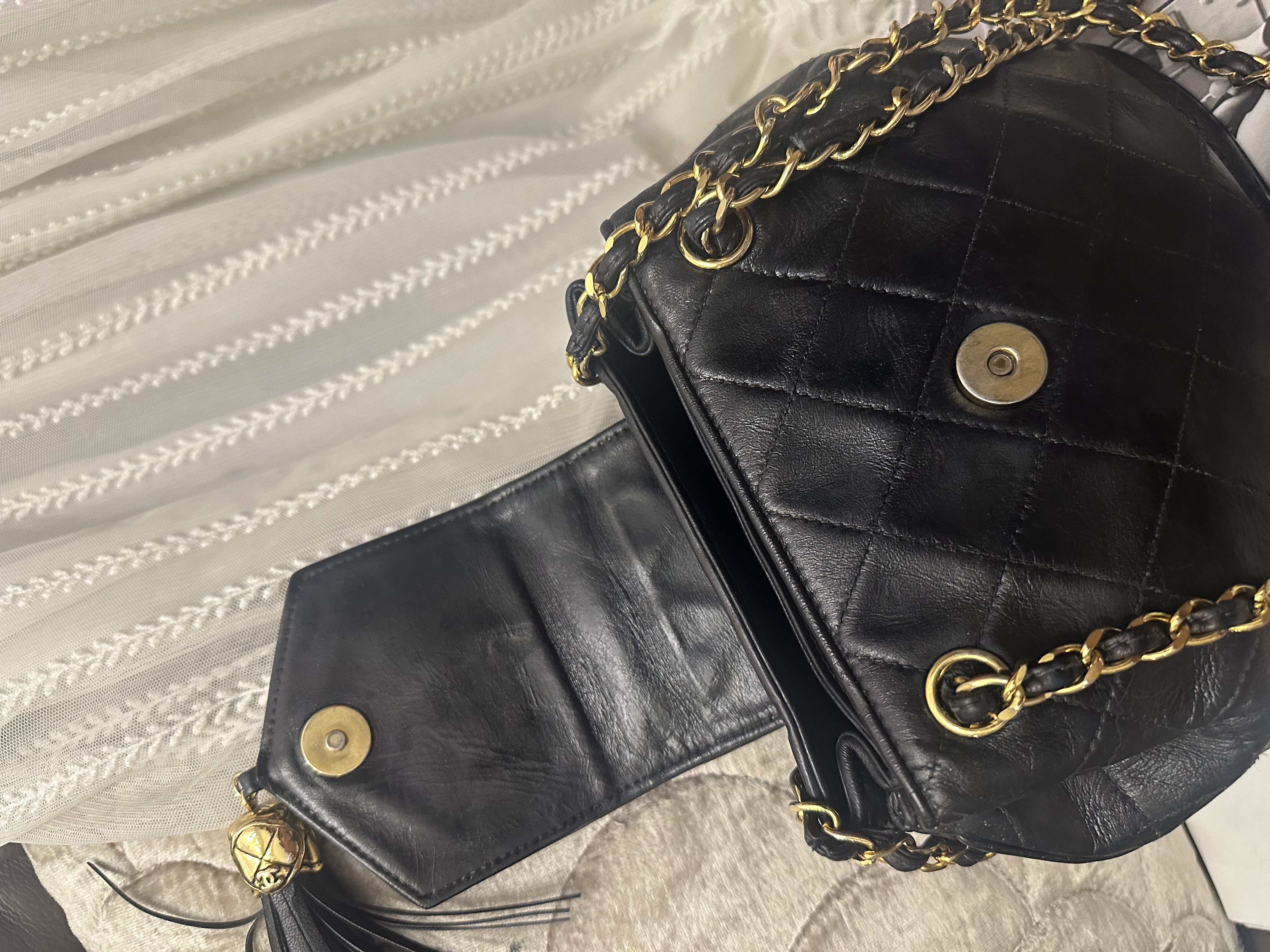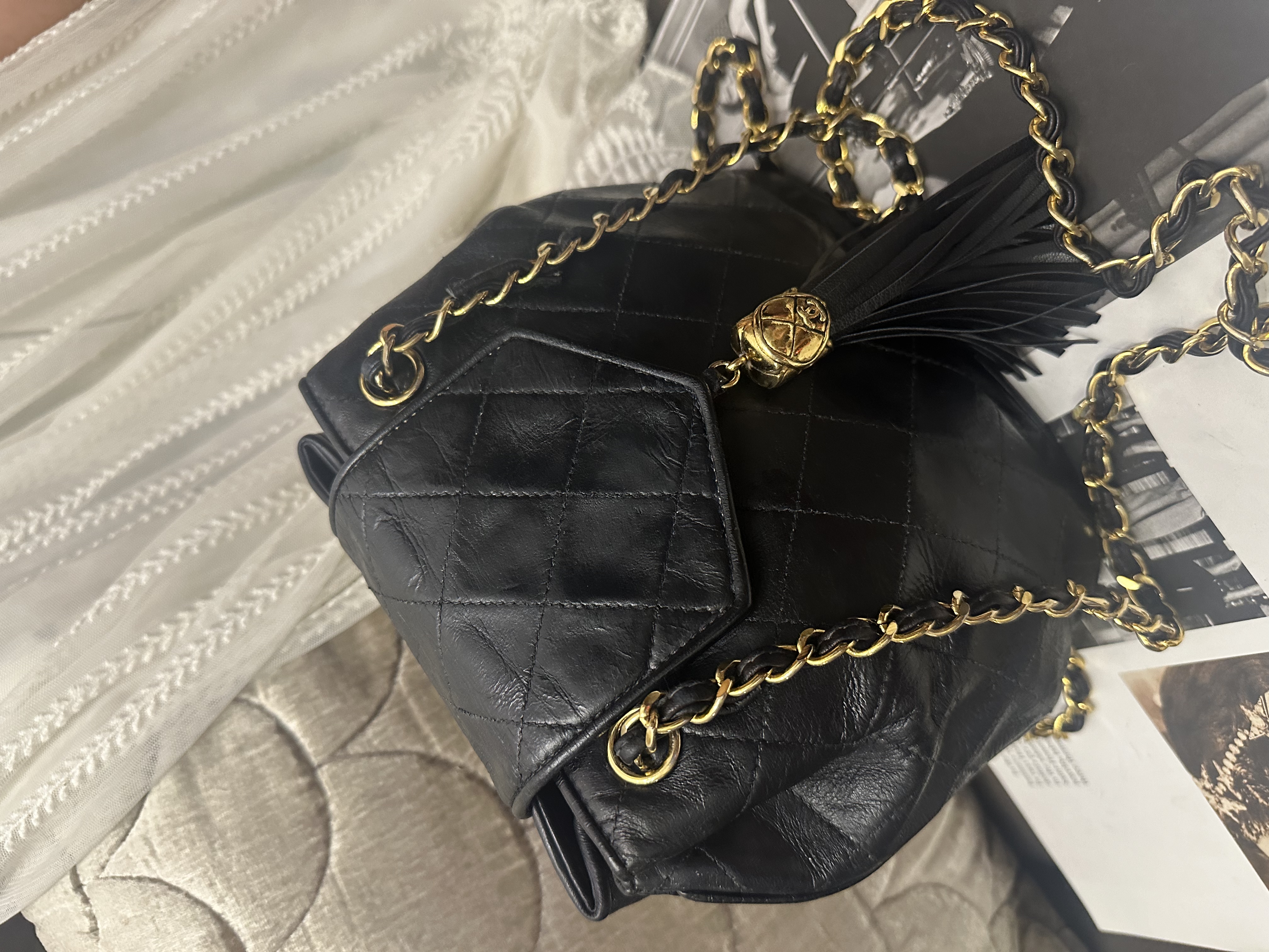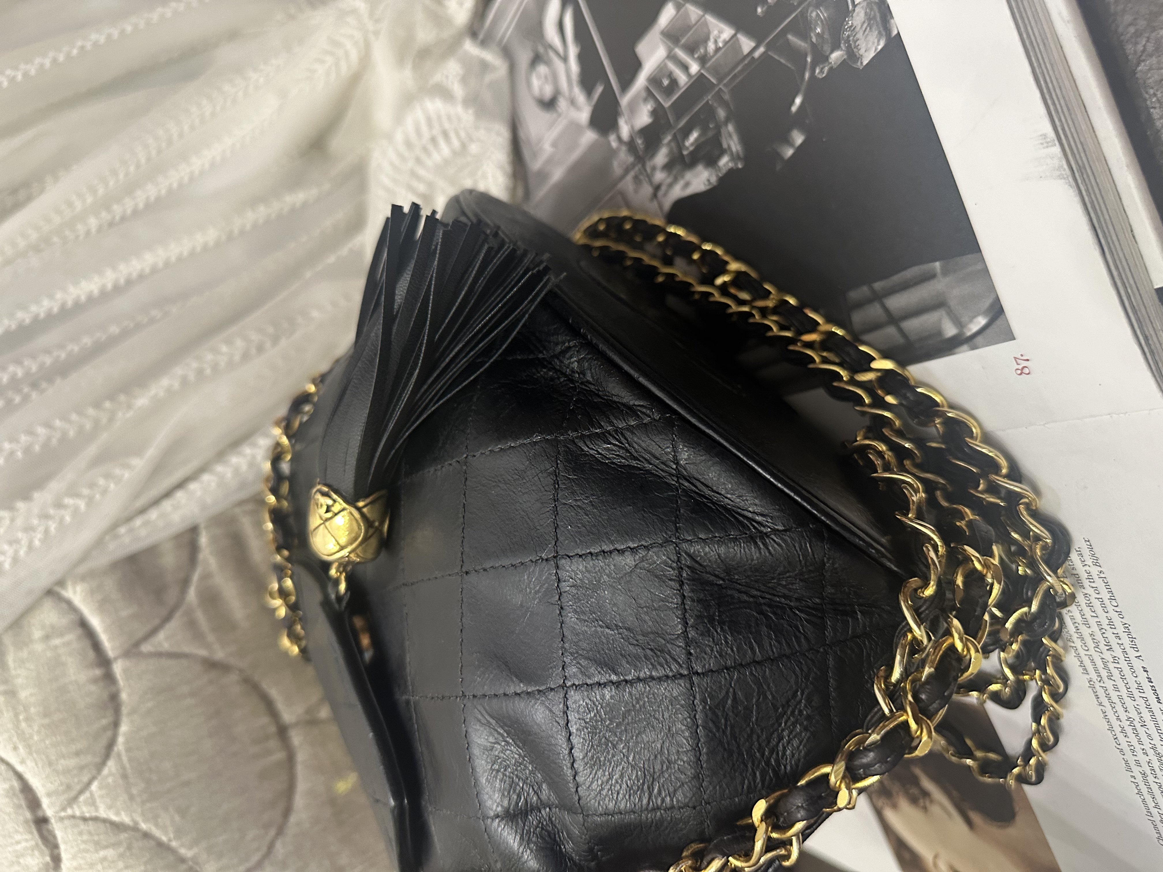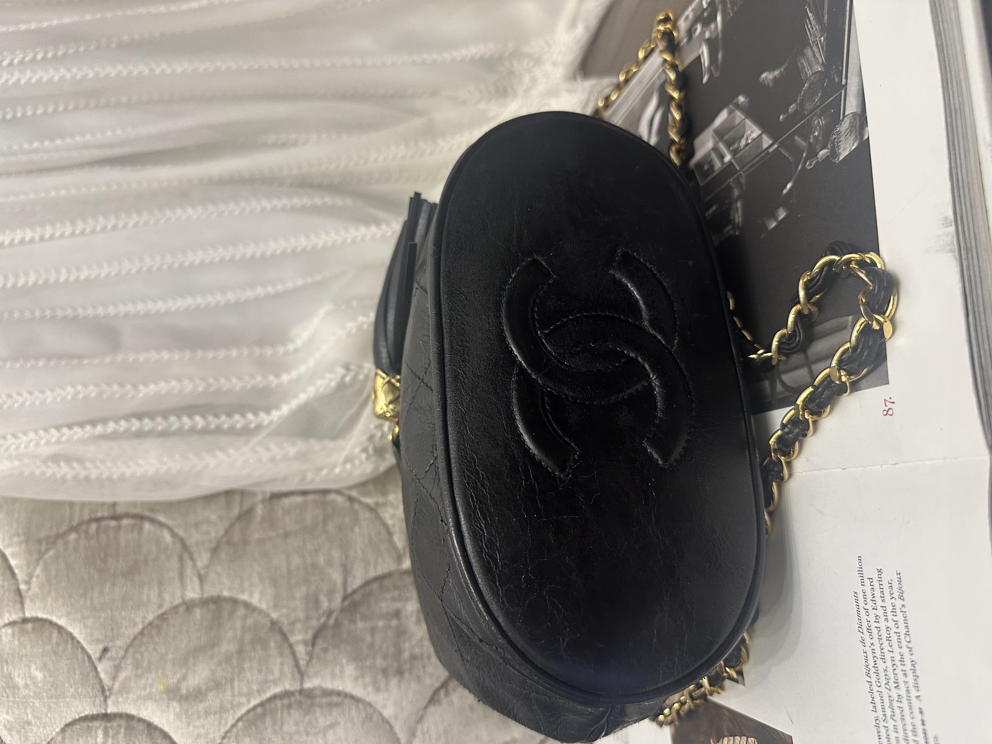 vintage chanel black leather tassel bucket chain bag