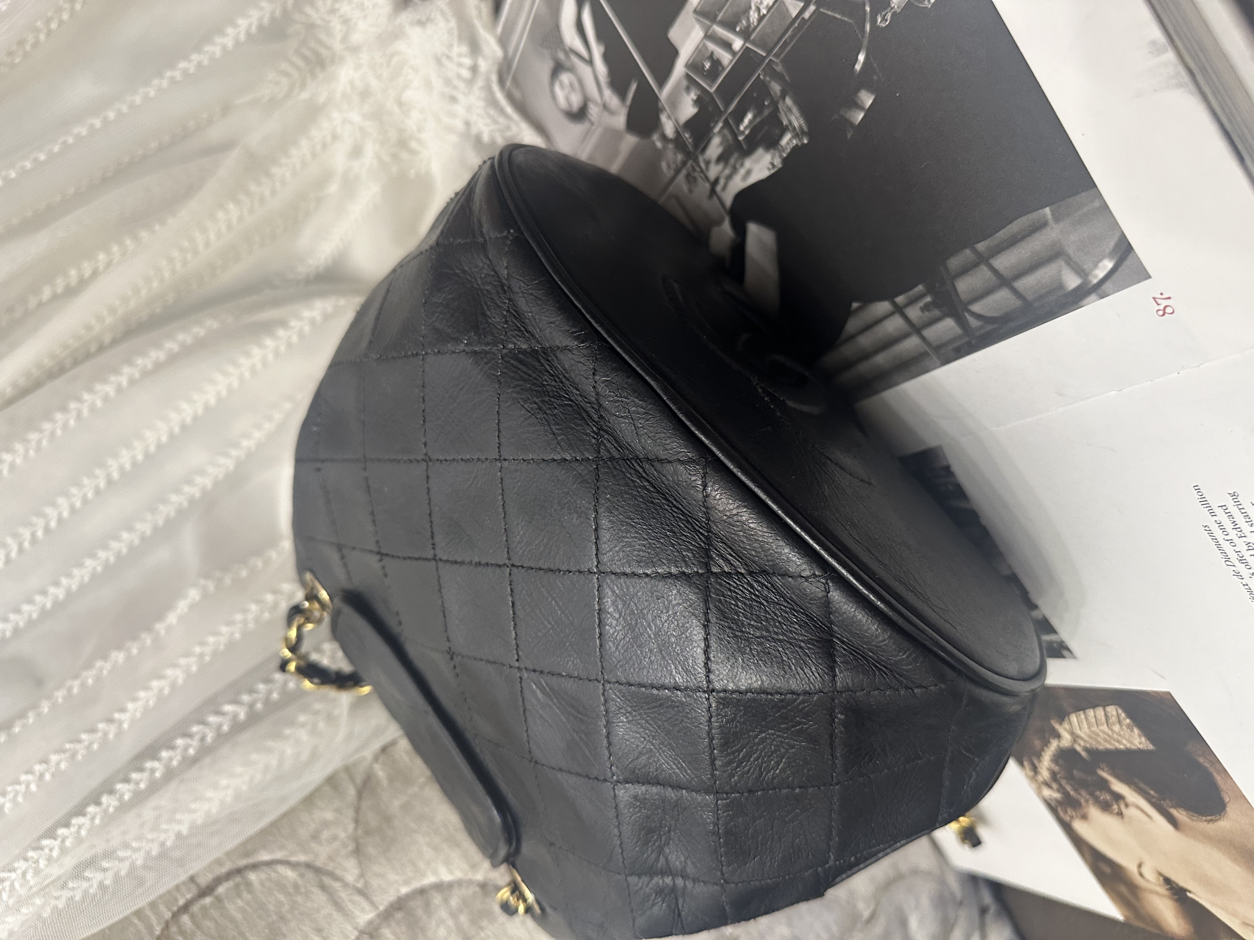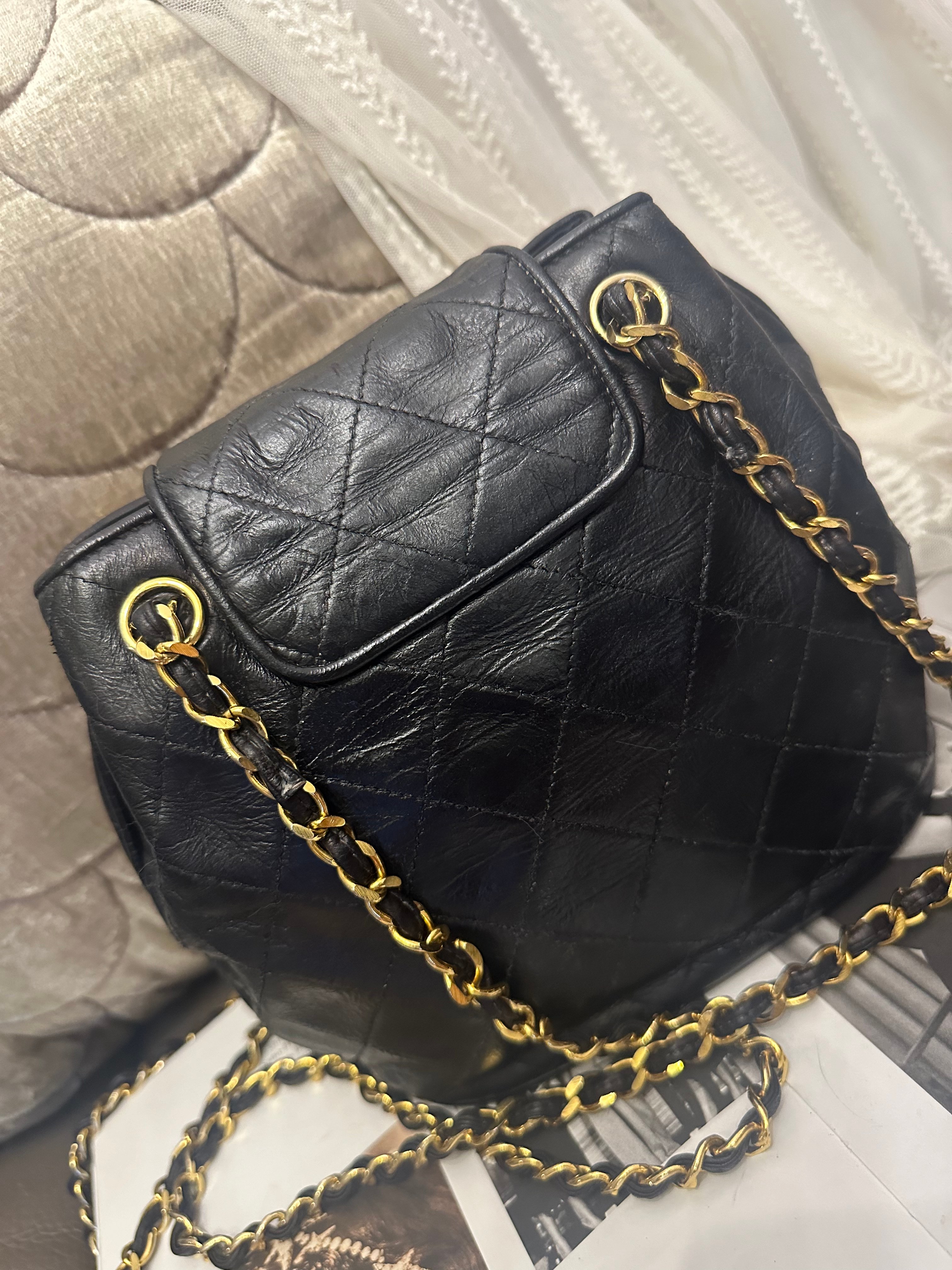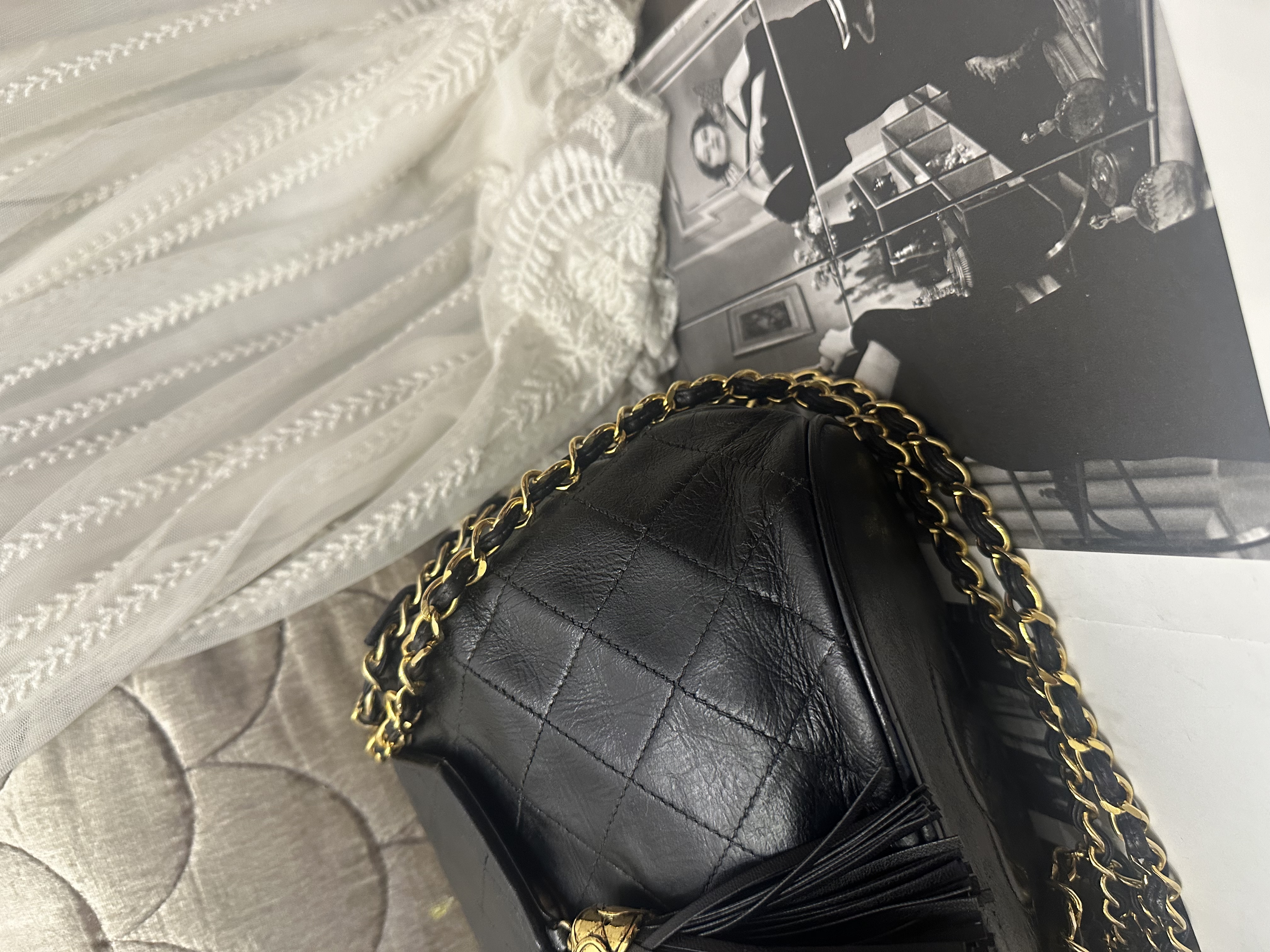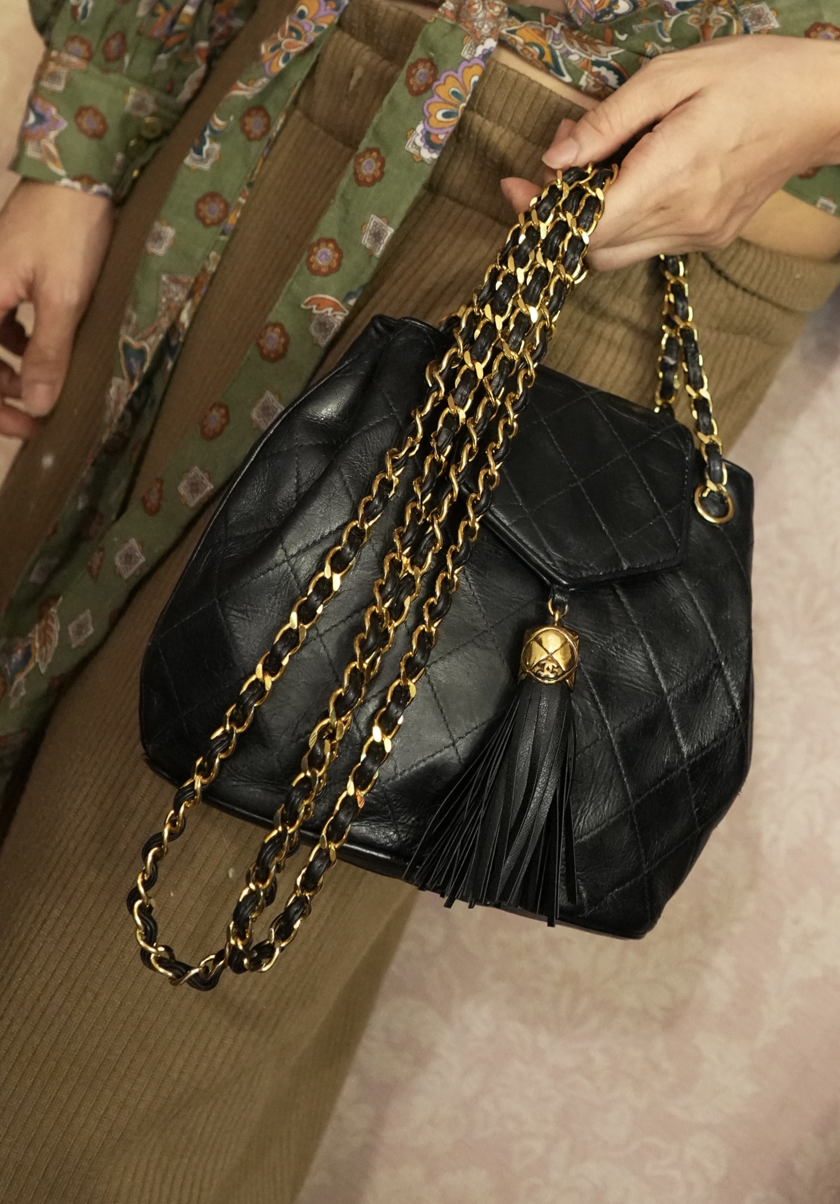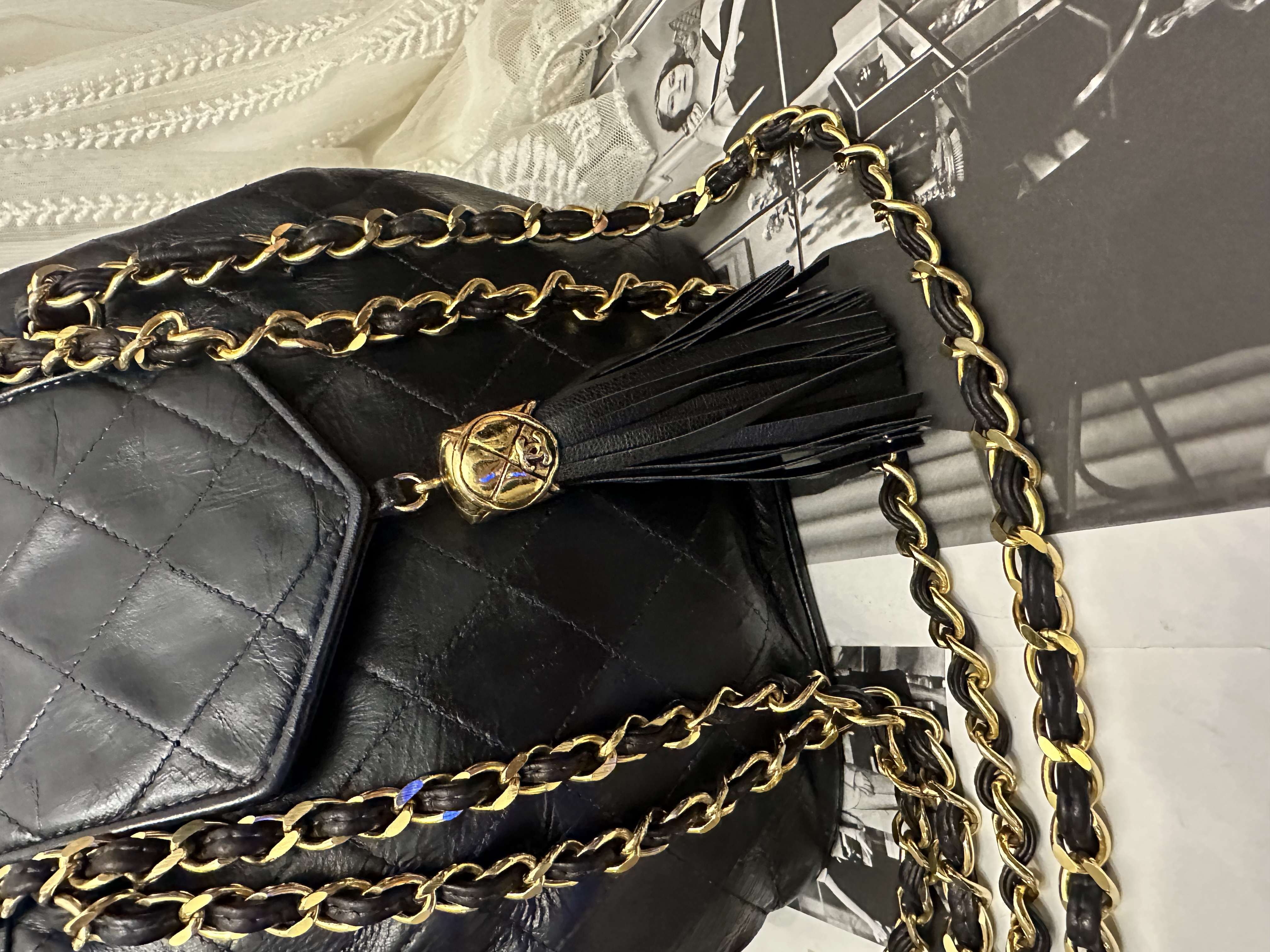 vintage chanel black leather tassel bucket chain bag